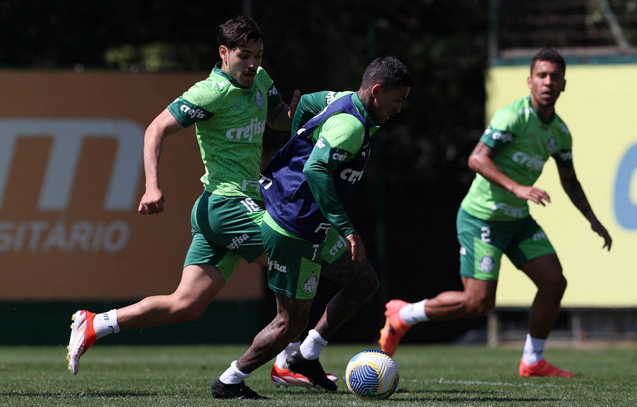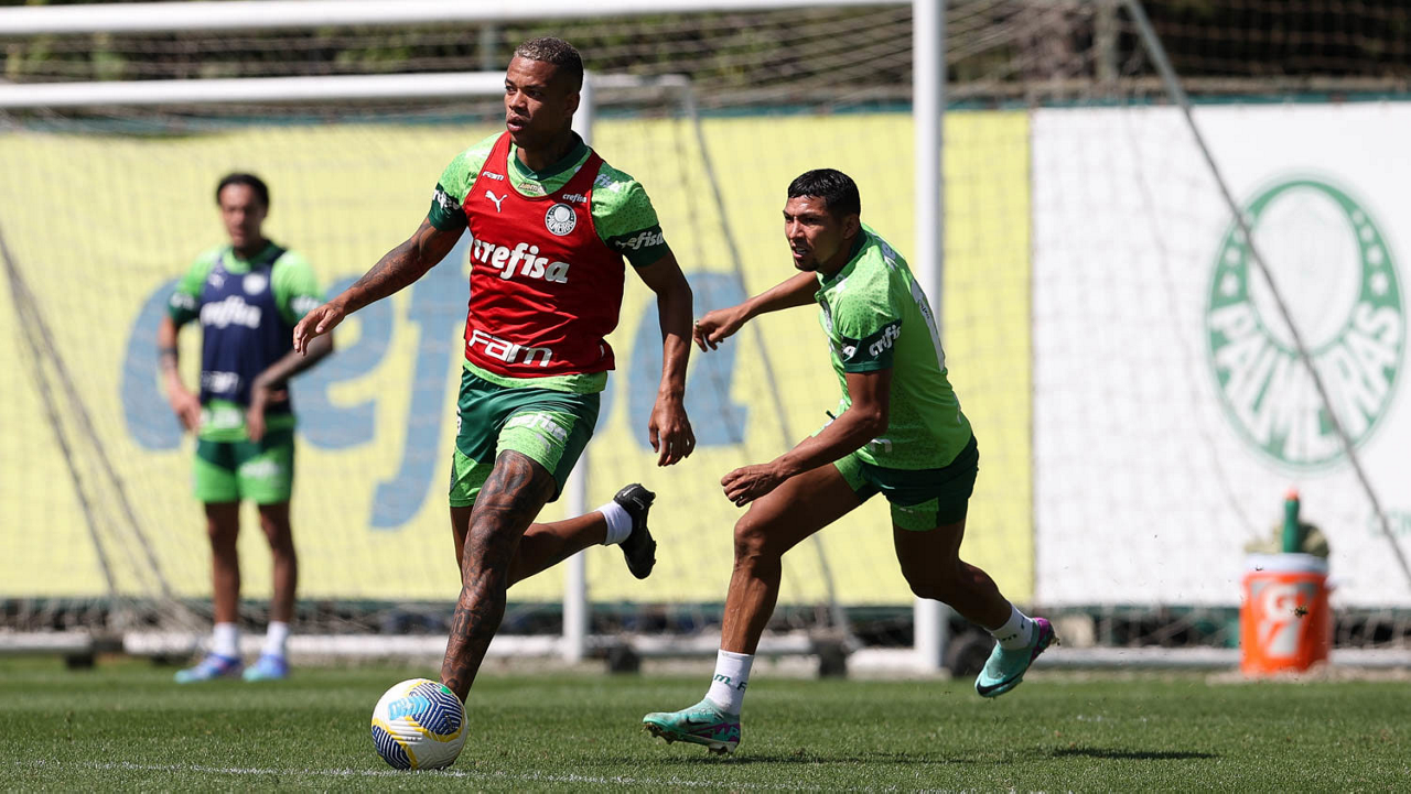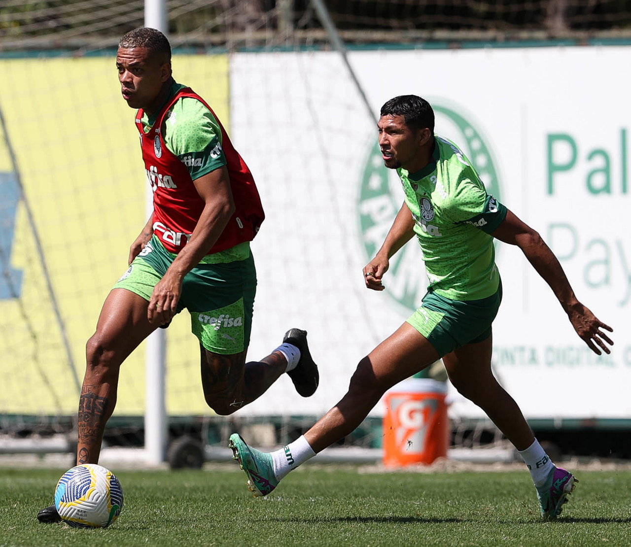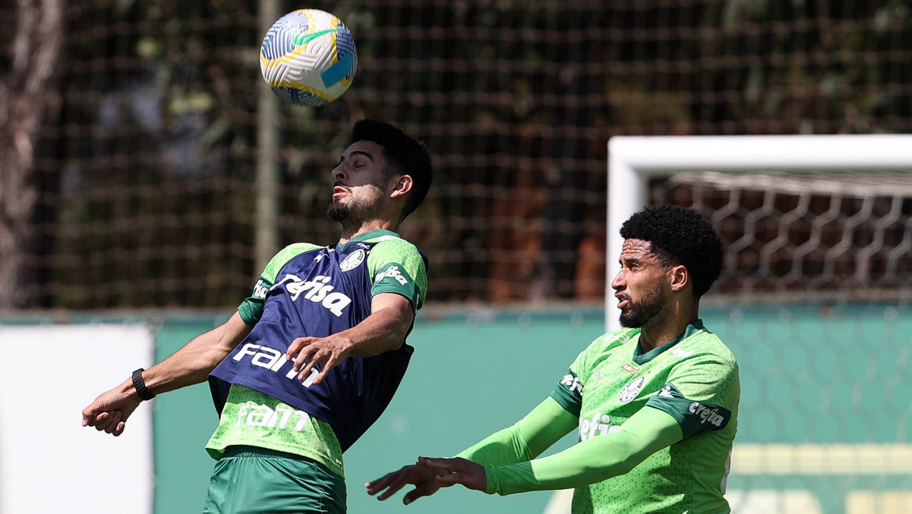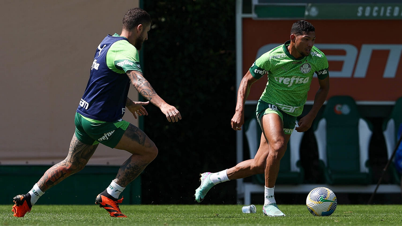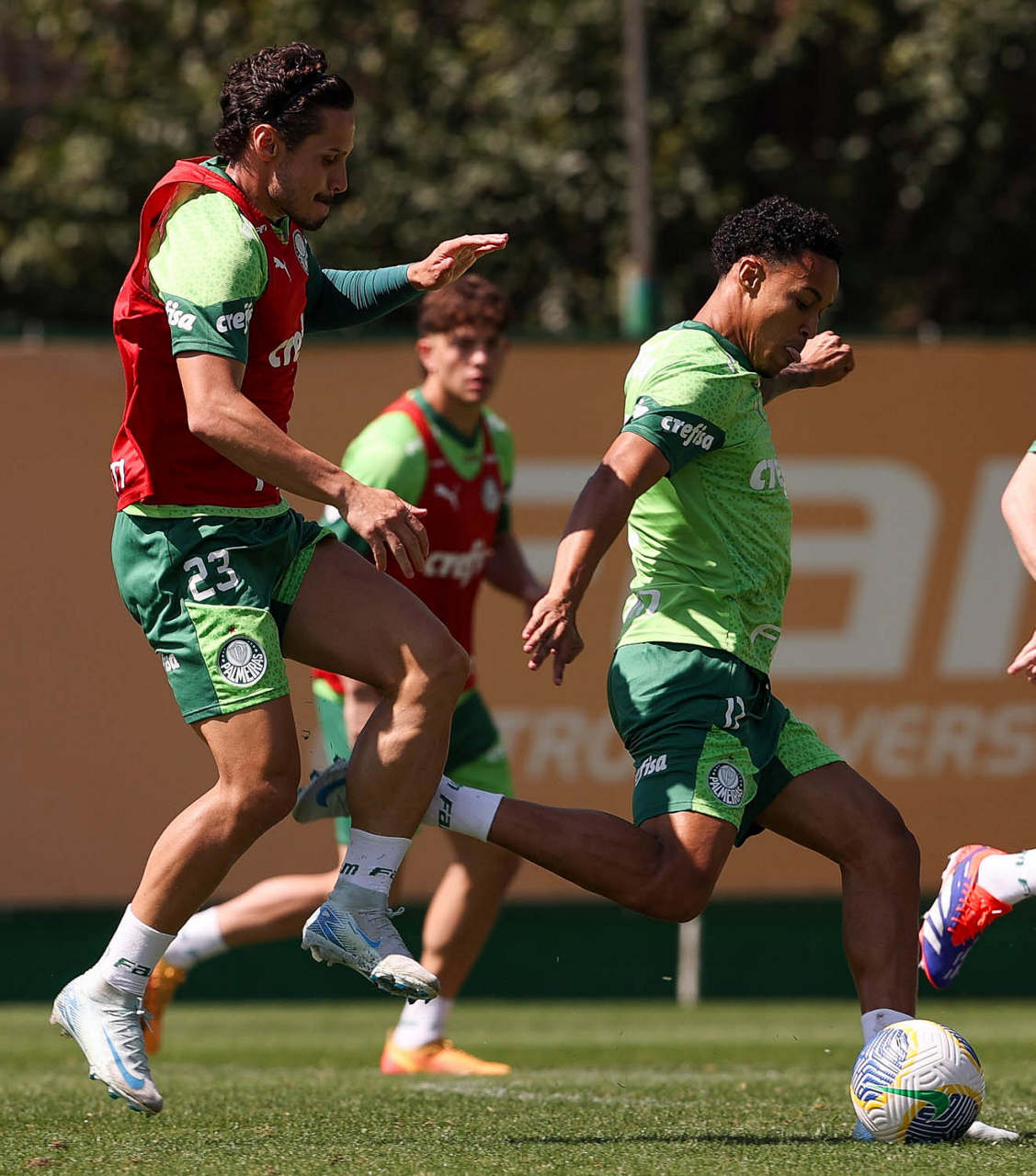 Os jogadores Richard Ríos e Marcos Rocha (D), da SE Palmeiras, durante treinamento, na Academia de Futebol. (Foto: Cesar Greco/Palmeiras/by Canon)