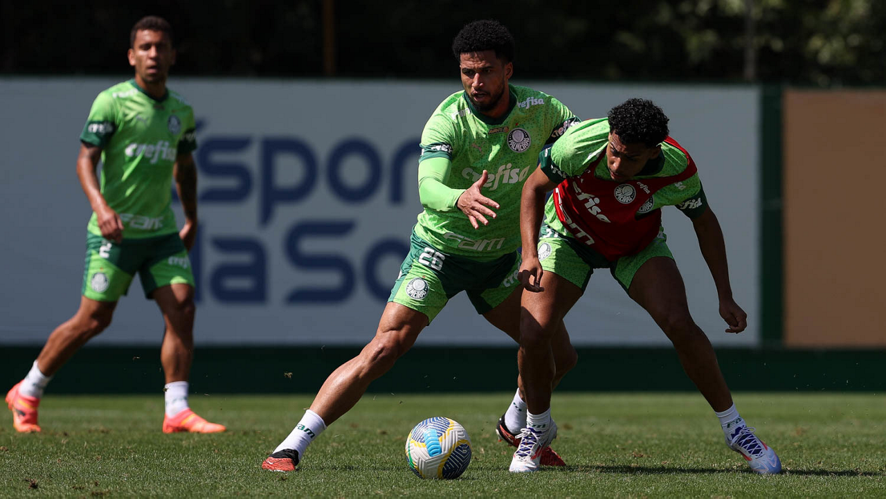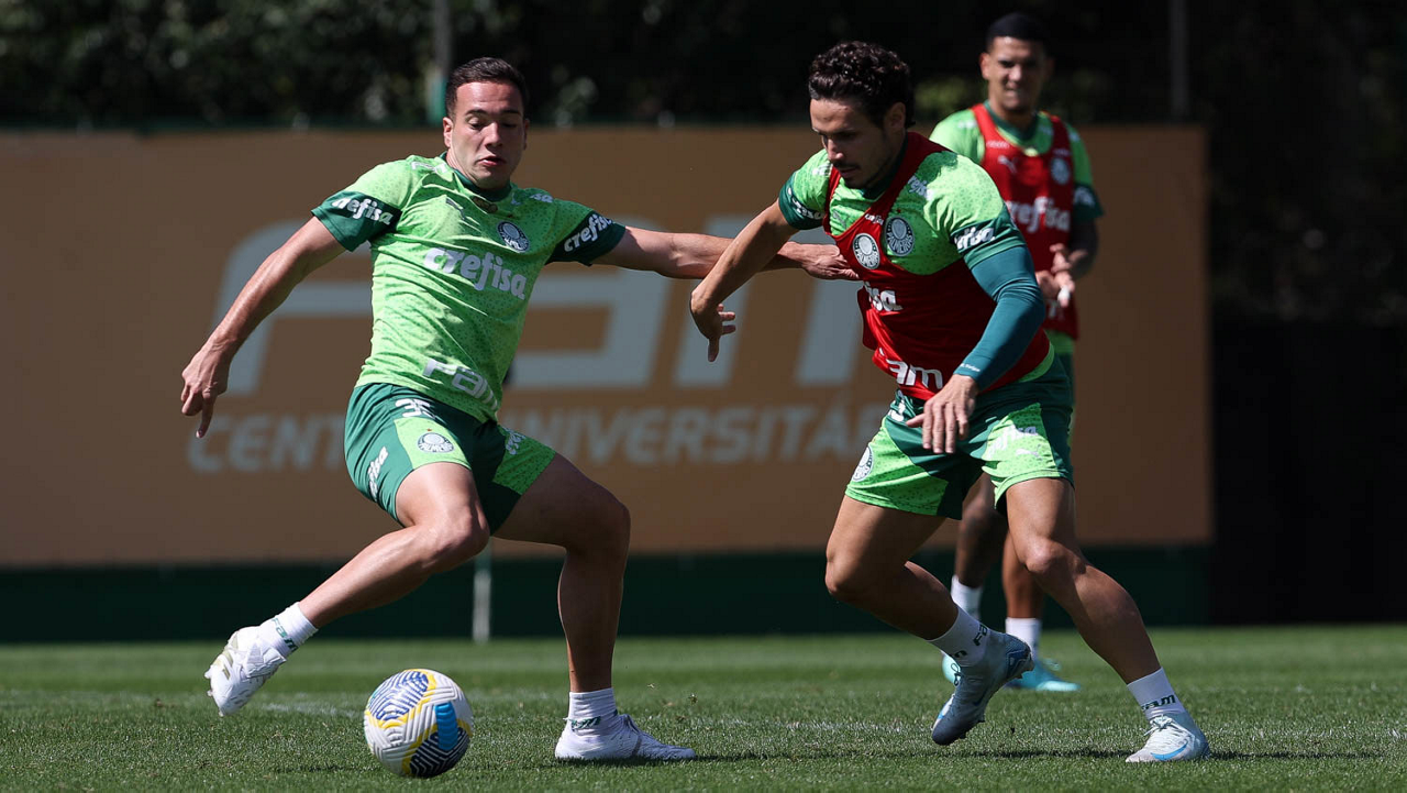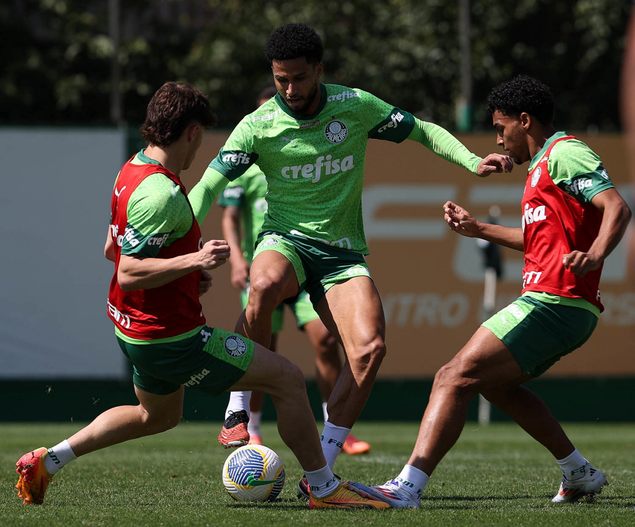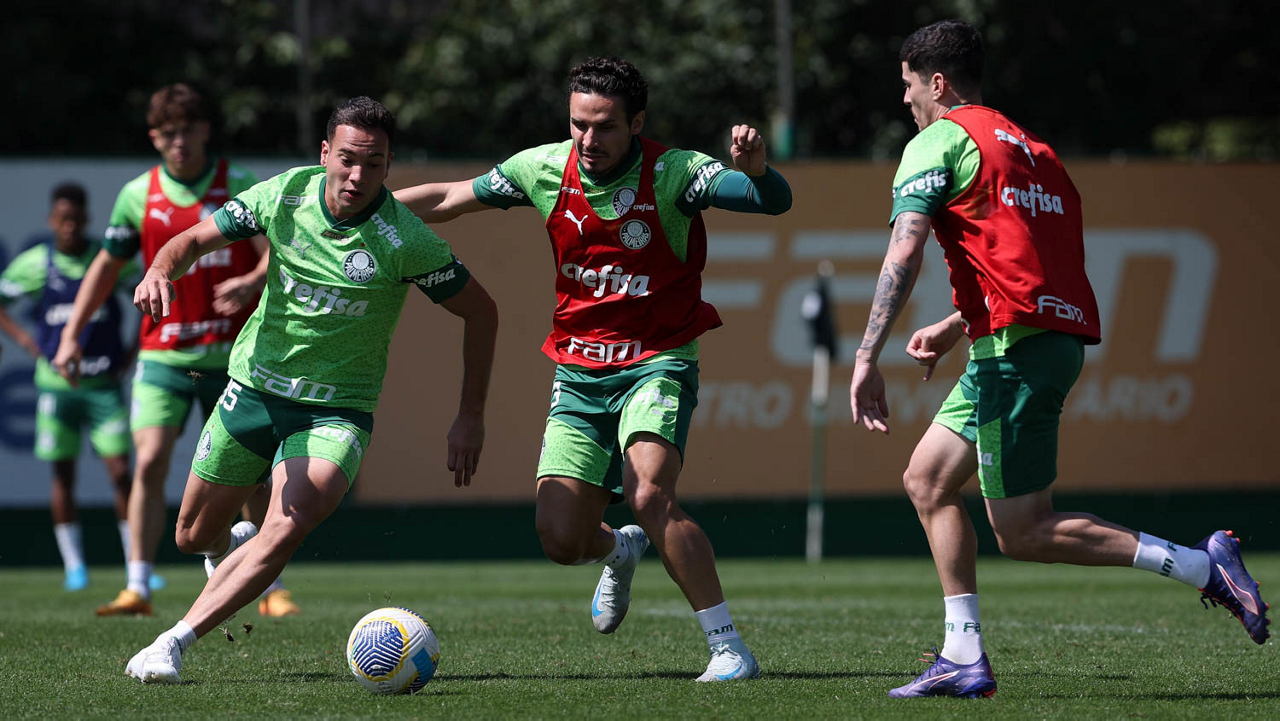 Os jogadores Raphael Veiga, Fabinho e Rômulo (E/D), da SE Palmeiras, durante treinamento, na Academia de Futebol. (Foto: Cesar Greco/Palmeiras/by Canon)
