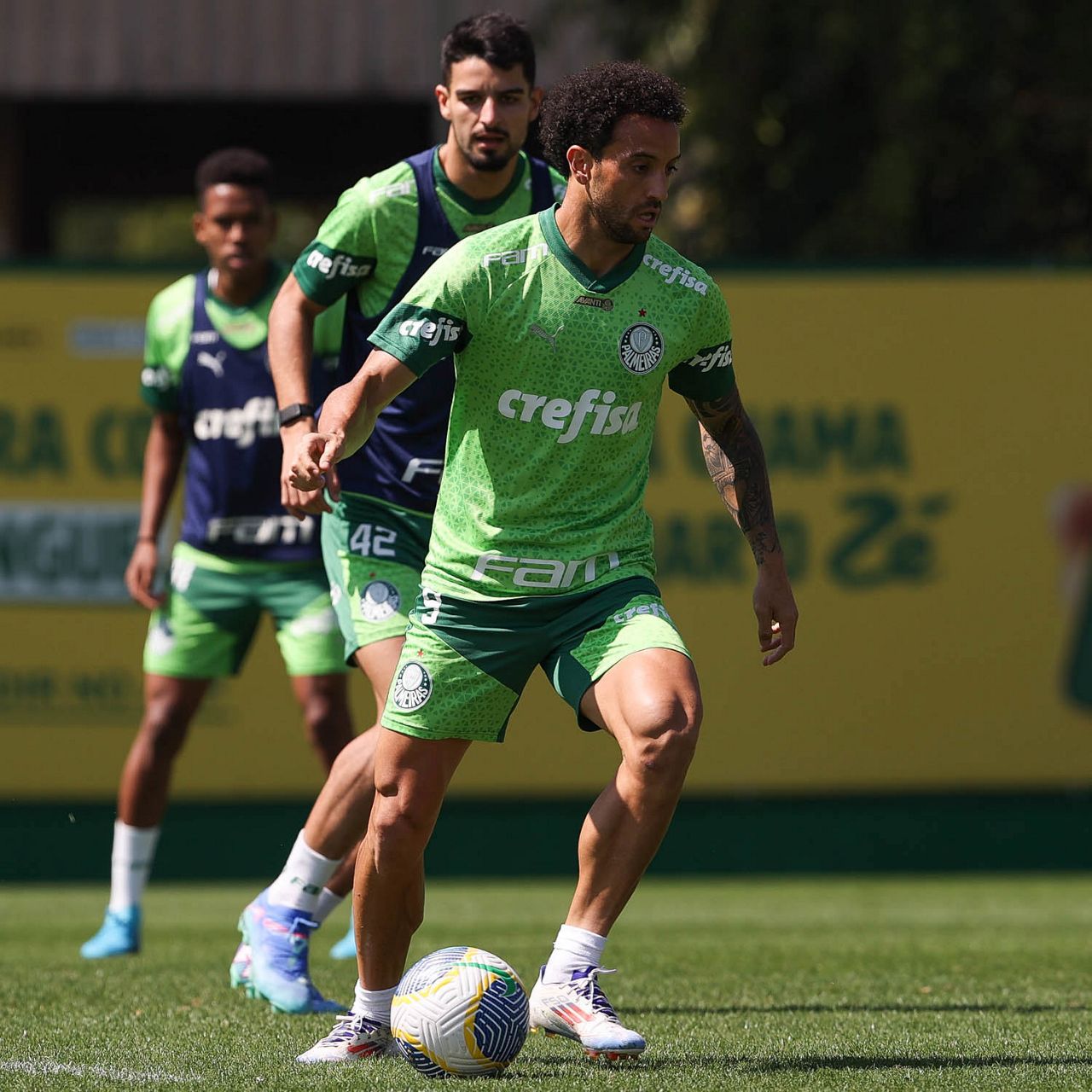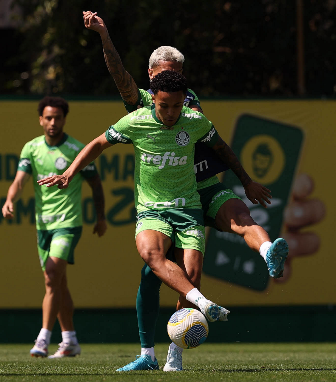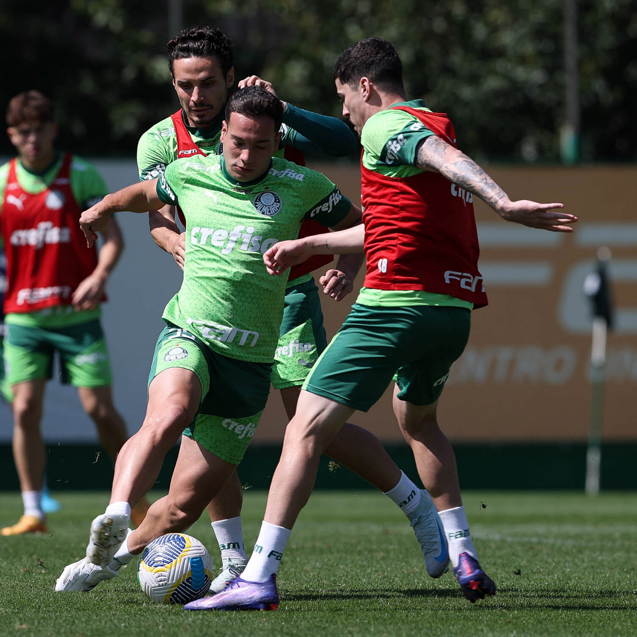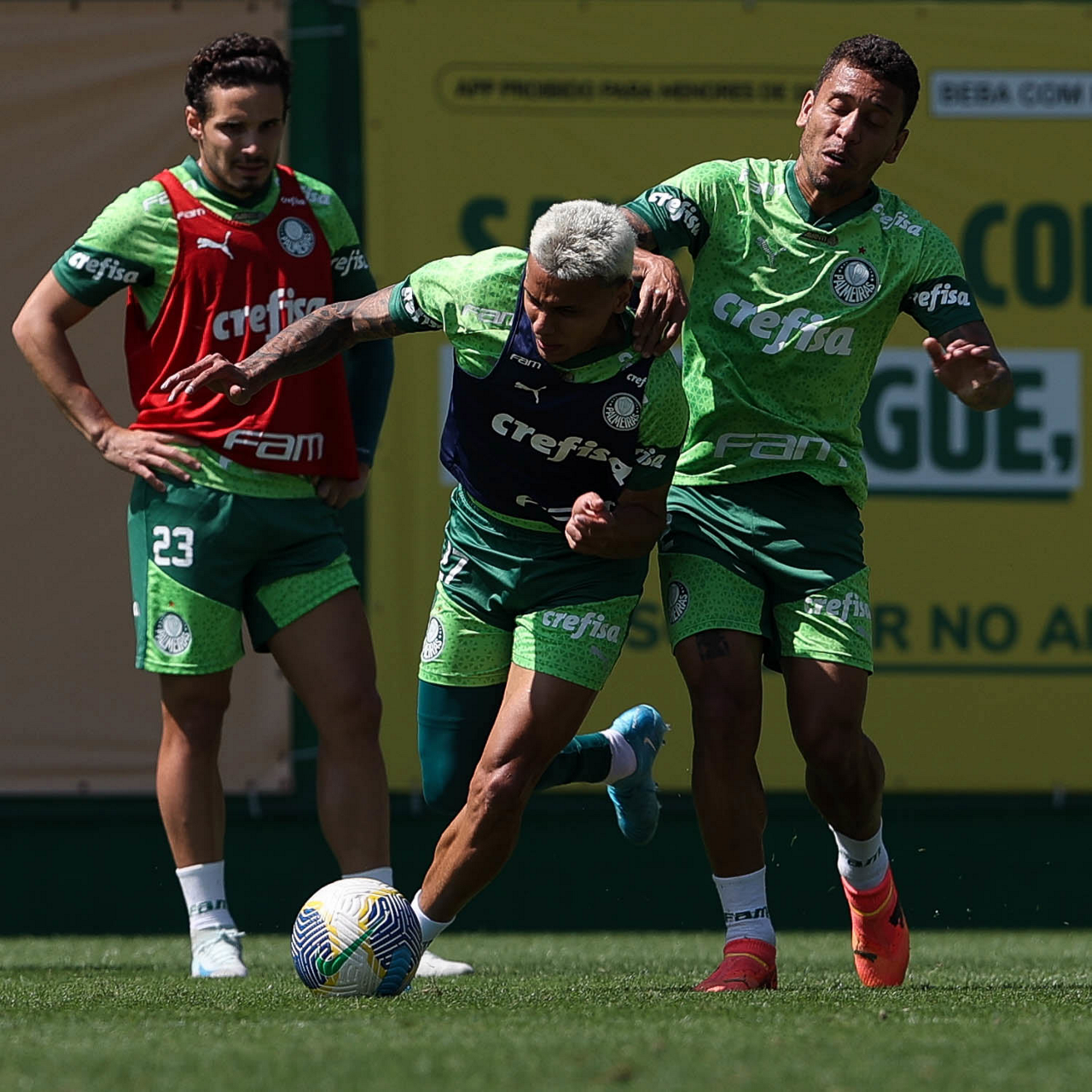 Os jogadores Raphael Veiga, Fabinho e Rômulo (E/D), da SE Palmeiras, durante treinamento, na Academia de Futebol. (Foto: Cesar Greco/Palmeiras/by Canon)