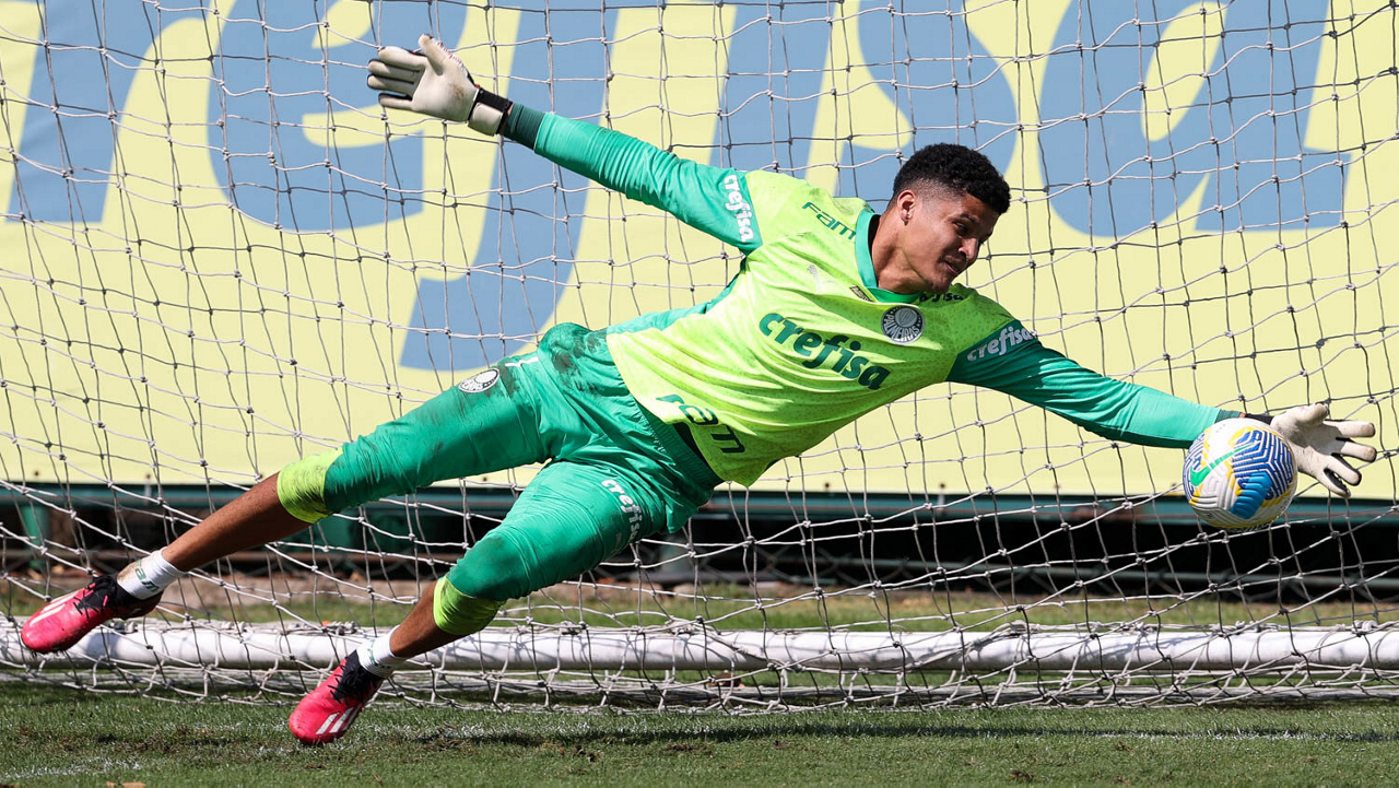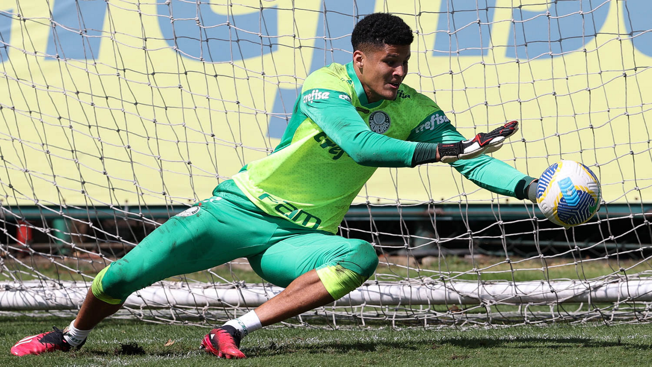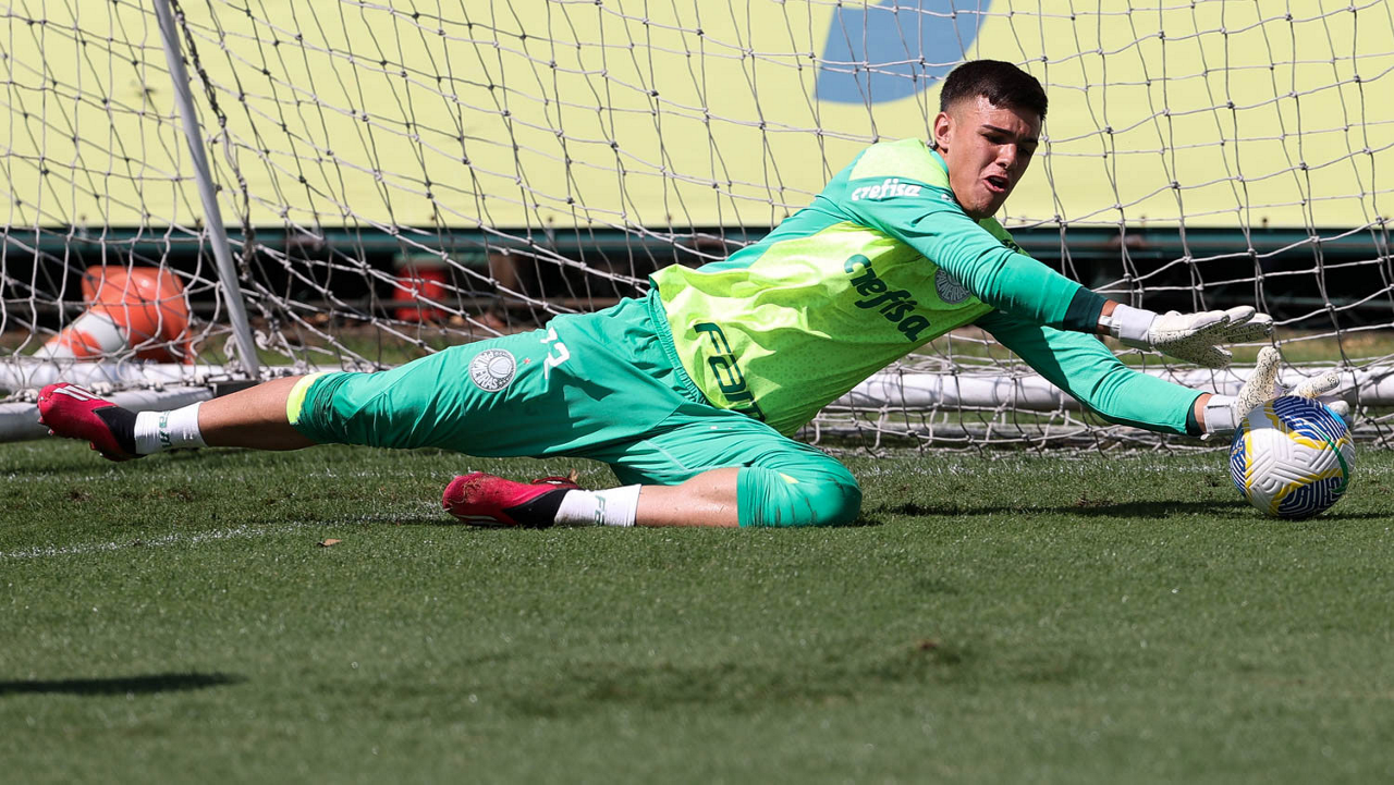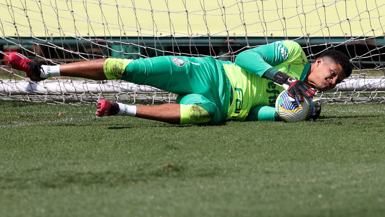 O goleiro Mateus, da SE Palmeiras, durante treinamento, na Academia de Futebol. (Foto: Cesar Greco/Palmeiras/by Canon)