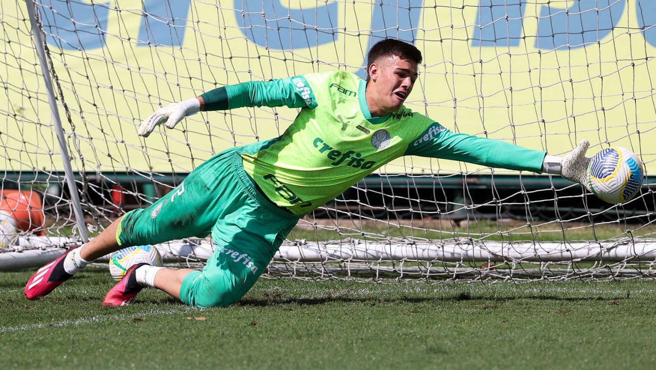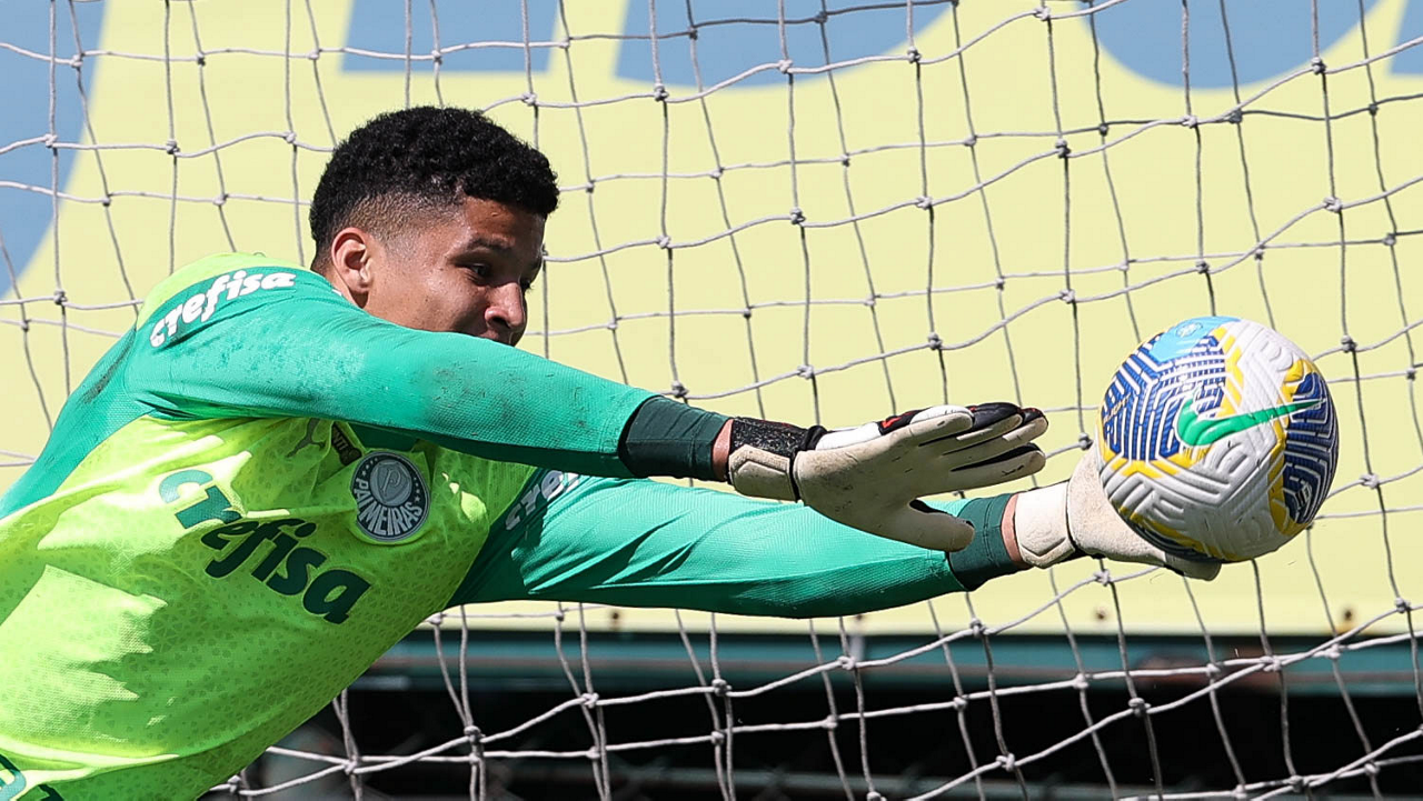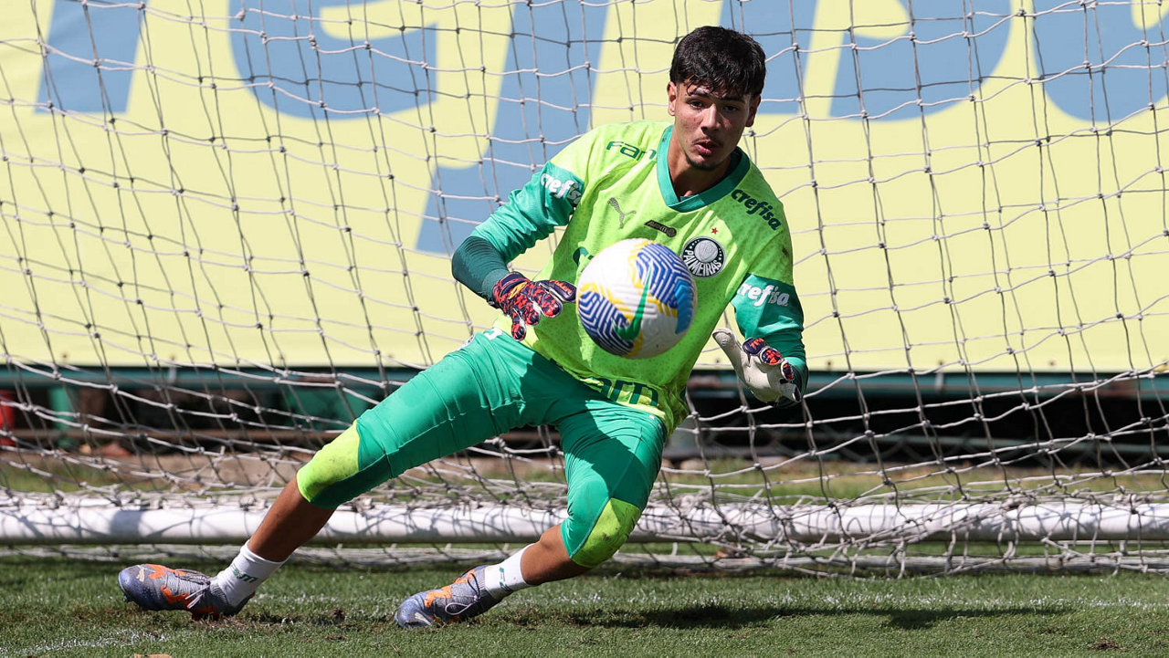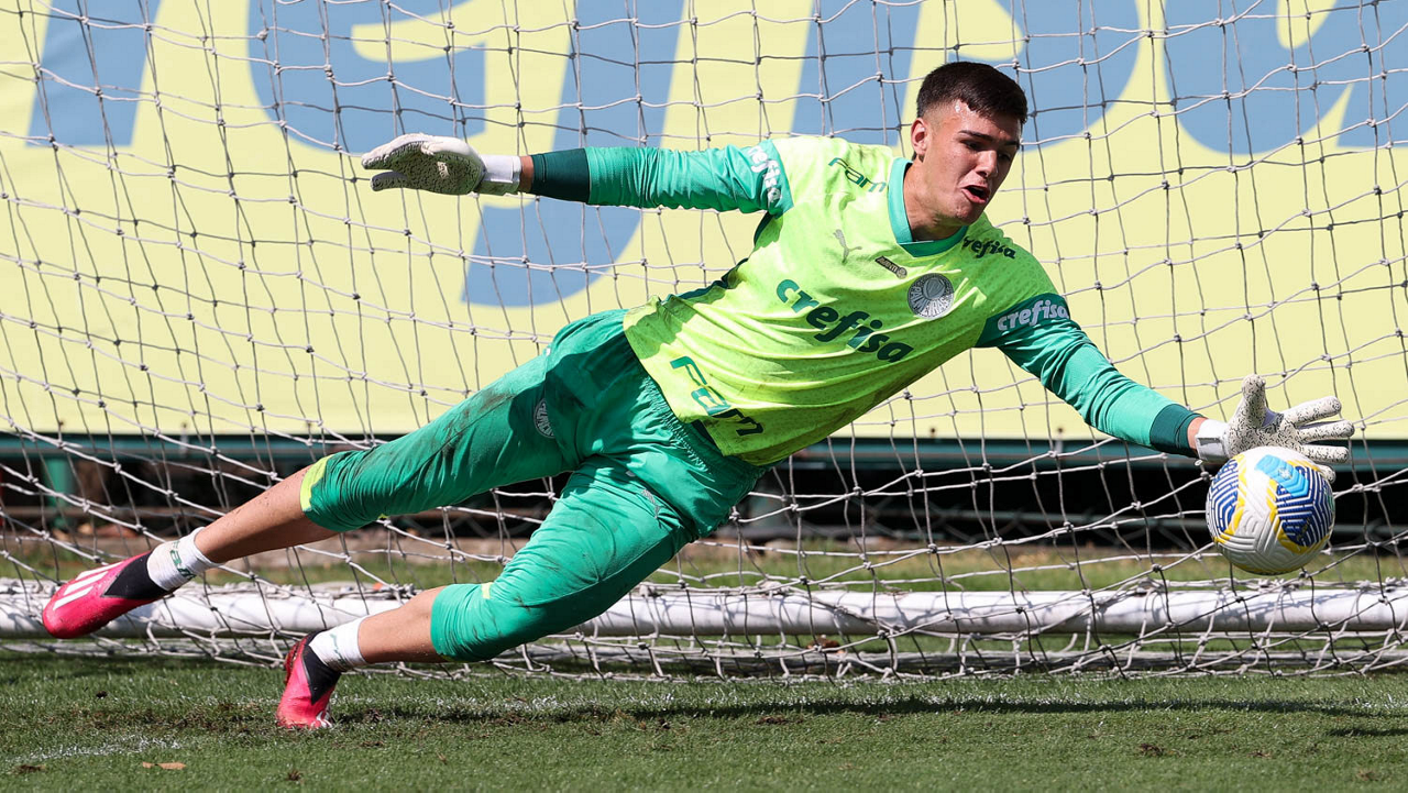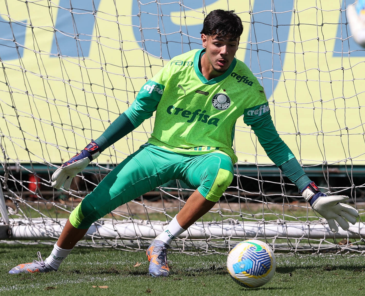 O goleiro Mateus, da SE Palmeiras, durante treinamento, na Academia de Futebol. (Foto: Cesar Greco/Palmeiras/by Canon)