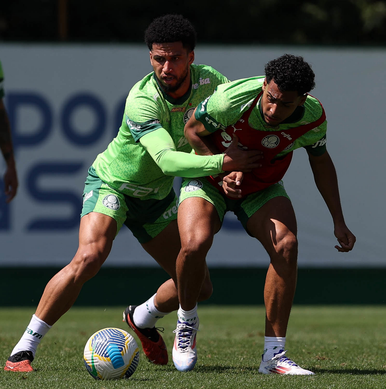 Os jogadores Fabinho e Luighi (D), da SE Palmeiras, durante treinamento, na Academia de Futebol. (Foto: Cesar Greco/Palmeiras/by Canon)