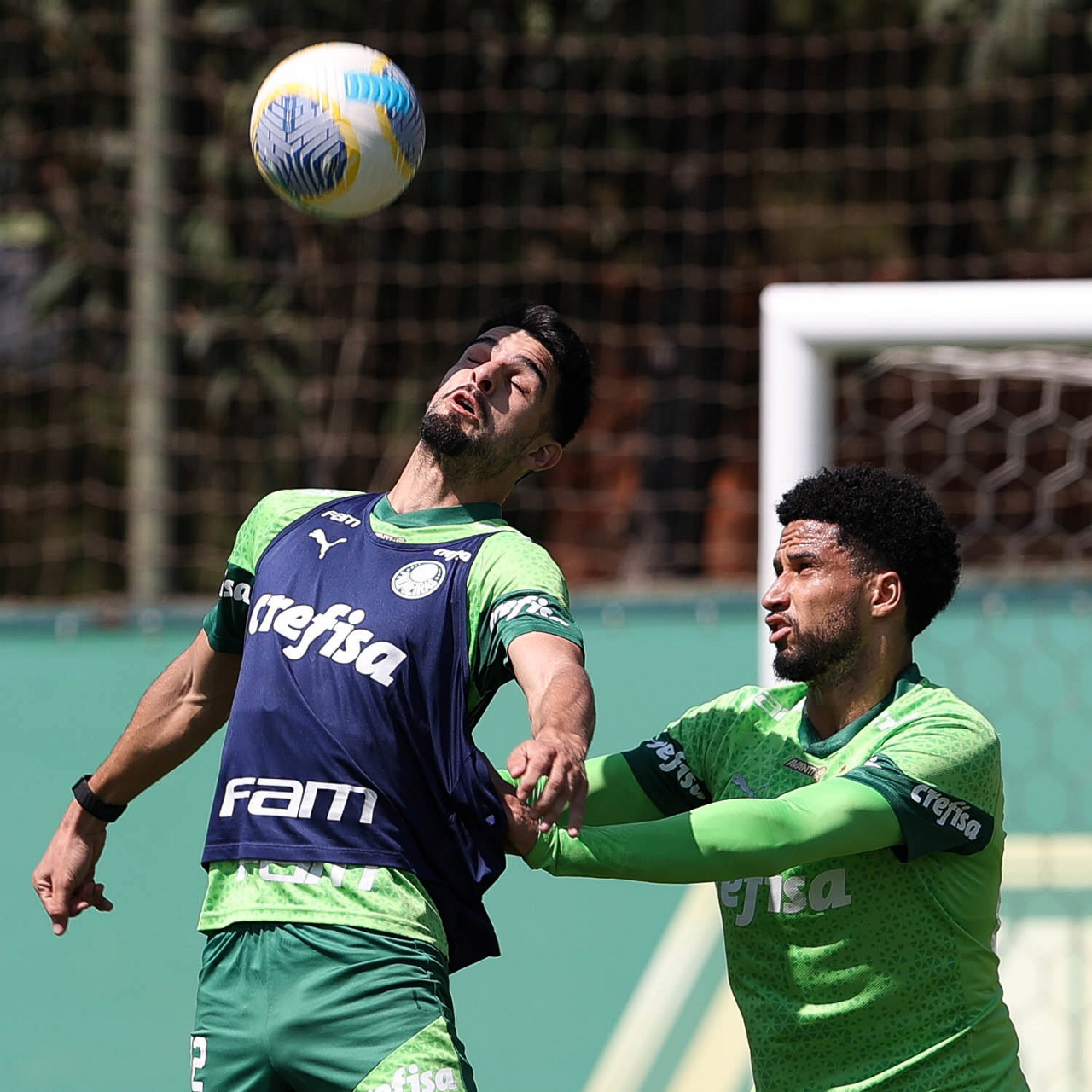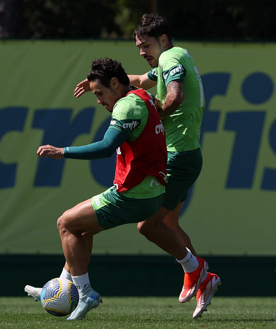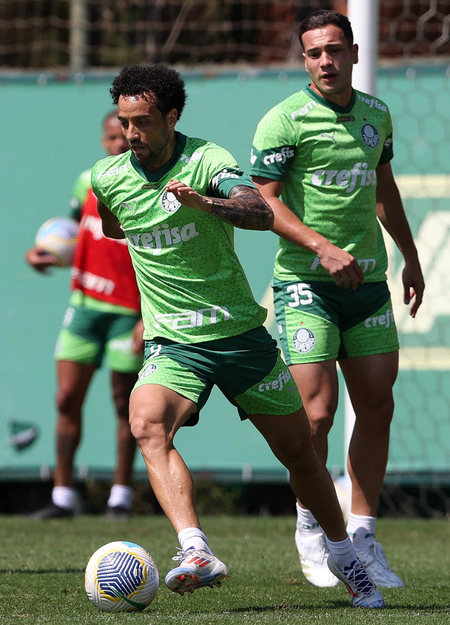 Os jogadores Fabinho e Raphael Veiga (D), da SE Palmeiras, durante treinamento, na Academia de Futebol. (Foto: Cesar Greco/Palmeiras/by Canon)