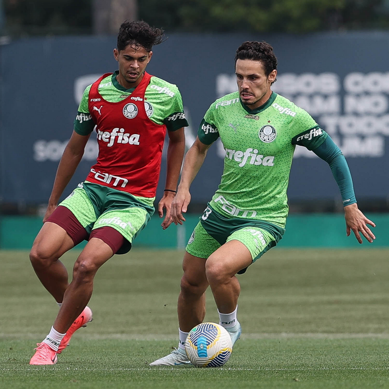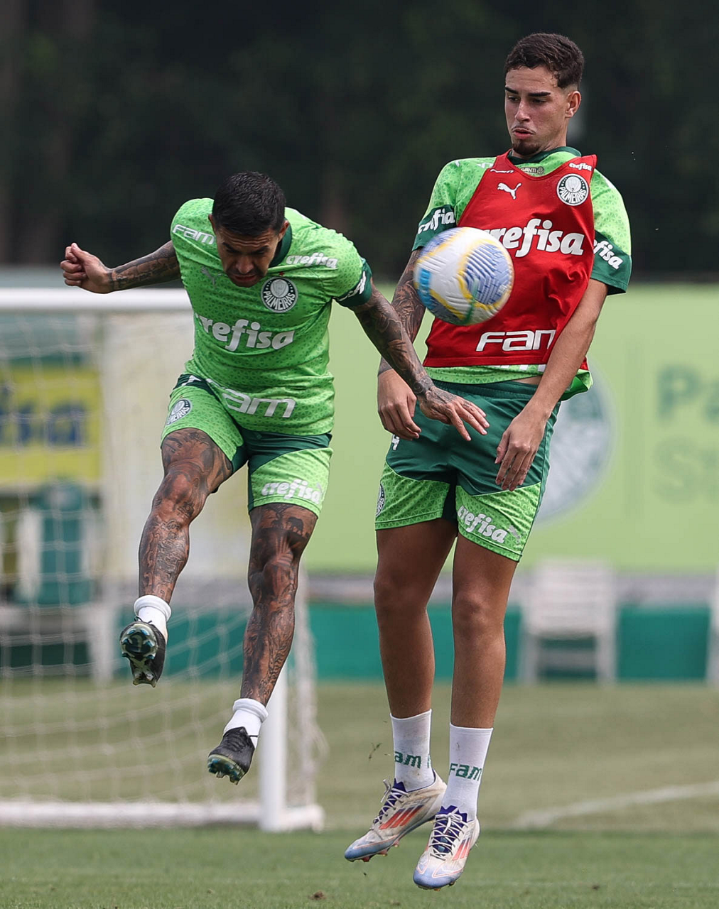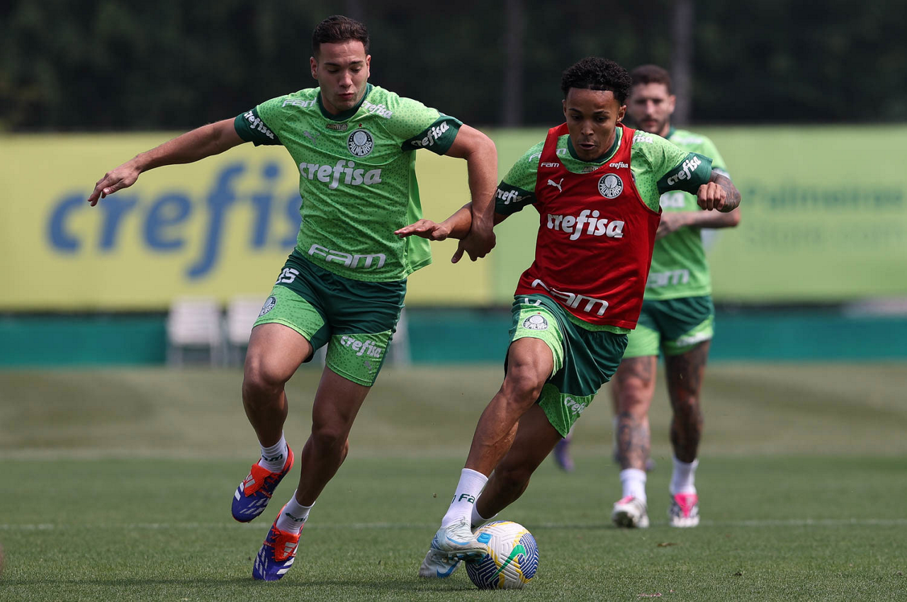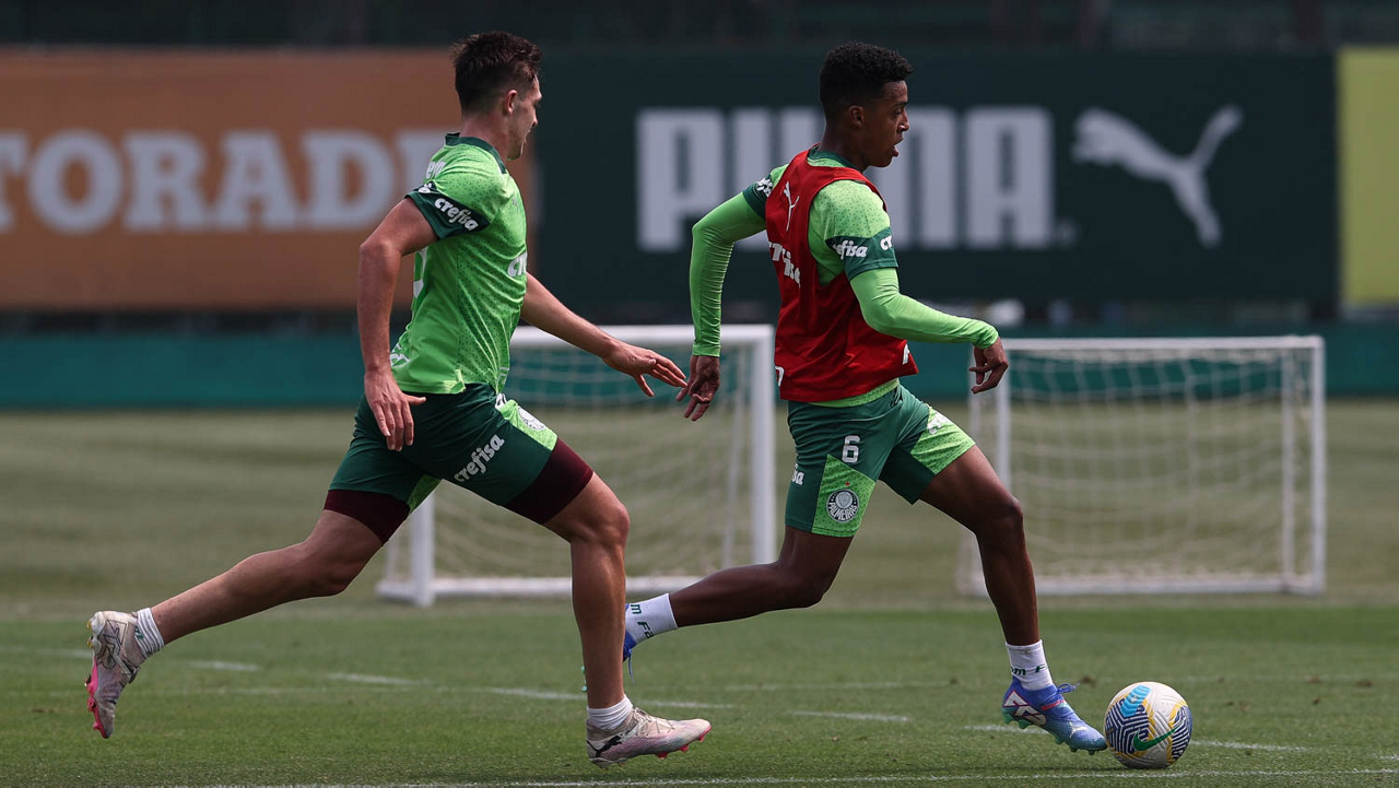 Os jogadores Pedro Almeida e Raphael Veiga (D), da SE Palmeiras, durante treinamento, na Academia de Futebol. (Foto: Cesar Greco/Palmeiras/by Canon)