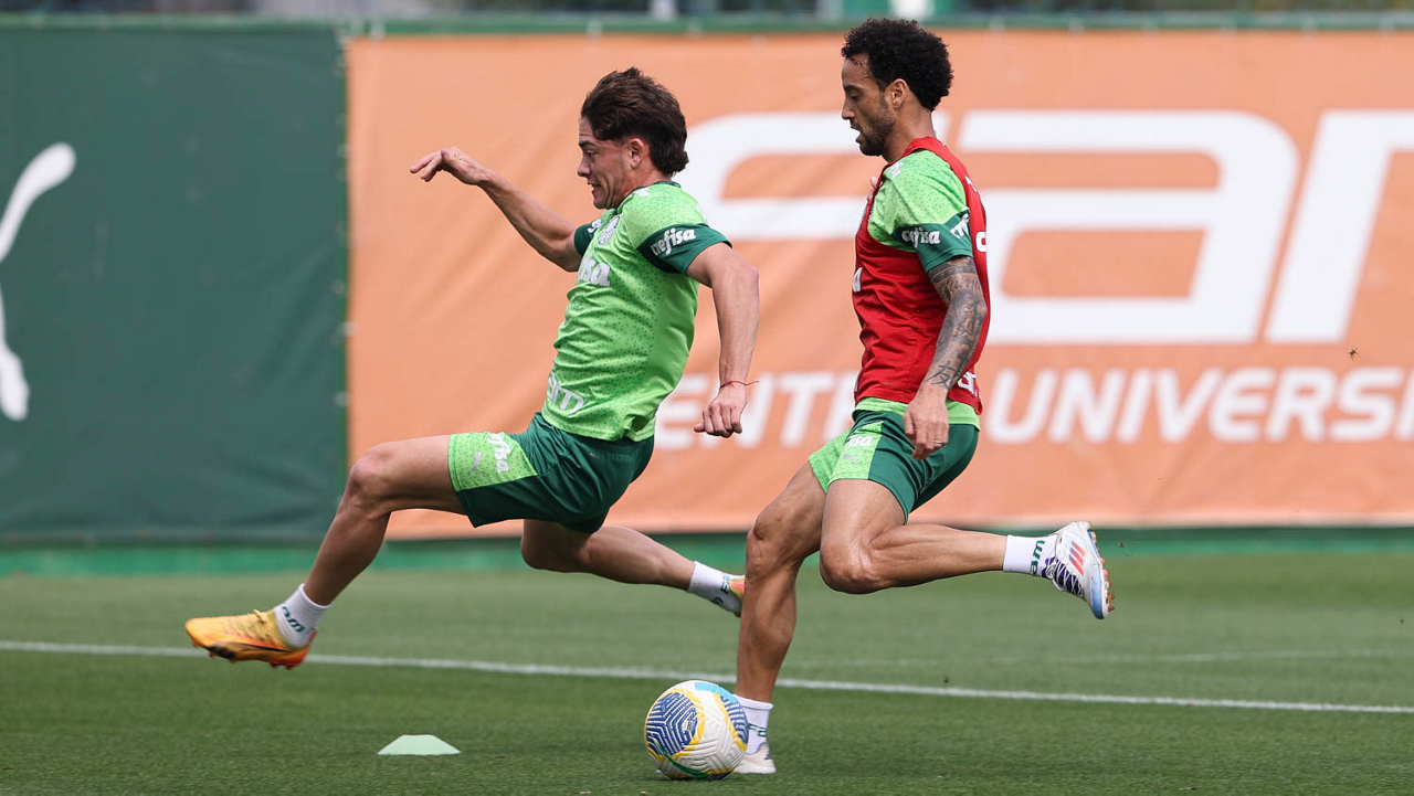 Os jogadores Agustín Giay e Felipe Anderson (D), da SE Palmeiras, durante treinamento, na Academia de Futebol. (Foto: Cesar Greco/Palmeiras/by Canon)