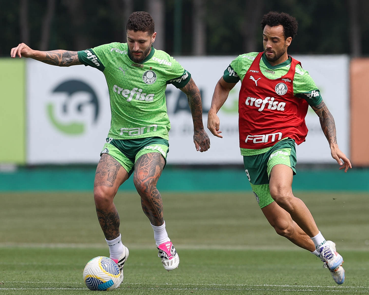 Os jogadores Fred e Vanderlan (D), da SE Palmeiras, durante treinamento, na Academia de Futebol. (Foto: Cesar Greco/Palmeiras/by Canon)