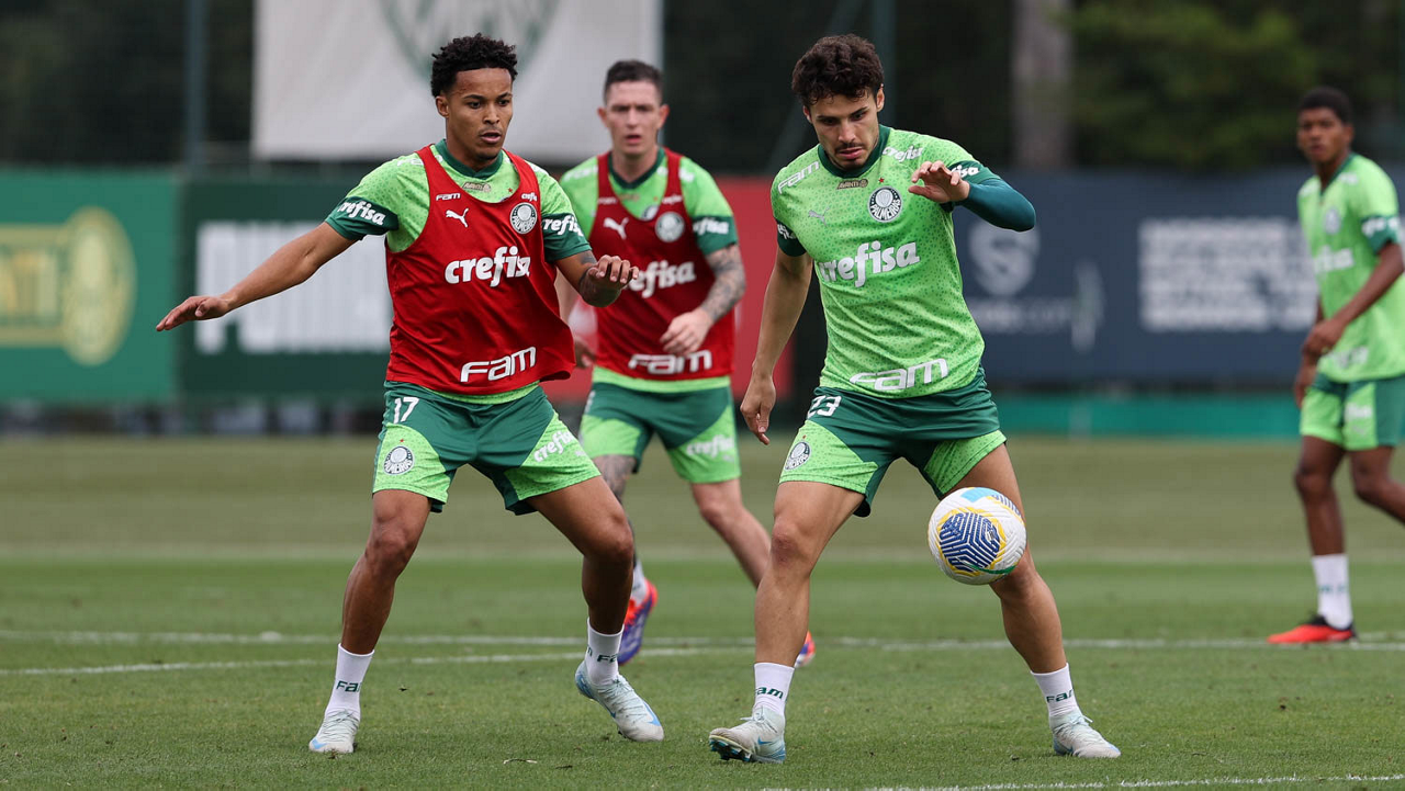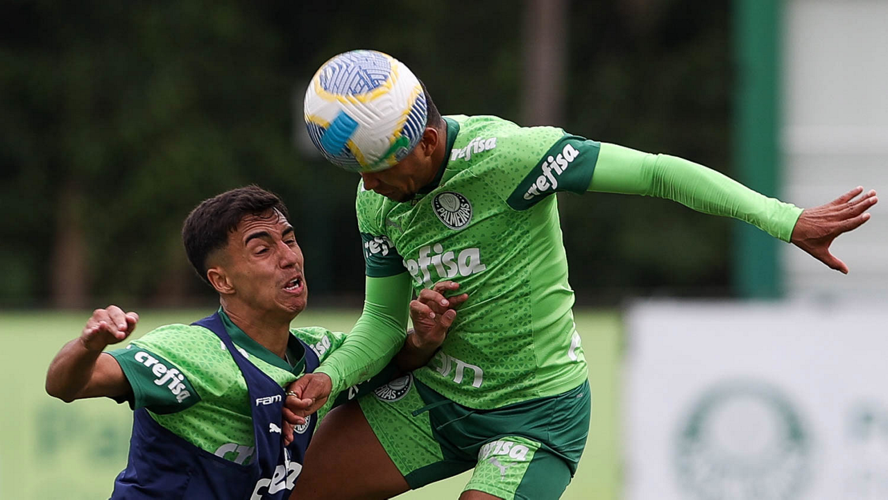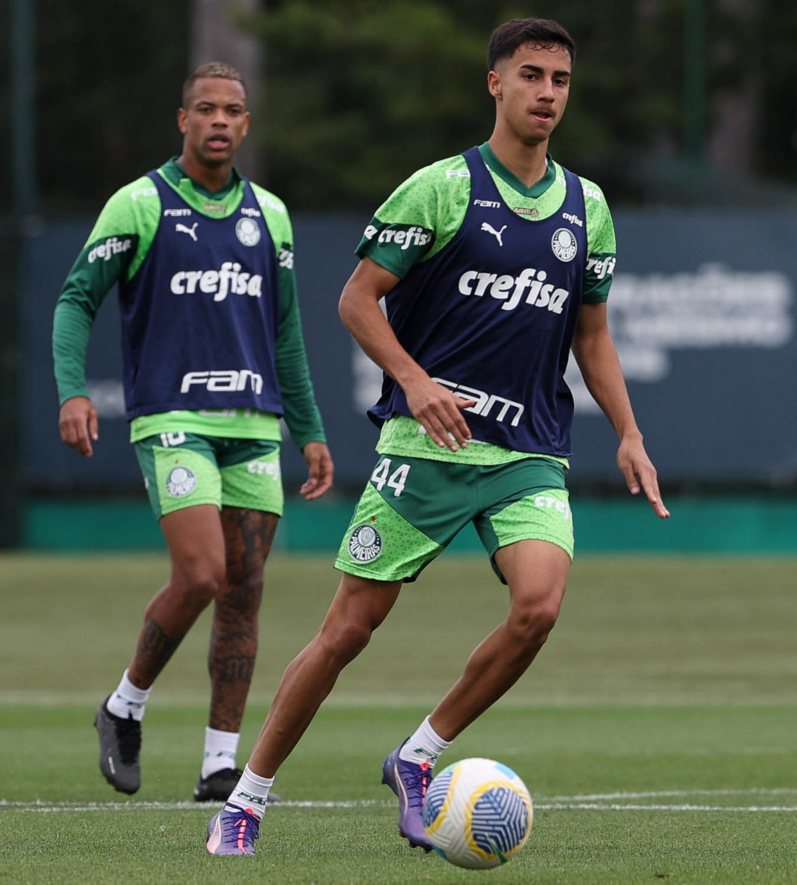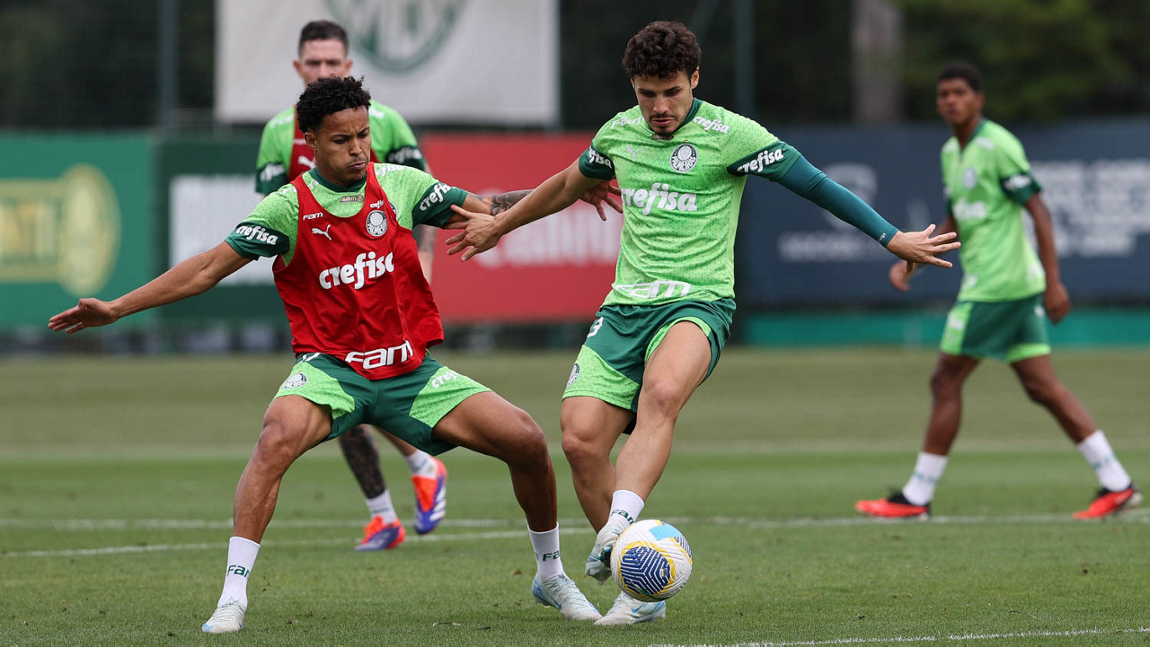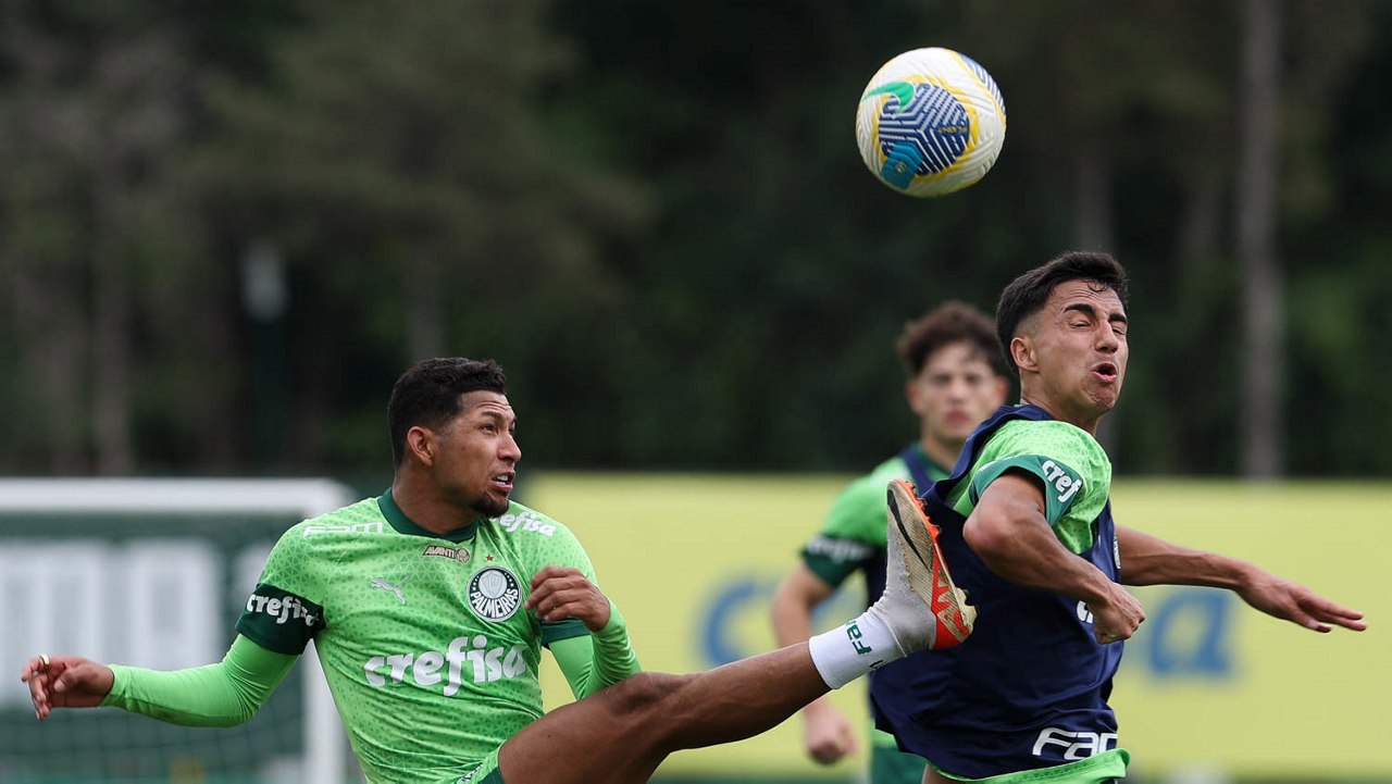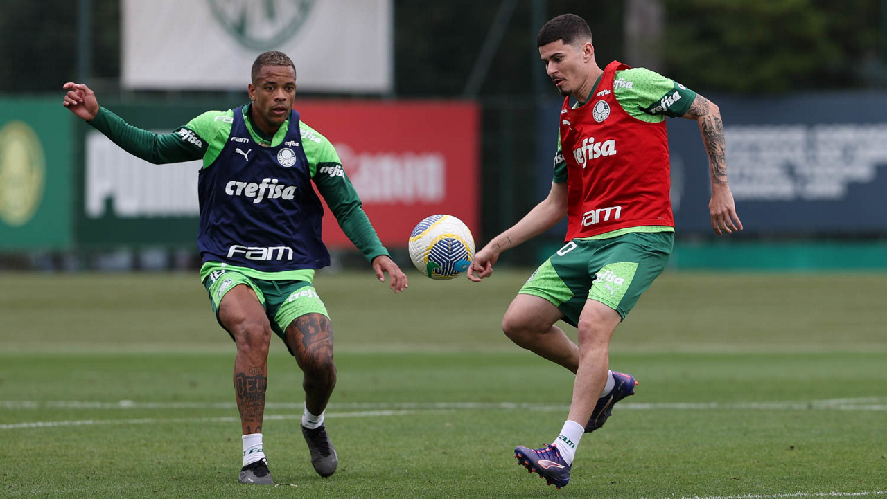 Os jogadores Vitor Reis e Rony (D), da SE Palmeiras, durante treinamento, na Academia de Futebol. (Foto: Cesar Greco/Palmeiras/by Canon)