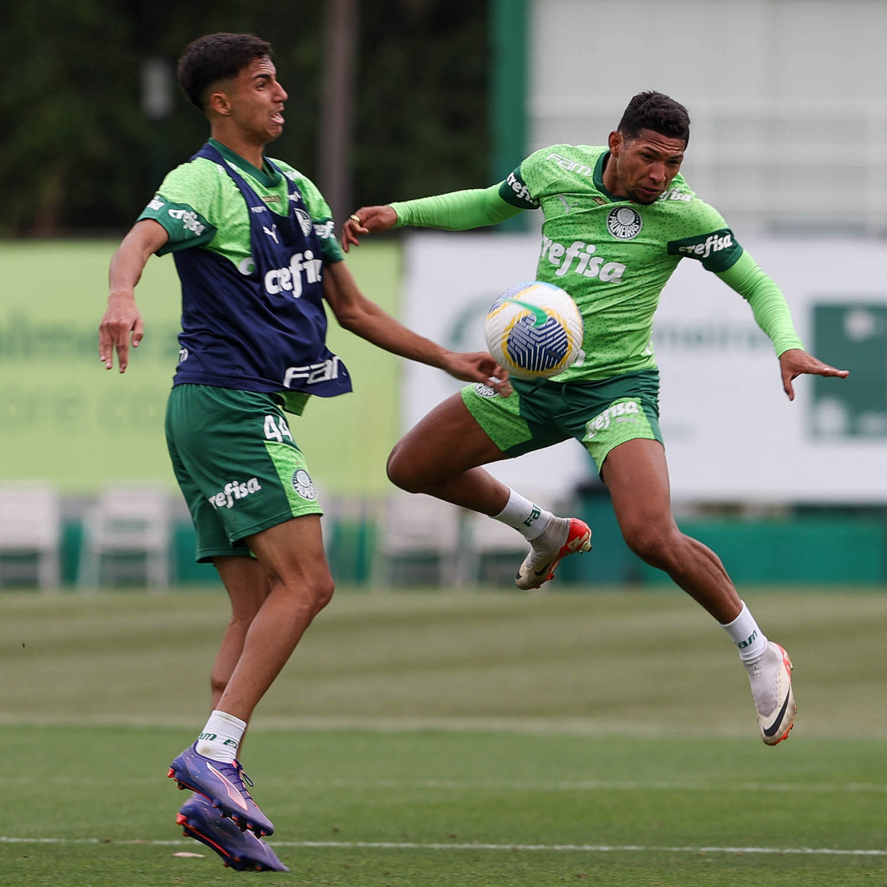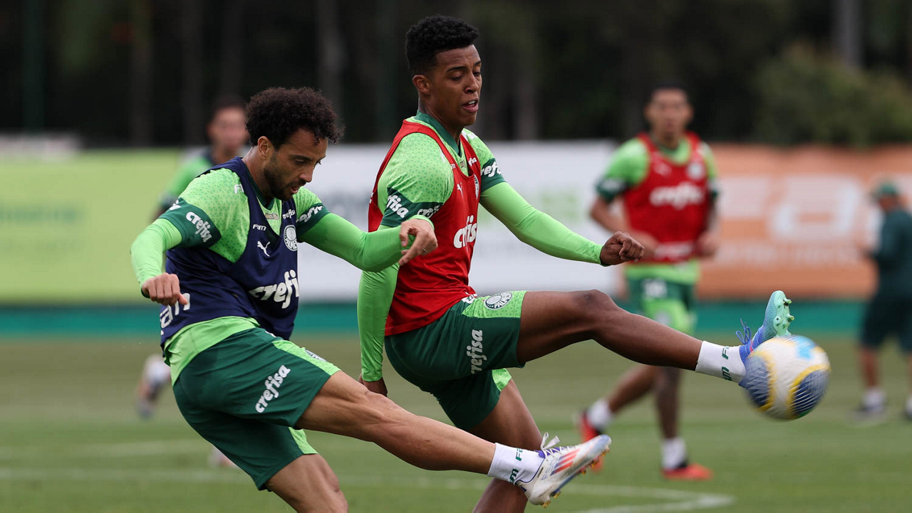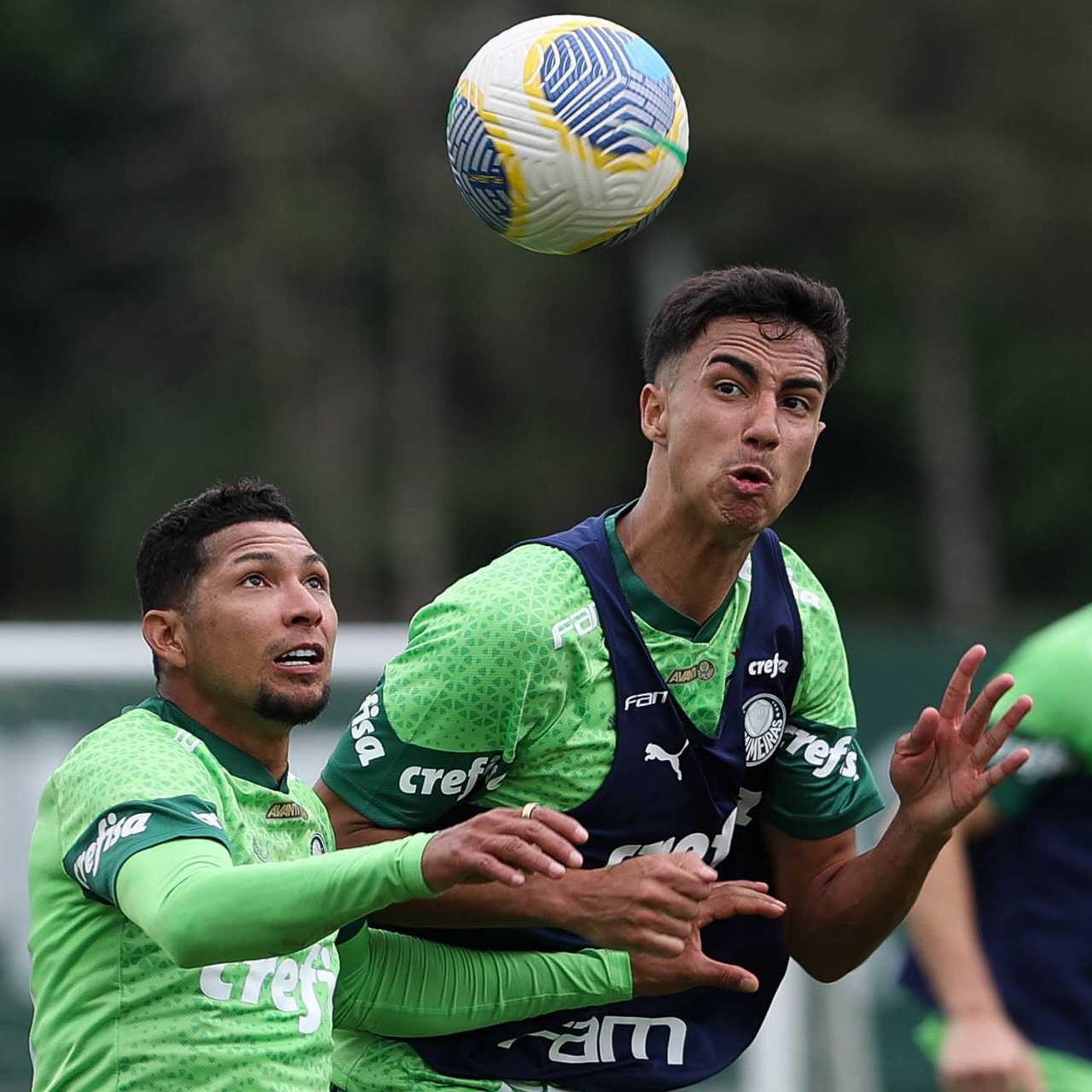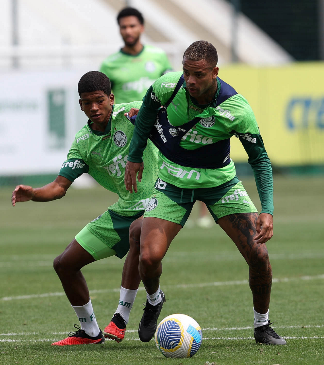 Os jogadores Vitor Reis e Rony (D), da SE Palmeiras, durante treinamento, na Academia de Futebol. (Foto: Cesar Greco/Palmeiras/by Canon)