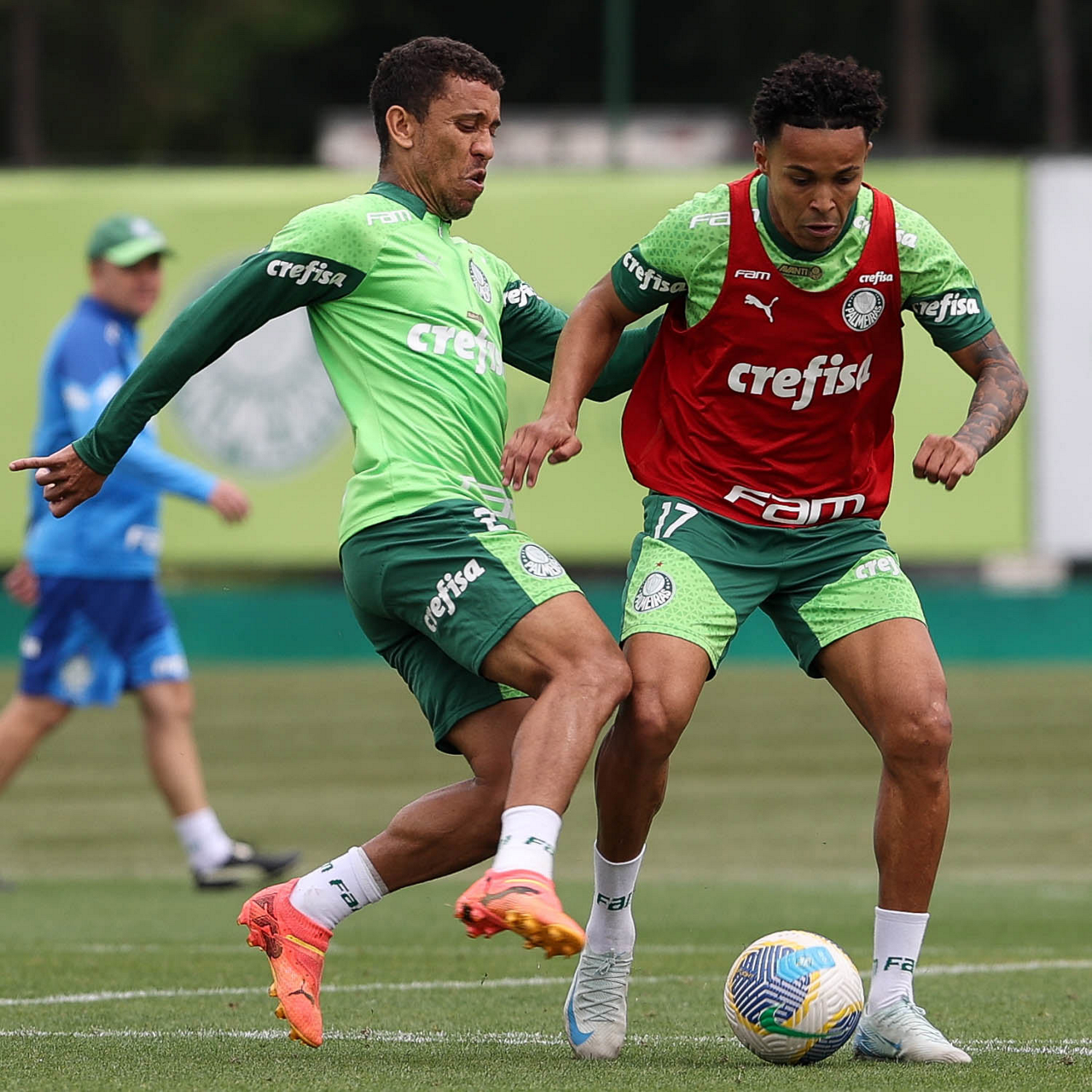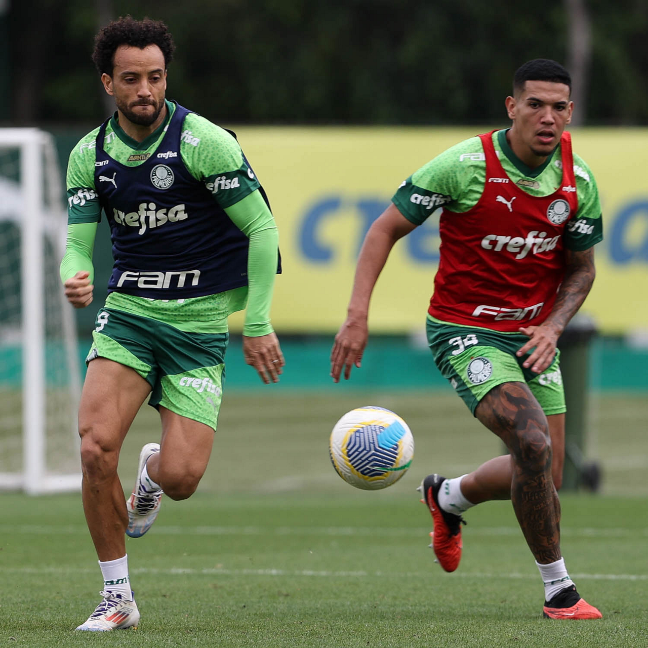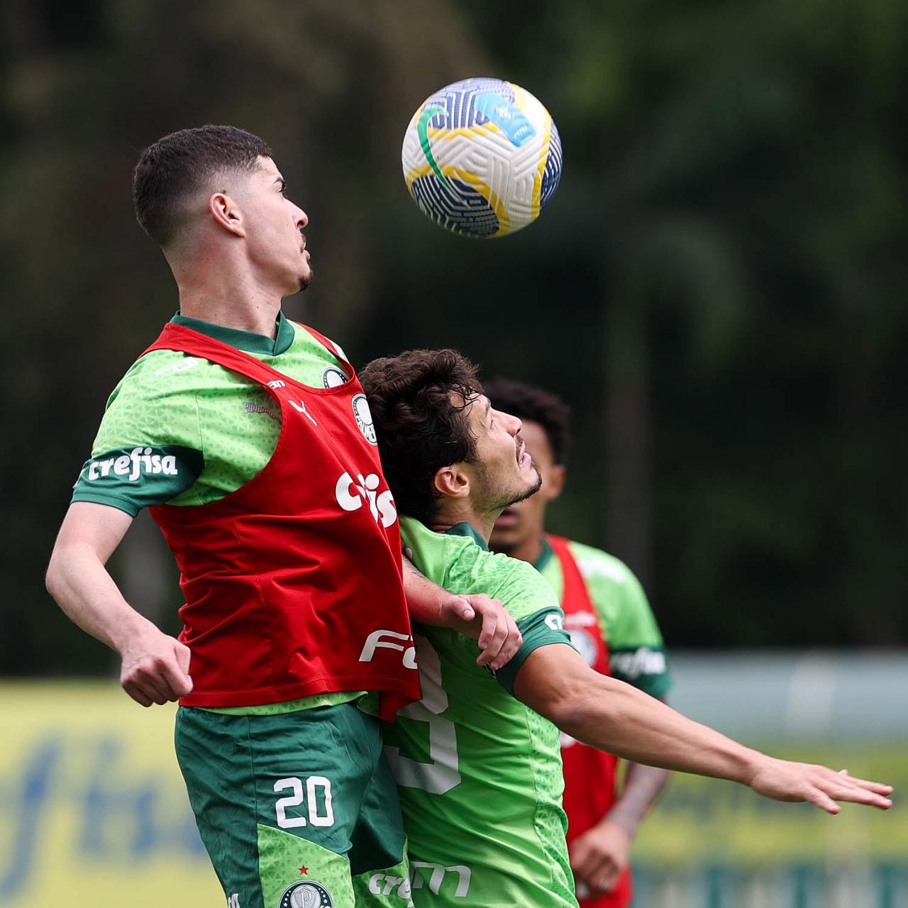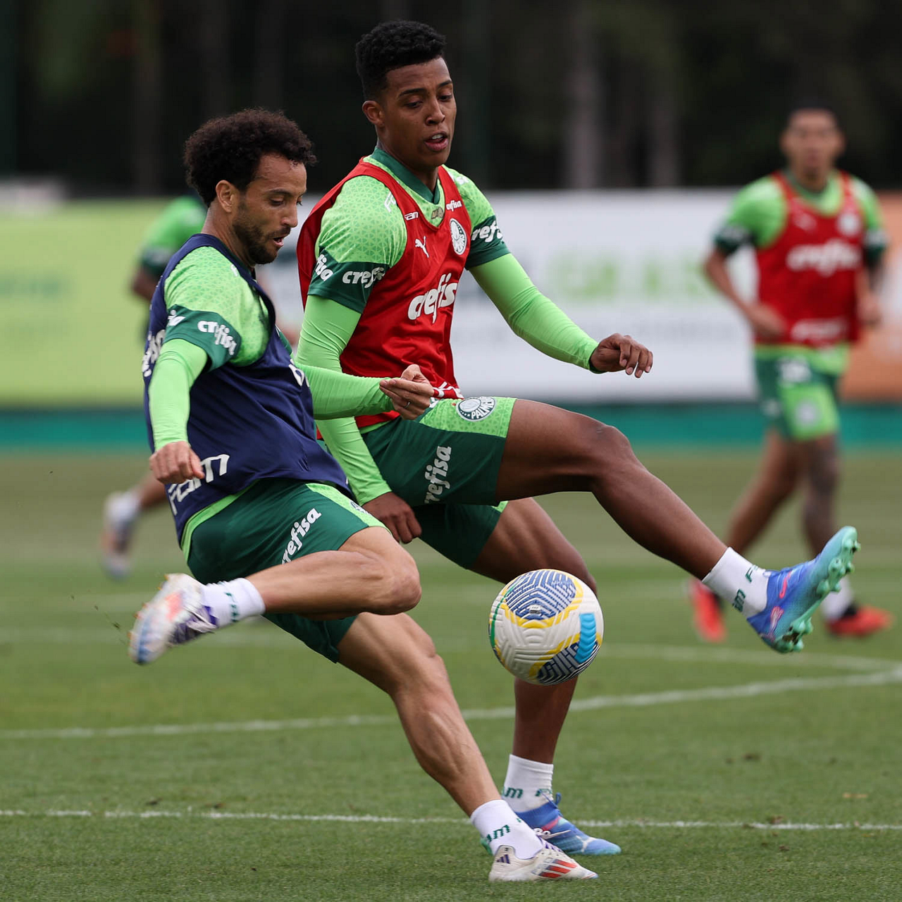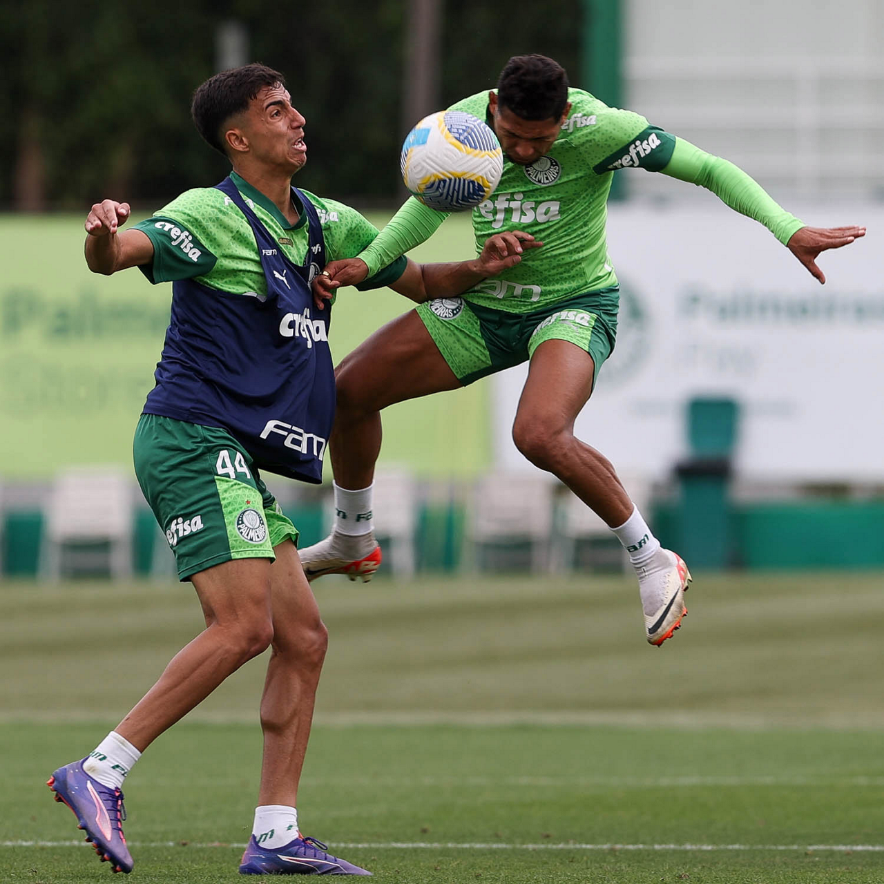 Os jogadores Vitor Reis e Rony (D), da SE Palmeiras, durante treinamento, na Academia de Futebol. (Foto: Cesar Greco/Palmeiras/by Canon)