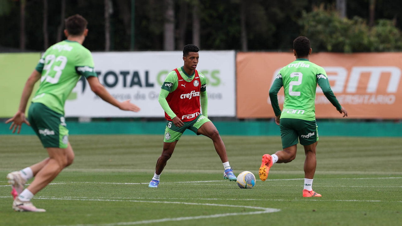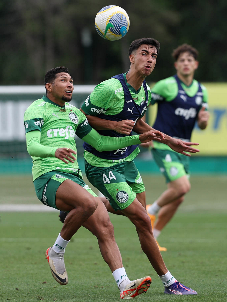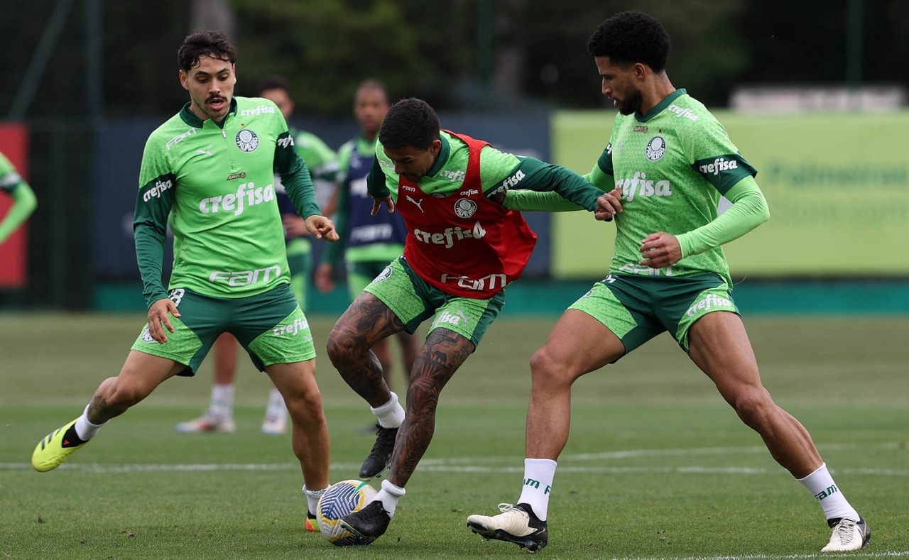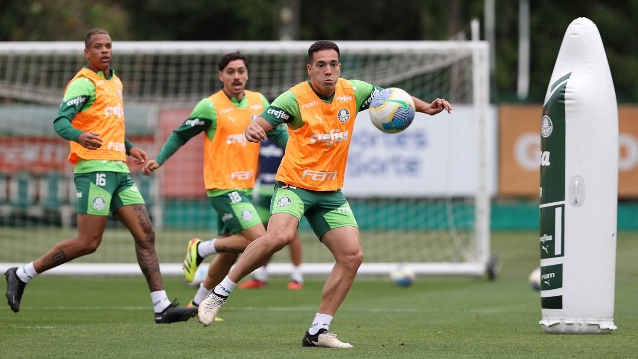 Os jogadores Vitor Reis, Anibal Moreno e Flaco López (E/D), da SE Palmeiras, durante treinamento, na Academia de Futebol. (Foto: Cesar Greco/Palmeiras/by Canon)