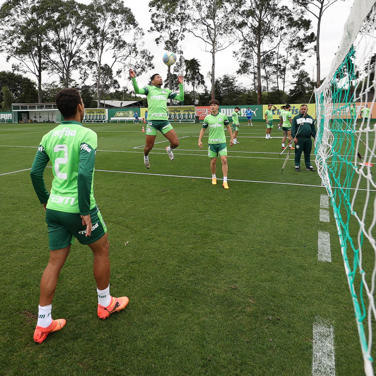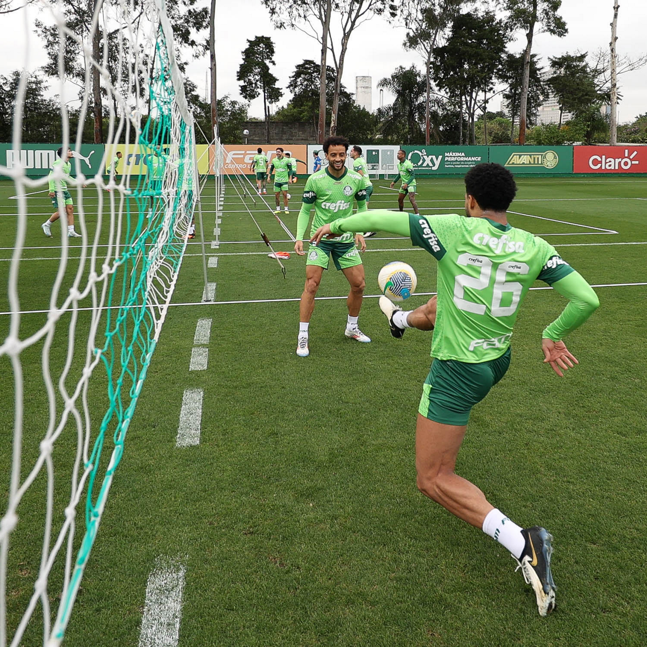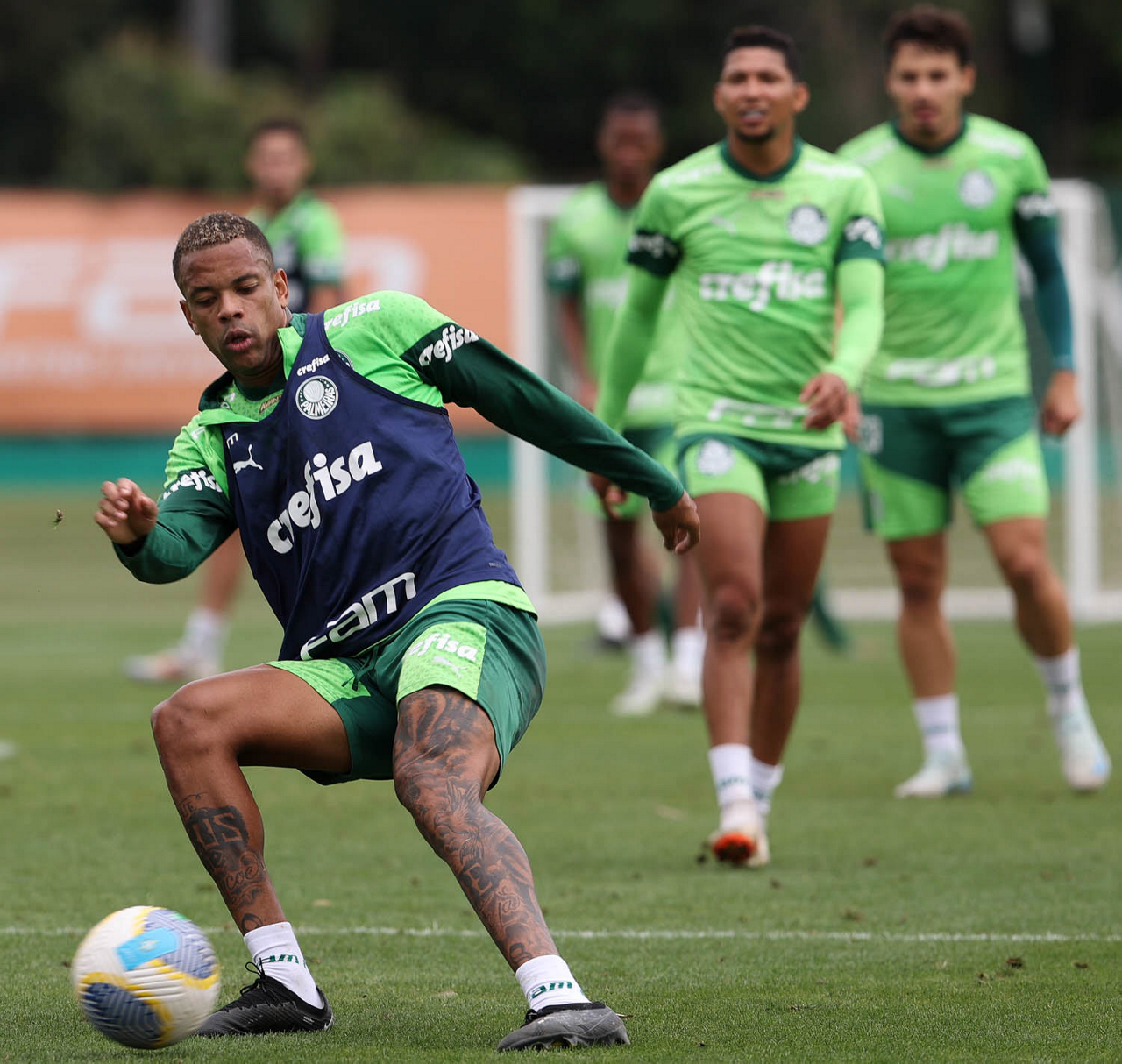 Os jogadores Vitor Reis, Flaco López e Anibal Moreno (E/D), da SE Palmeiras, durante treinamento, na Academia de Futebol. (Foto: Cesar Greco/Palmeiras/by Canon)