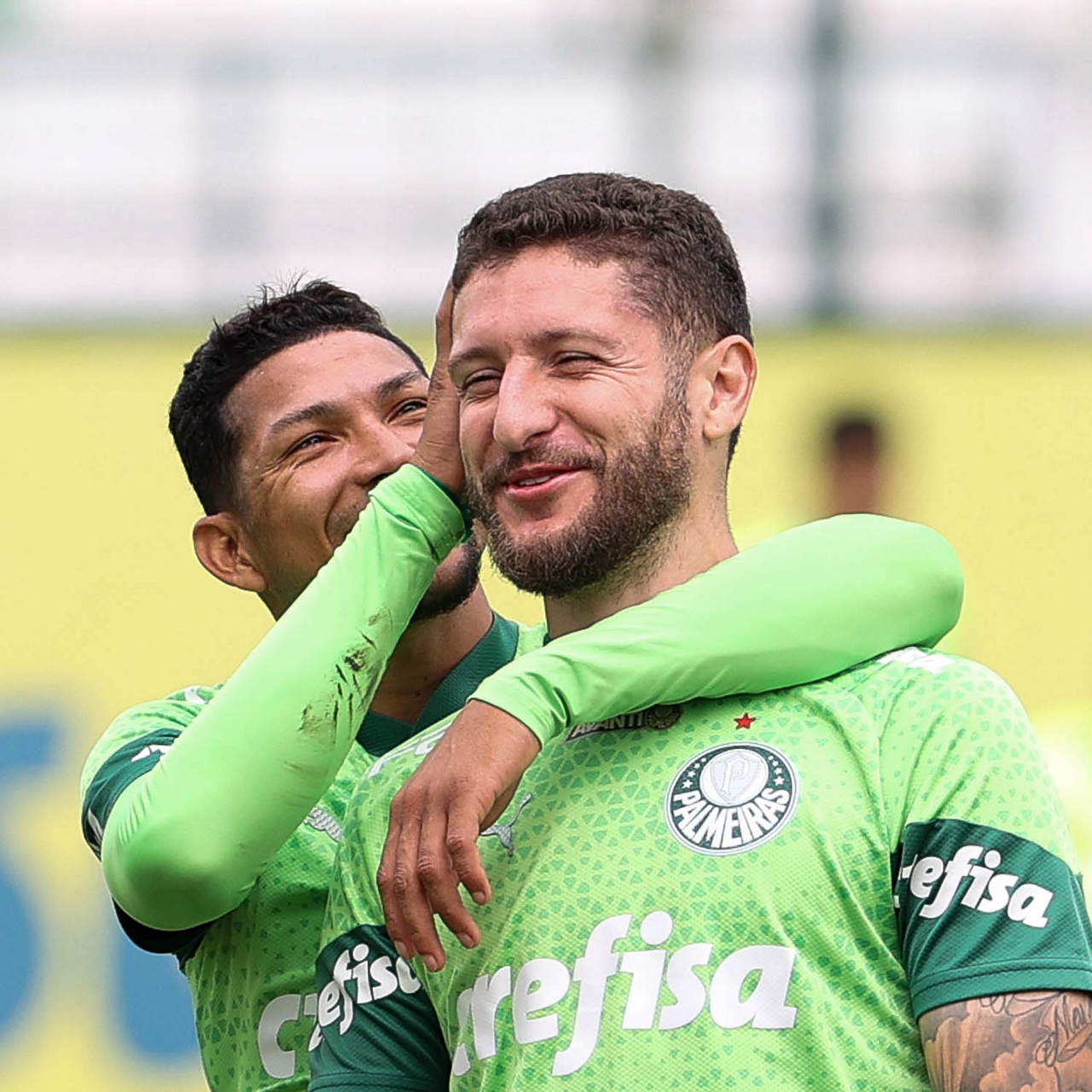 Os jogadores Rony e Zé Rafael (D), da SE Palmeiras, durante treinamento, na Academia de Futebol. (Foto: Cesar Greco/Palmeiras/by Canon)