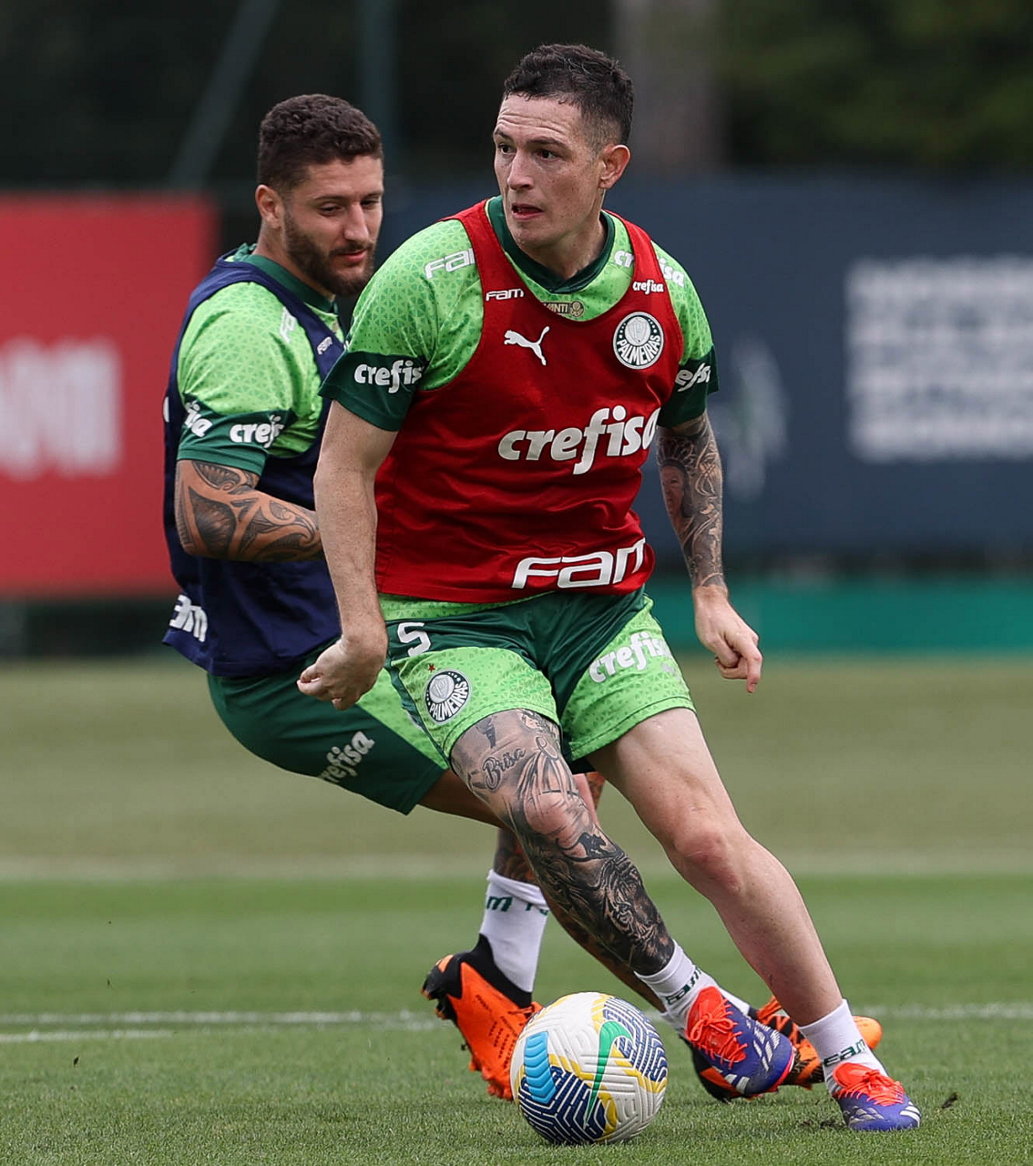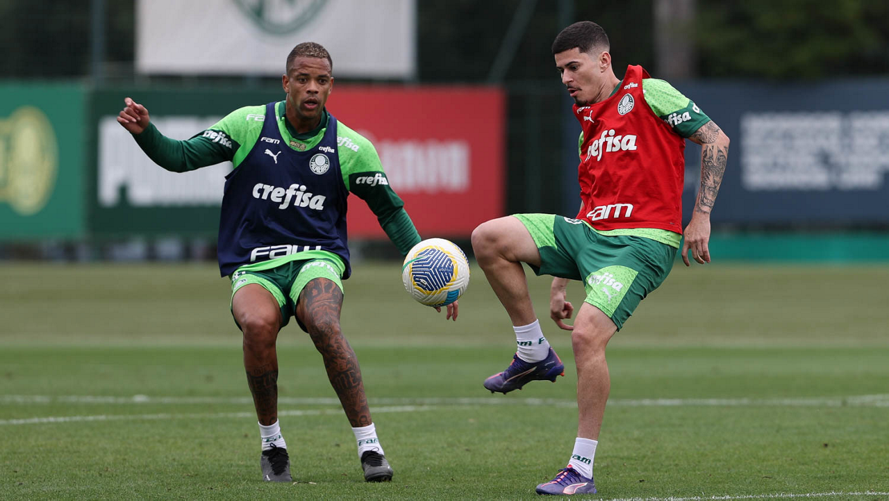 Os jogadores Rikelme e Caio Paulista (D), da SE Palmeiras, durante treinamento, na Academia de Futebol. (Foto: Cesar Greco/Palmeiras/by Canon)