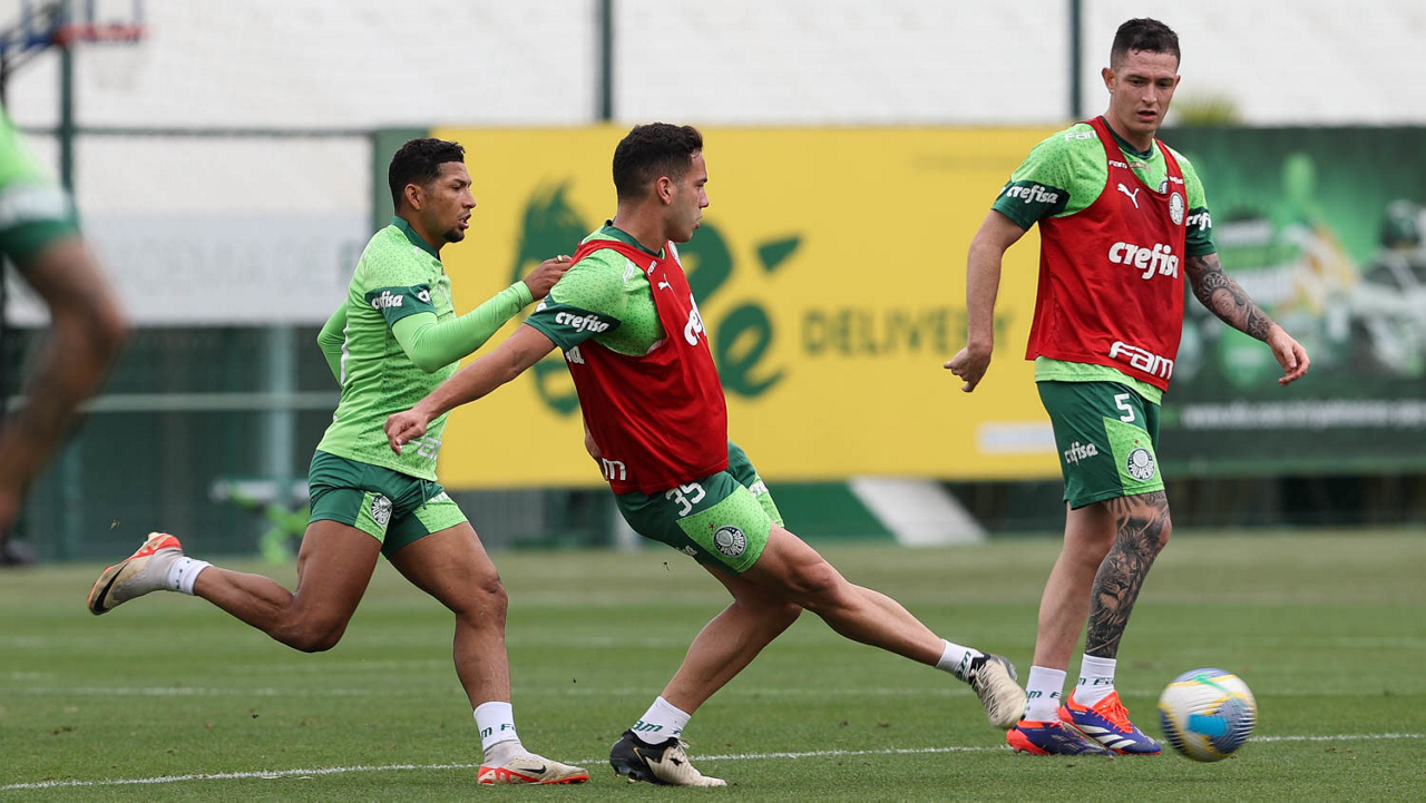 Os jogadores Raphael Veiga, Lázaro e Zé Rafael (E/D), da SE Palmeiras, durante treinamento, na Academia de Futebol. (Foto: Cesar Greco/Palmeiras/by Canon)