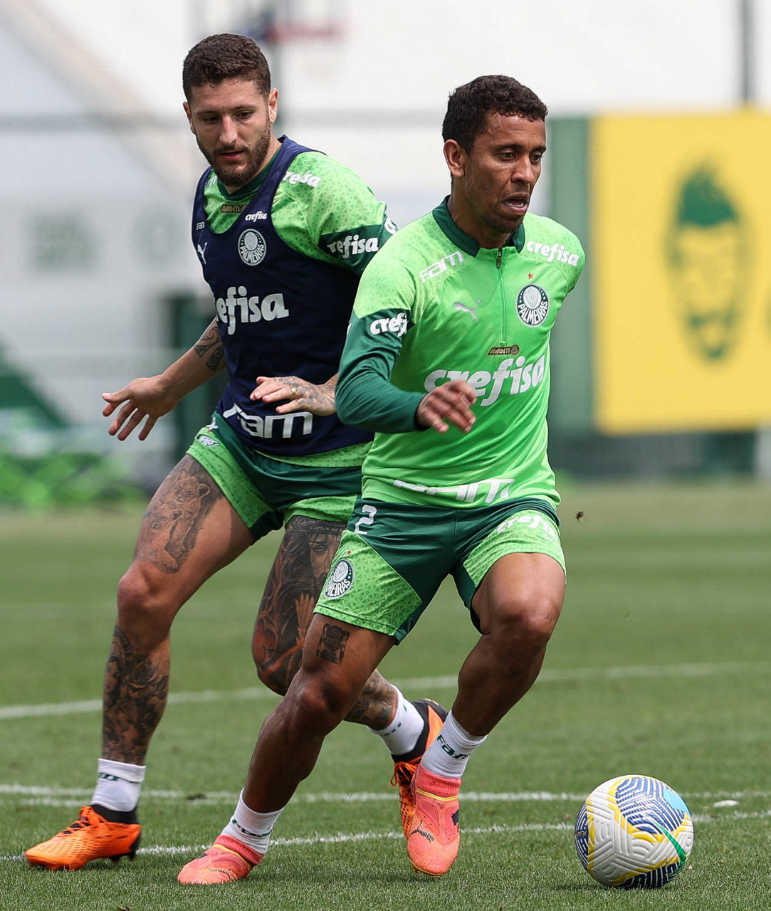 Os jogadores Marcos Rocha e Zé Rafael (D), da SE Palmeiras, durante treinamento, na Academia de Futebol. (Foto: Cesar Greco/Palmeiras/by Canon)