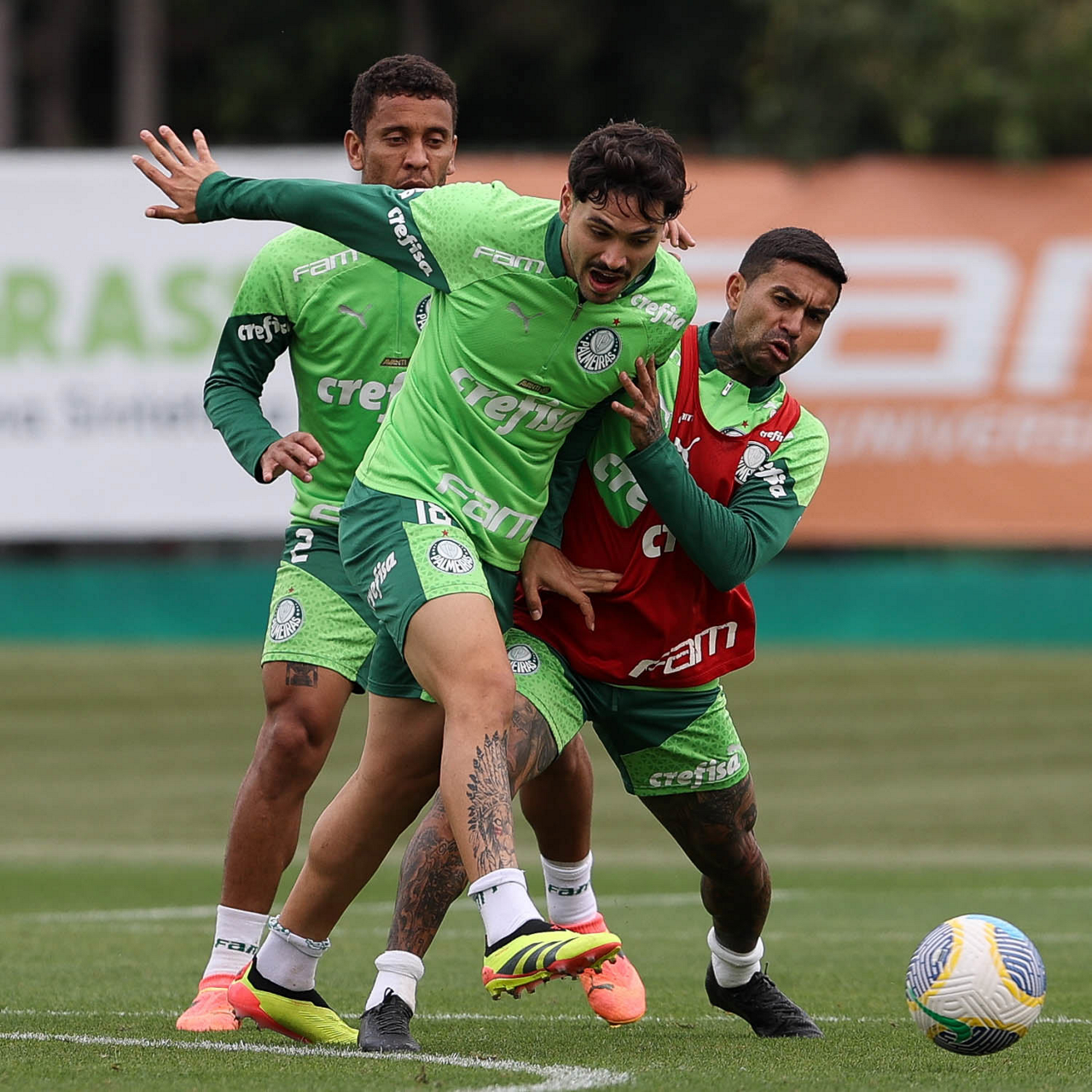 Os jogadores Caio Paulista, Mauricio e Fabinho (E/D), da SE Palmeiras, durante treinamento, na Academia de Futebol. (Foto: Cesar Greco/Palmeiras/by Canon)