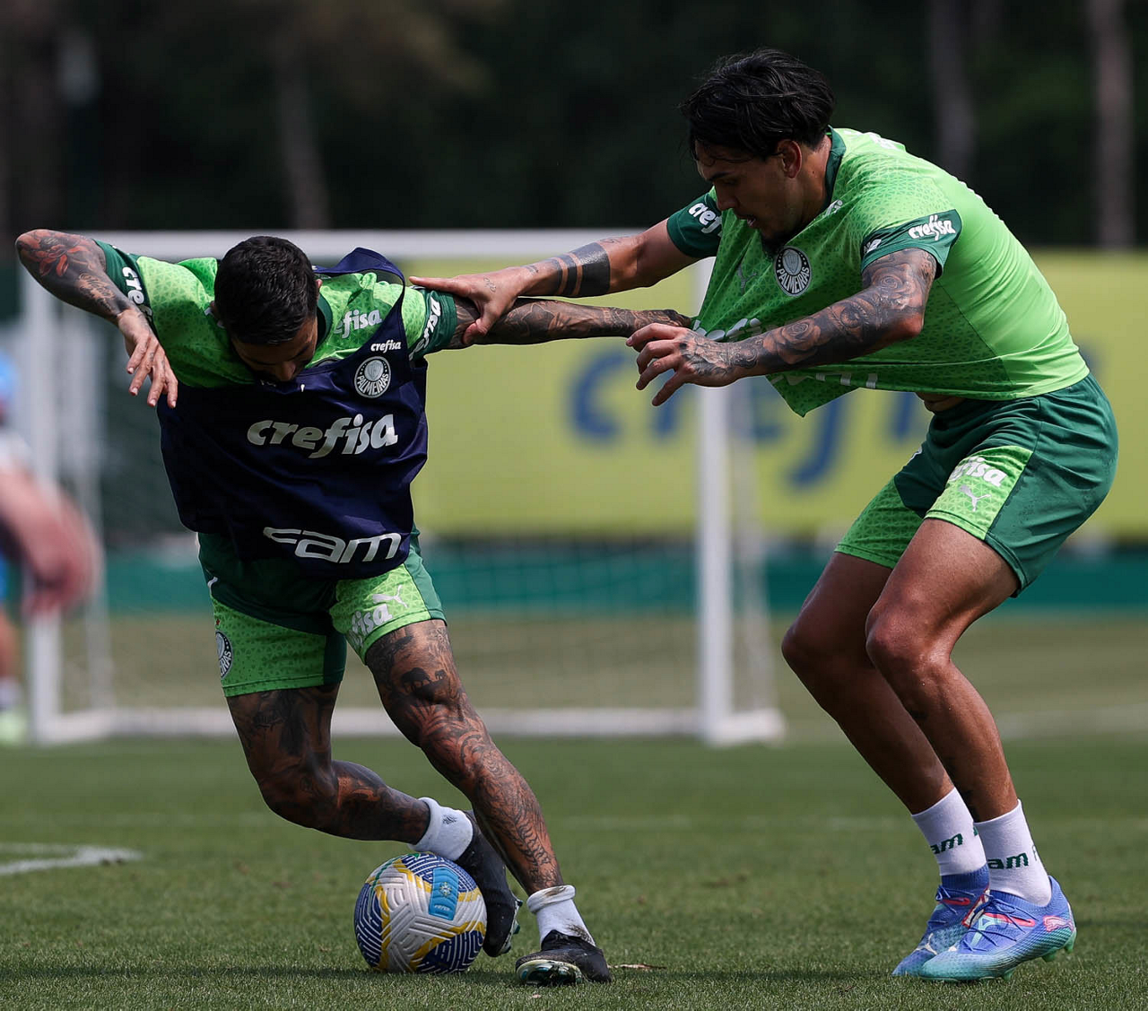 Os jogadores Dudu e Gustavo Gómez (D), da SE Palmeiras, durante treinamento, na Academia de Futebol. (Foto: Cesar Greco/Palmeiras/by Canon)