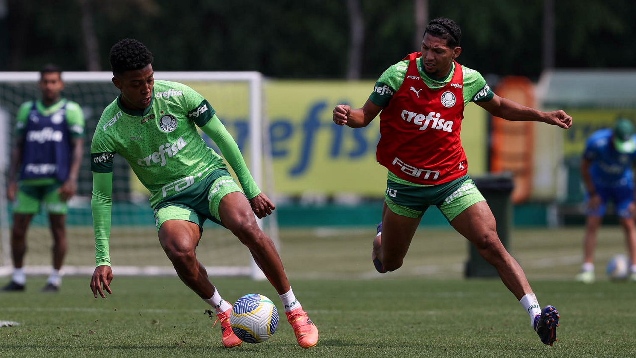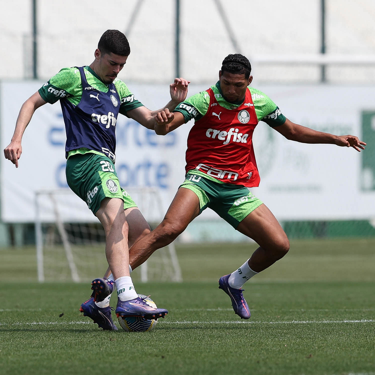 Os jogadores Murilo e Rony (D), da SE Palmeiras, durante treinamento, na Academia de Futebol. (Foto: Cesar Greco/Palmeiras/by Canon)