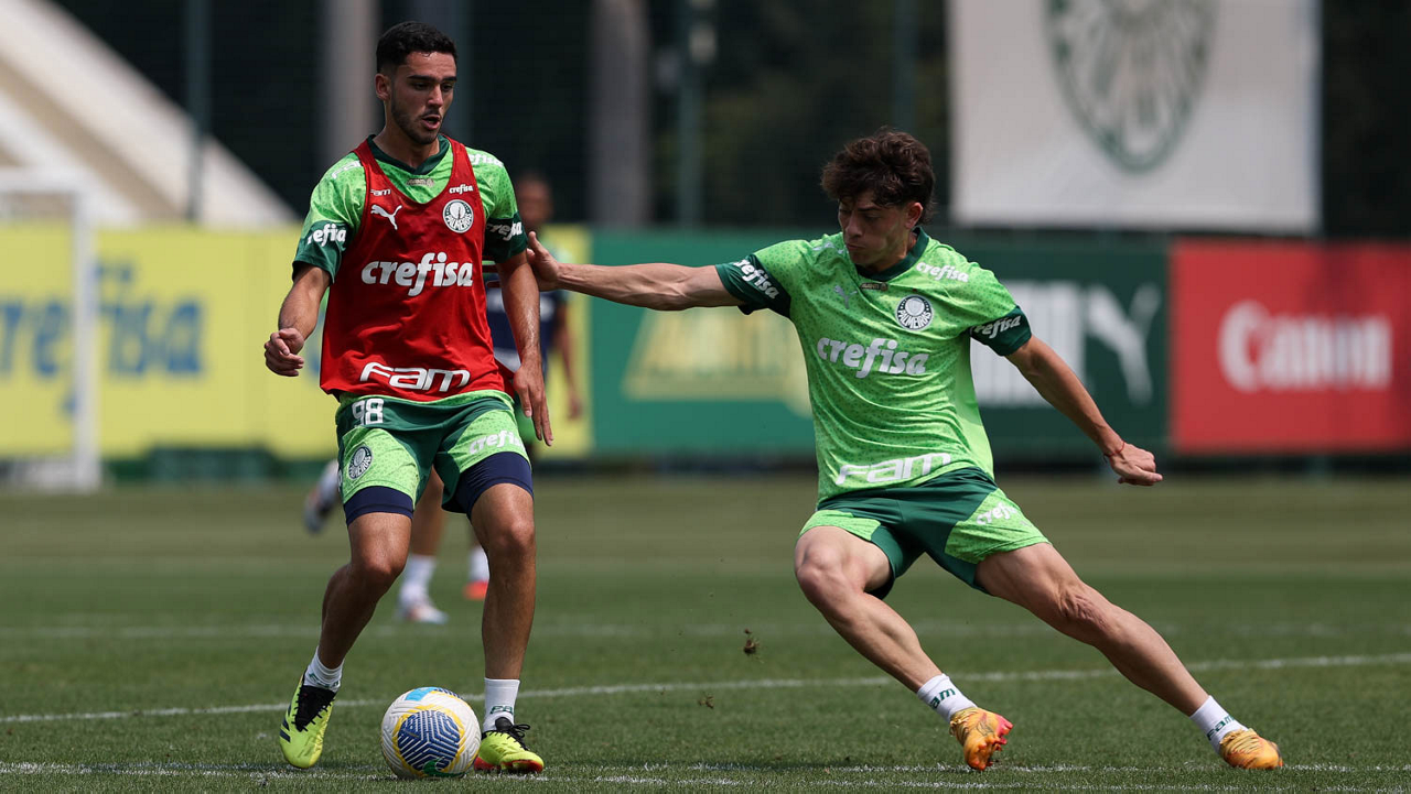 Os jogadores Figueiredo e Agustín Giay (D), da SE Palmeiras, durante treinamento, na Academia de Futebol. (Foto: Cesar Greco/Palmeiras/by Canon)