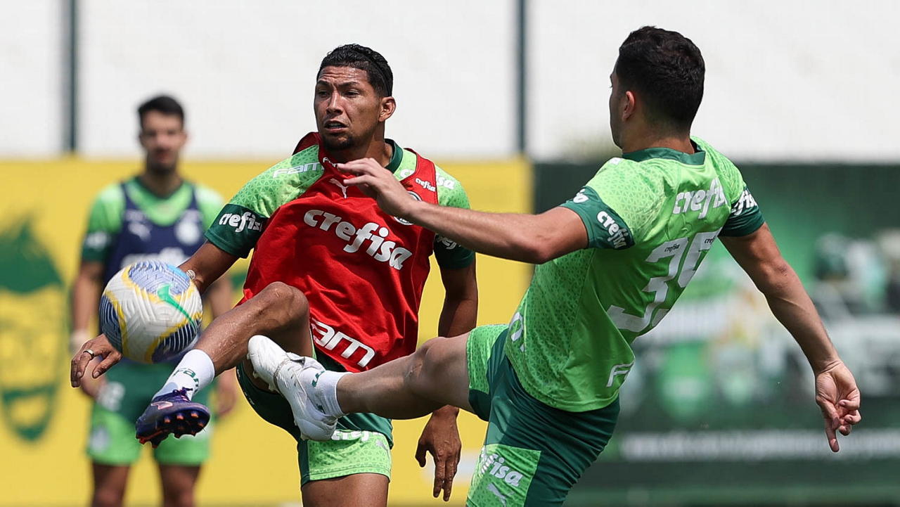 Os jogadores Rômulo e Rony (D), da SE Palmeiras, durante treinamento, na Academia de Futebol. (Foto: Cesar Greco/Palmeiras/by Canon)
