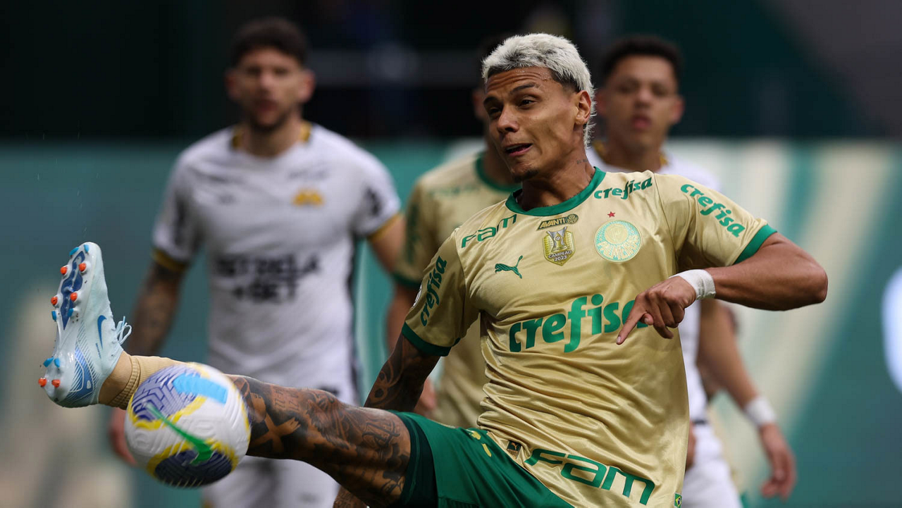 O jogador Raphael Veiga, da SE Palmeiras, cobra falta para marcar seu gol contra a eqiupe do Criciúma EC, durante partida válida pela vigésima sexta rodada, do Campeonato Brasileiro, Série A, na arena Allianz Parque. (Foto: Cesar Greco/Palmeiras/by Canon)