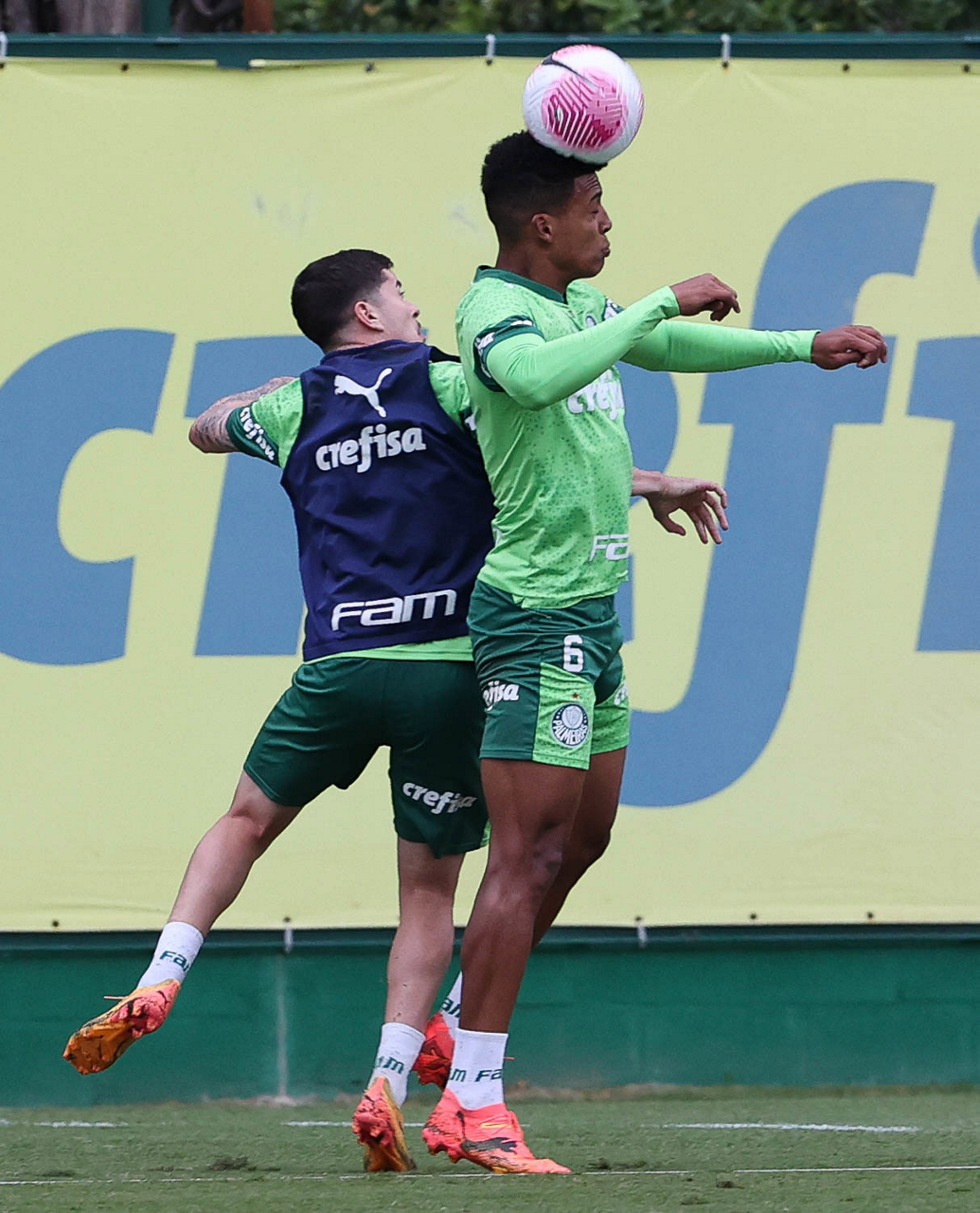 Os jogadores Vitor Reis e Lázaro (D), da SE Palmeiras, durante treinamento, na Academia de Futebol. (Foto: Cesar Greco/Palmeiras/by Canon)
