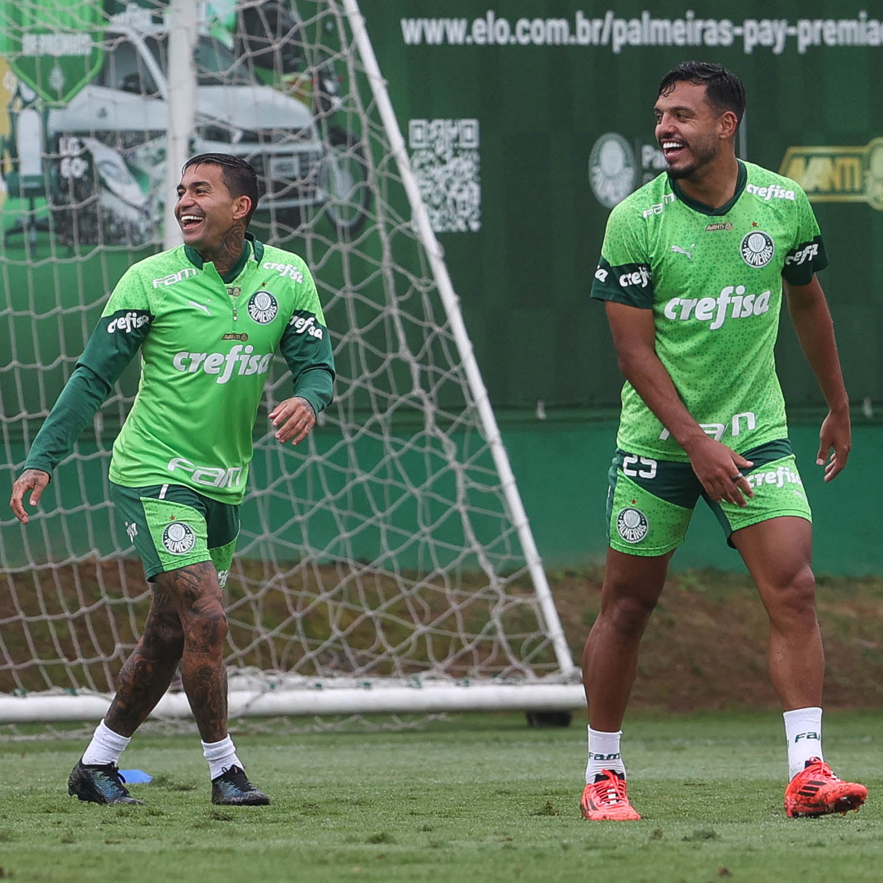 Os jogadores Dudu e Gabriel Menino (D), da SE Palmeiras, durante treinamento, na Academia de Futebol. (Foto: Cesar Greco/Palmeiras/by Canon)