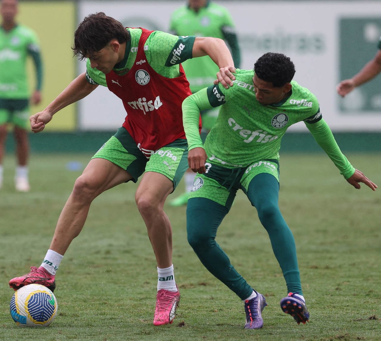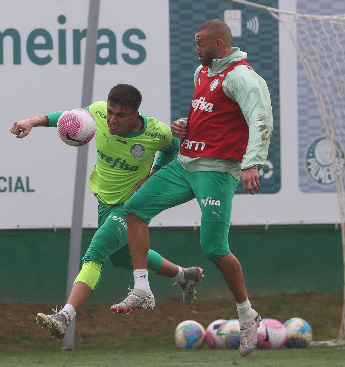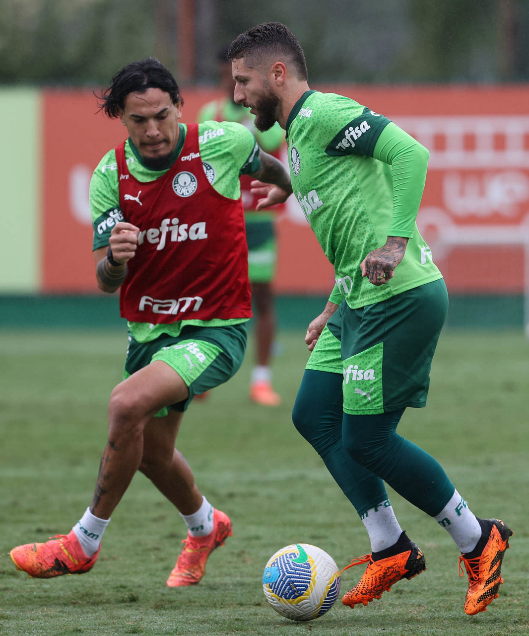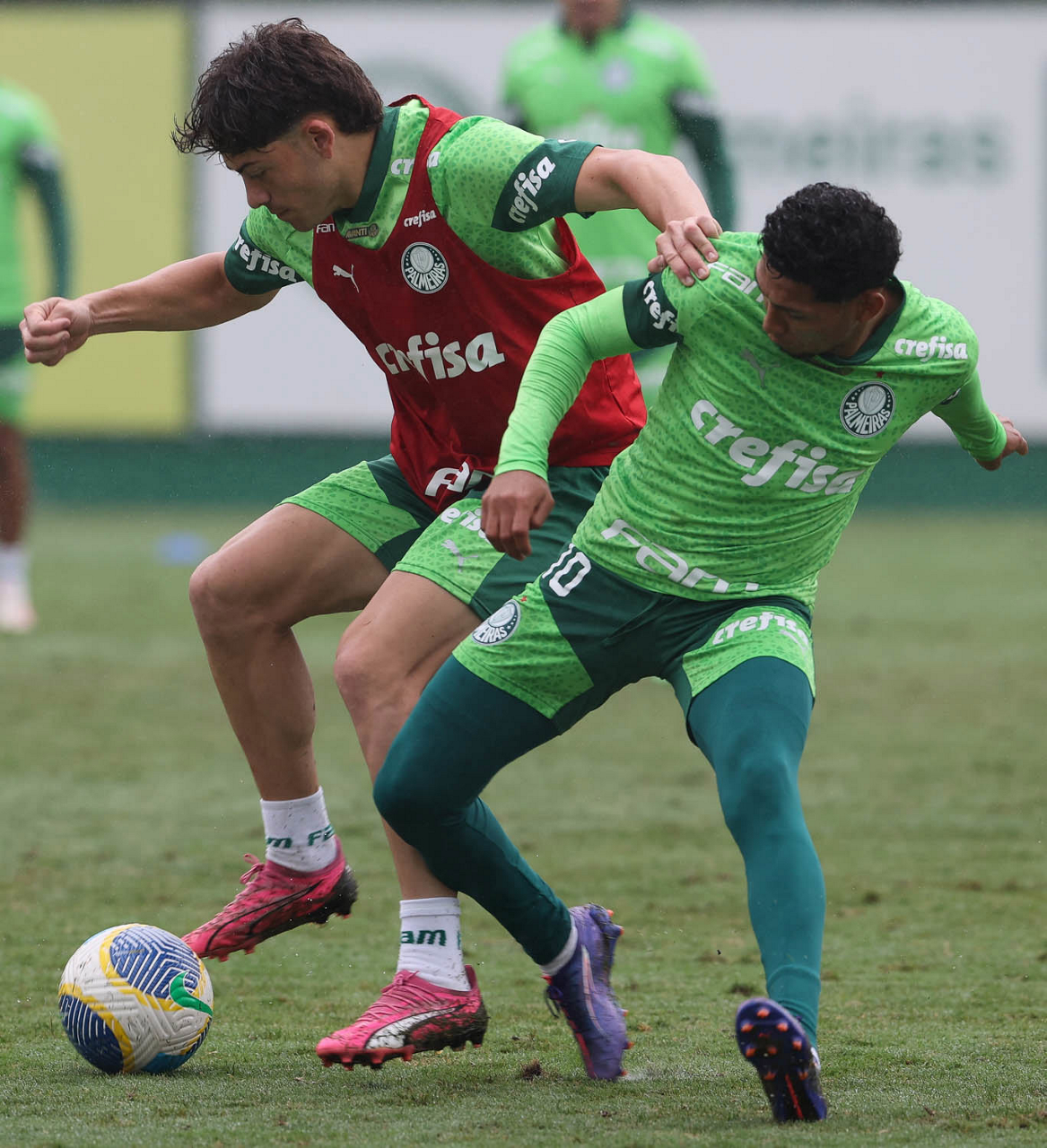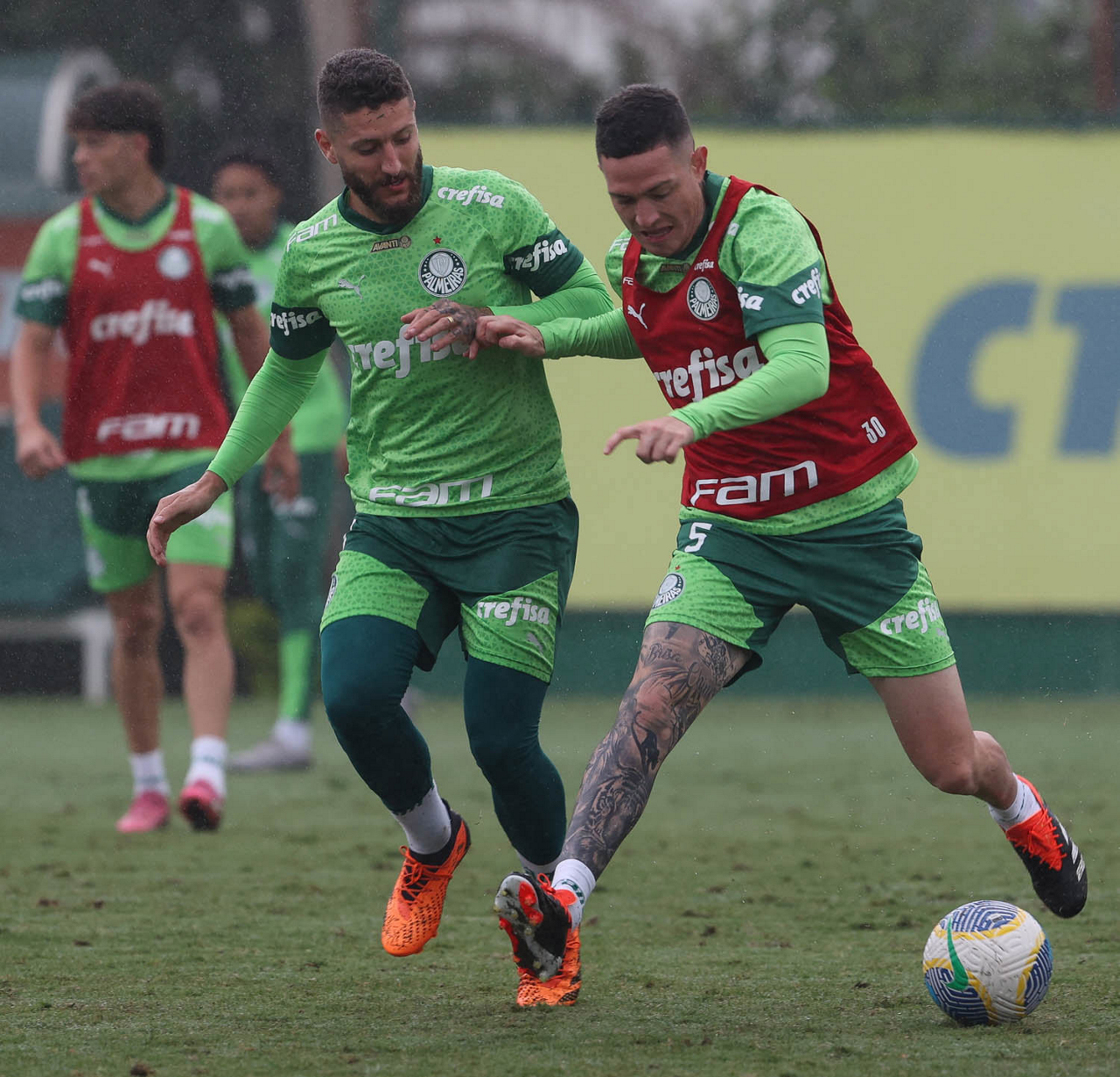 Os jogadores Vitor Reis e Zé Rafael (D), da SE Palmeiras, durante treinamento, na Academia de Futebol. (Foto: Cesar Greco/Palmeiras/by Canon)