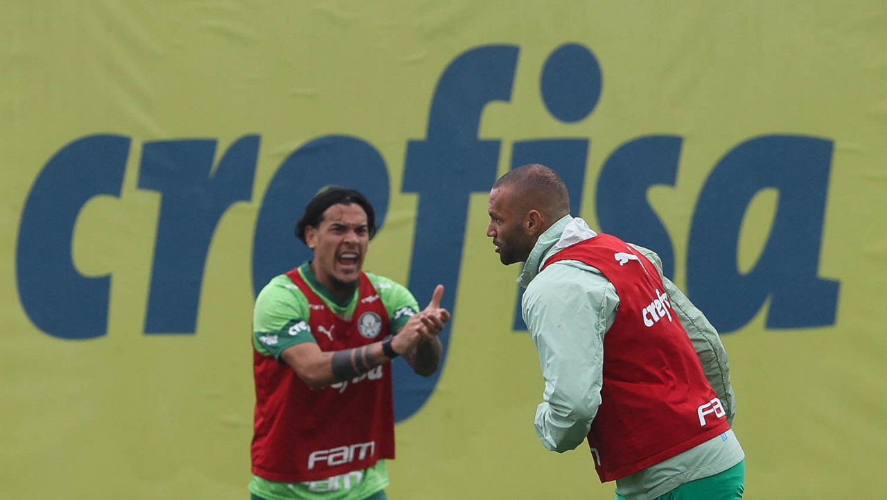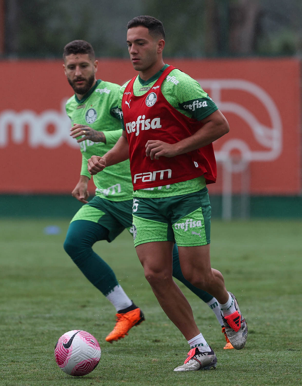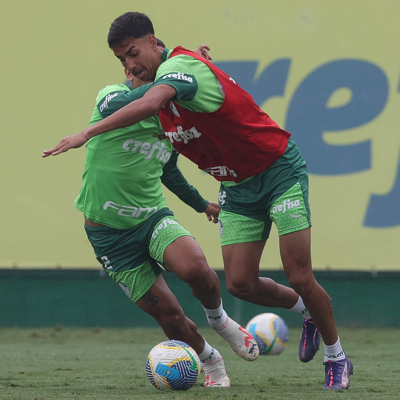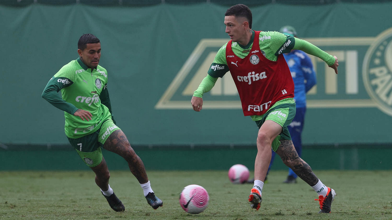 Os jogadores Richard Ríos e Felipe Anderson (D), da SE Palmeiras, durante treinamento, na Academia de Futebol. (Foto: Cesar Greco/Palmeiras/by Canon)
