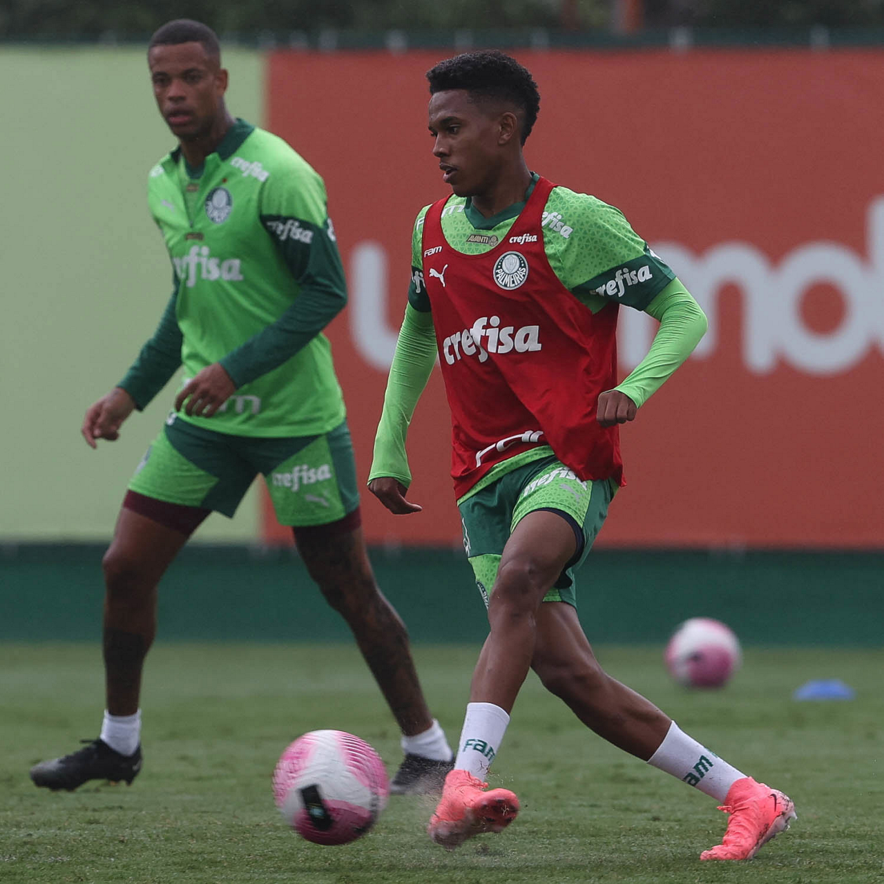 Os jogadores Estêvão e Caio Paulista (D), da SE Palmeiras, durante treinamento, na Academia de Futebol. (Foto: Cesar Greco/Palmeiras/by Canon)