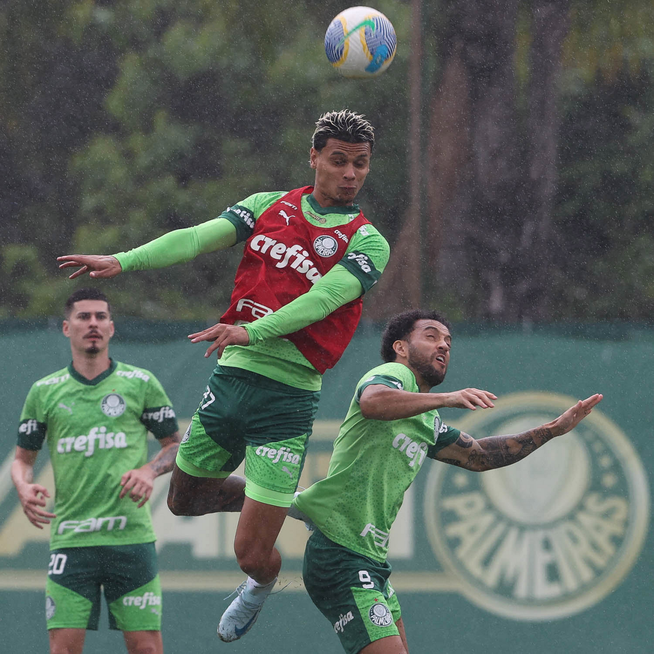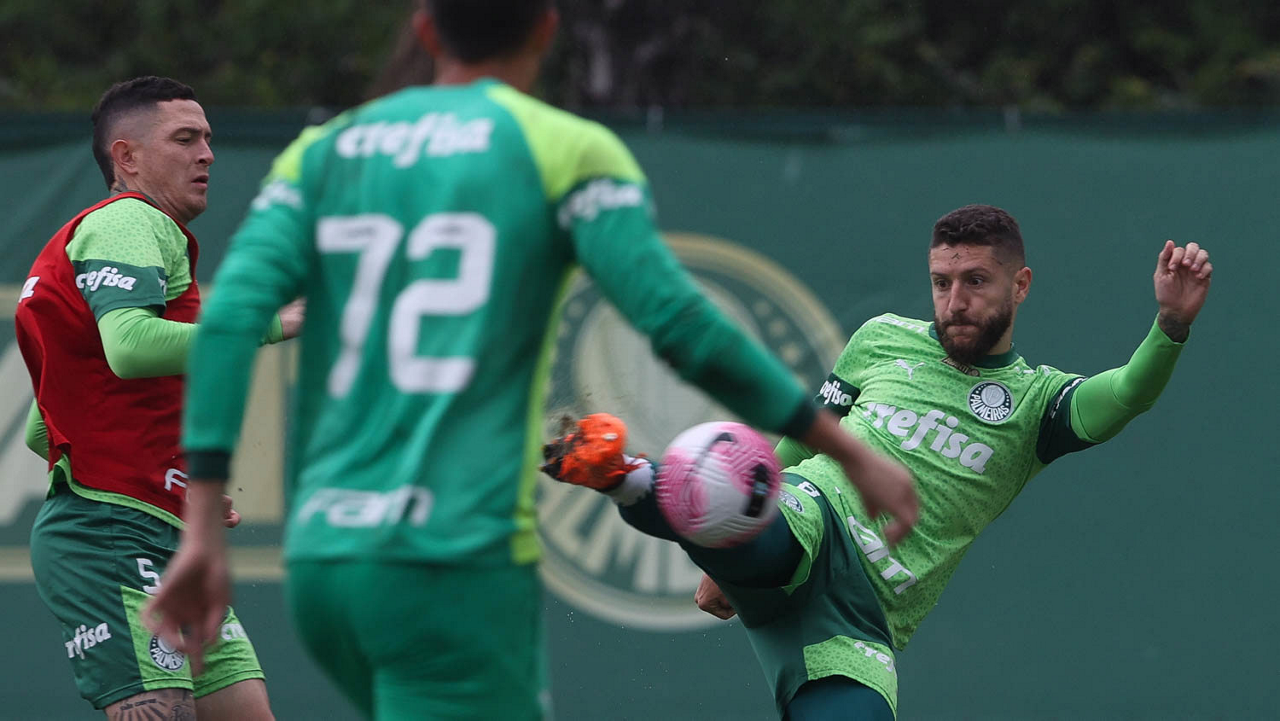 Os jogadores Rômulo, Marcelo Lomba e Richard Ríos (E/D), da SE Palmeiras, durante treinamento, na Academia de Futebol. (Foto: Cesar Greco/Palmeiras/by Canon)