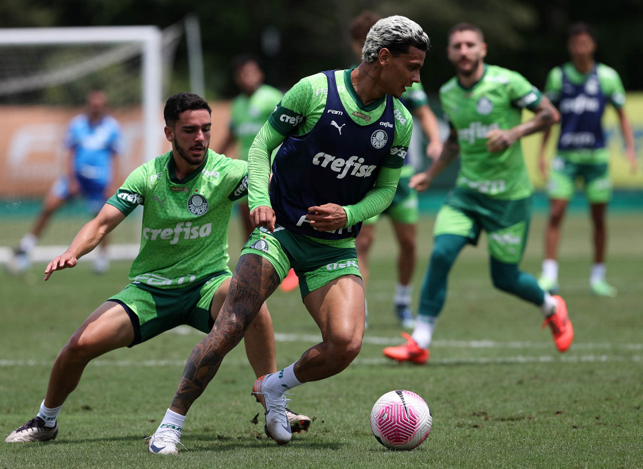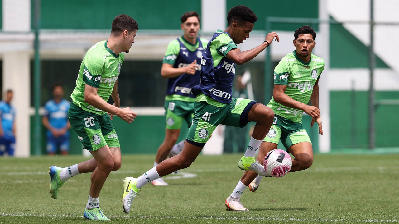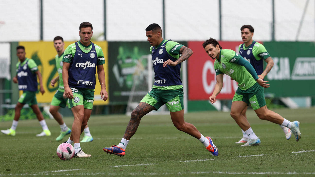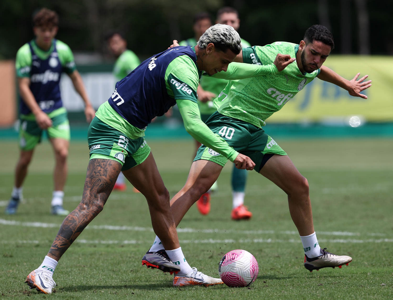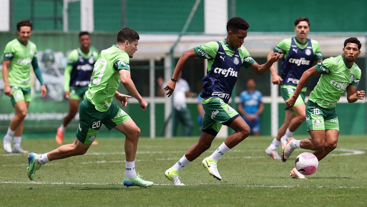 Os jogadores Gustavo Gómez, Vitor Reis, Flaco López, Mateus, Anibal Moreno, Naves, Richard Ríos e Fabinho (E/D em pé) e Agustín Giay, Estêvão, Mauricio, Vanderlan e Weverton (E/D agchados), da SE Palmeiras, durante treinamento, na Academia de Futebol. (Foto: Cesar Greco/Palmeiras/by Canon)