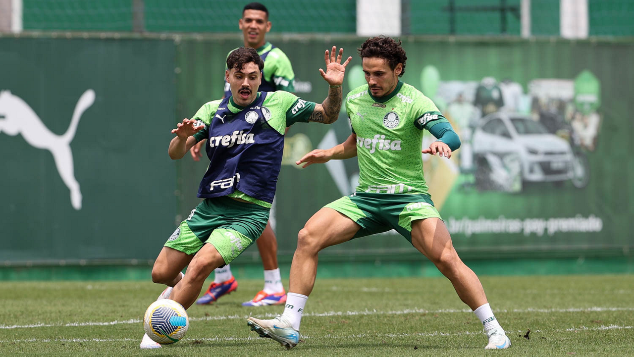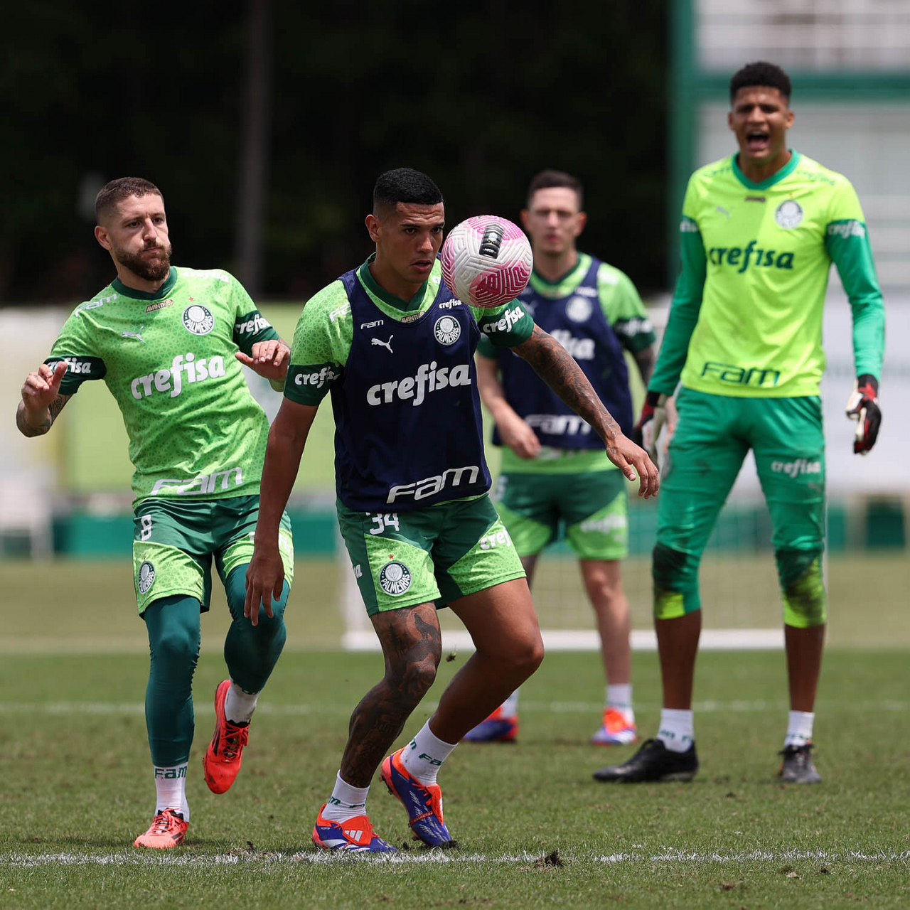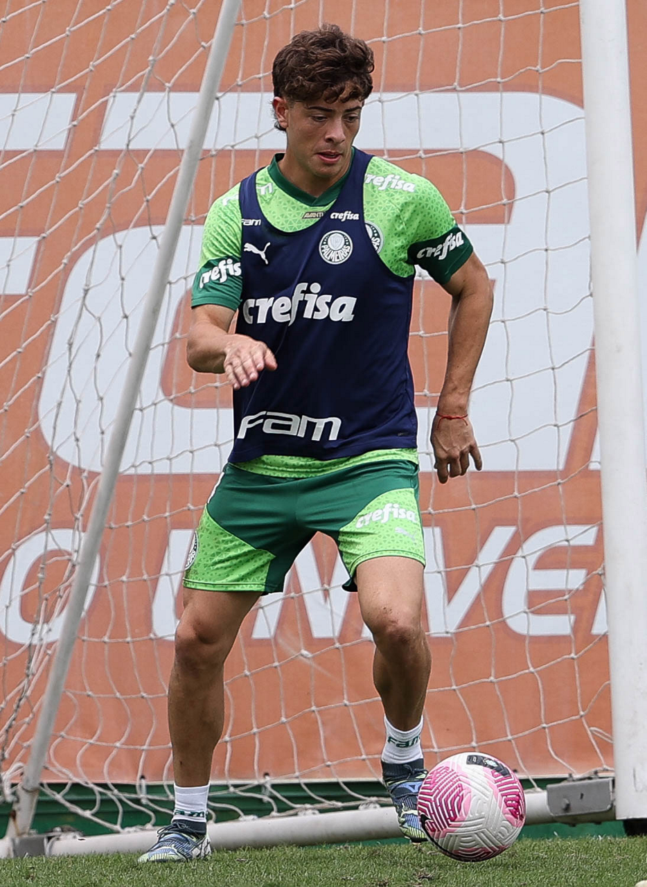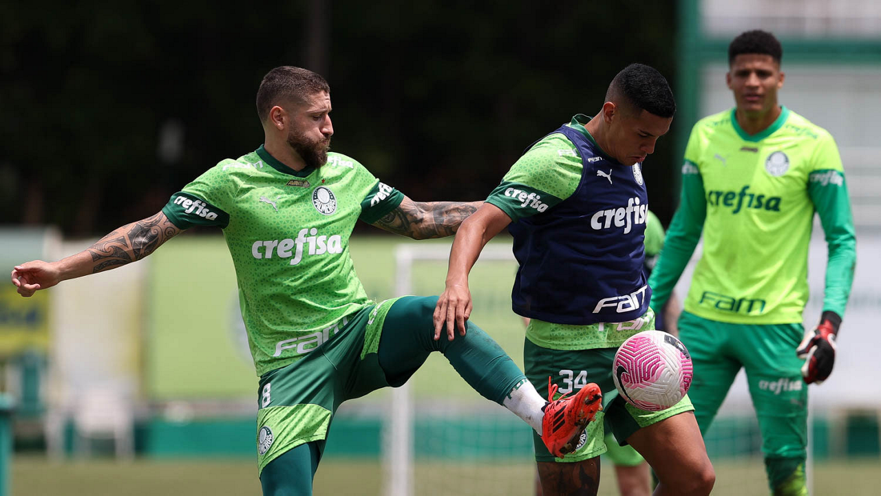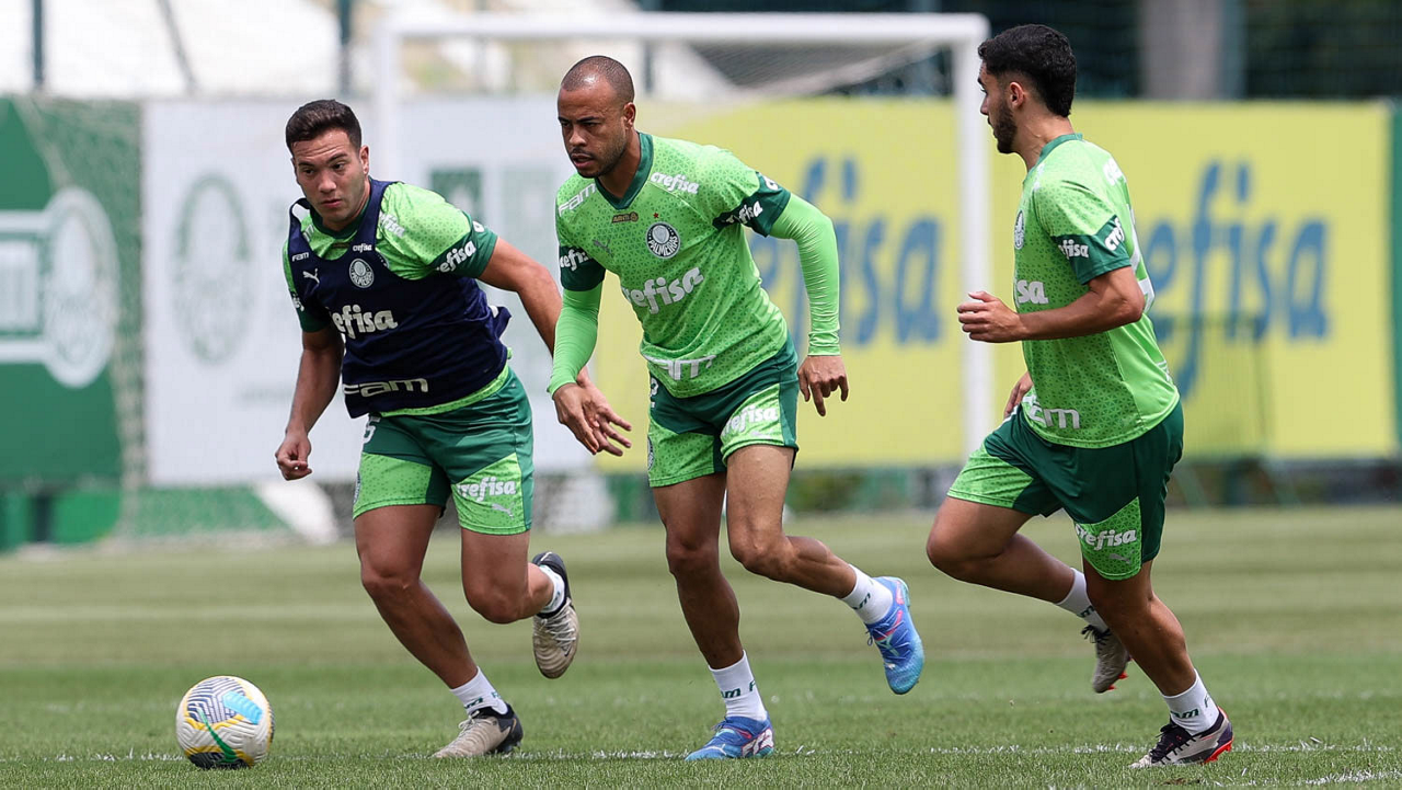 Os jogadores Gustavo Gómez, Vitor Reis, Flaco López, Mateus, Anibal Moreno, Naves, Richard Ríos e Fabinho (E/D em pé) e Agustín Giay, Estêvão, Mauricio, Vanderlan e Weverton (E/D agchados), da SE Palmeiras, durante treinamento, na Academia de Futebol. (Foto: Cesar Greco/Palmeiras/by Canon)