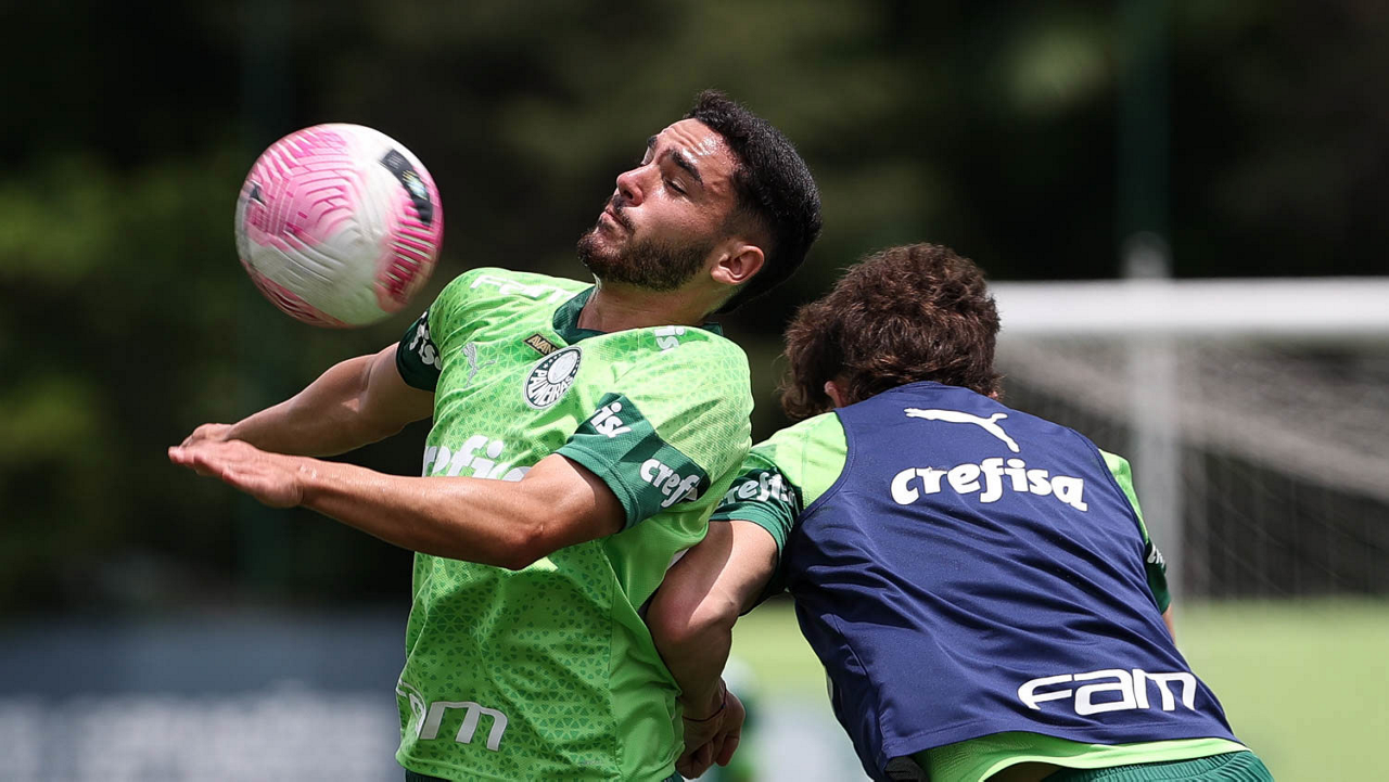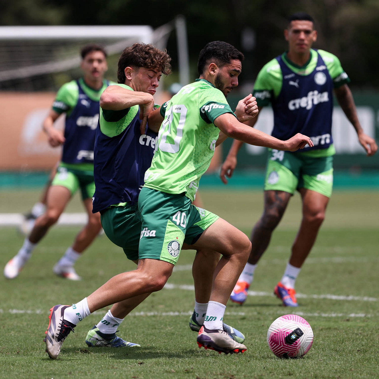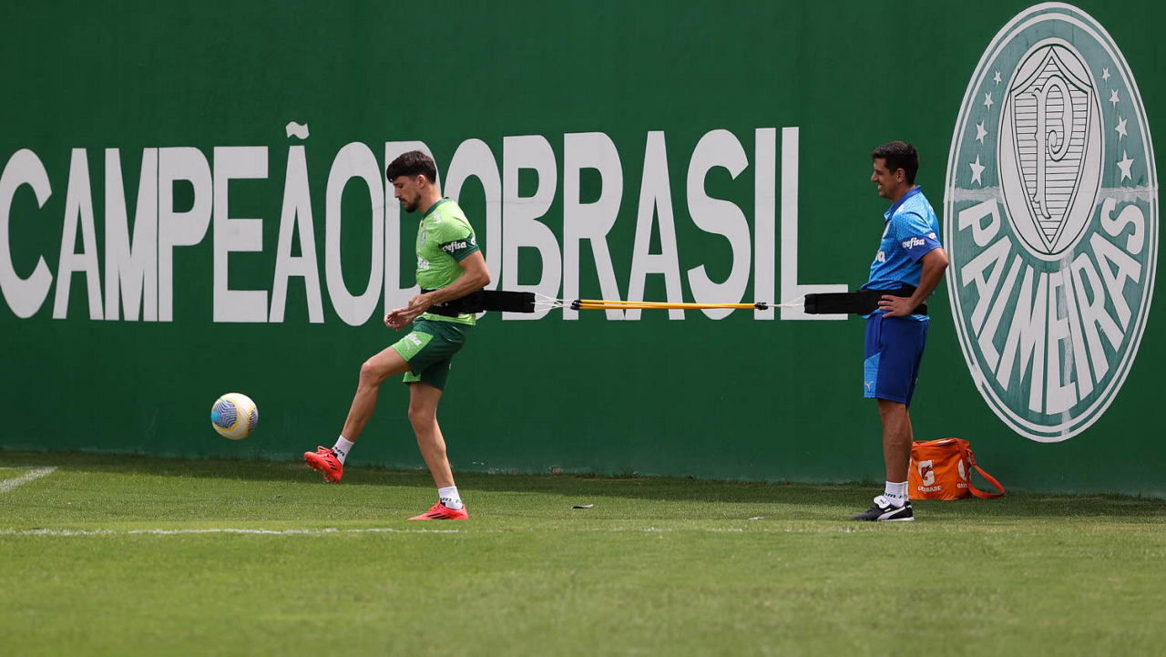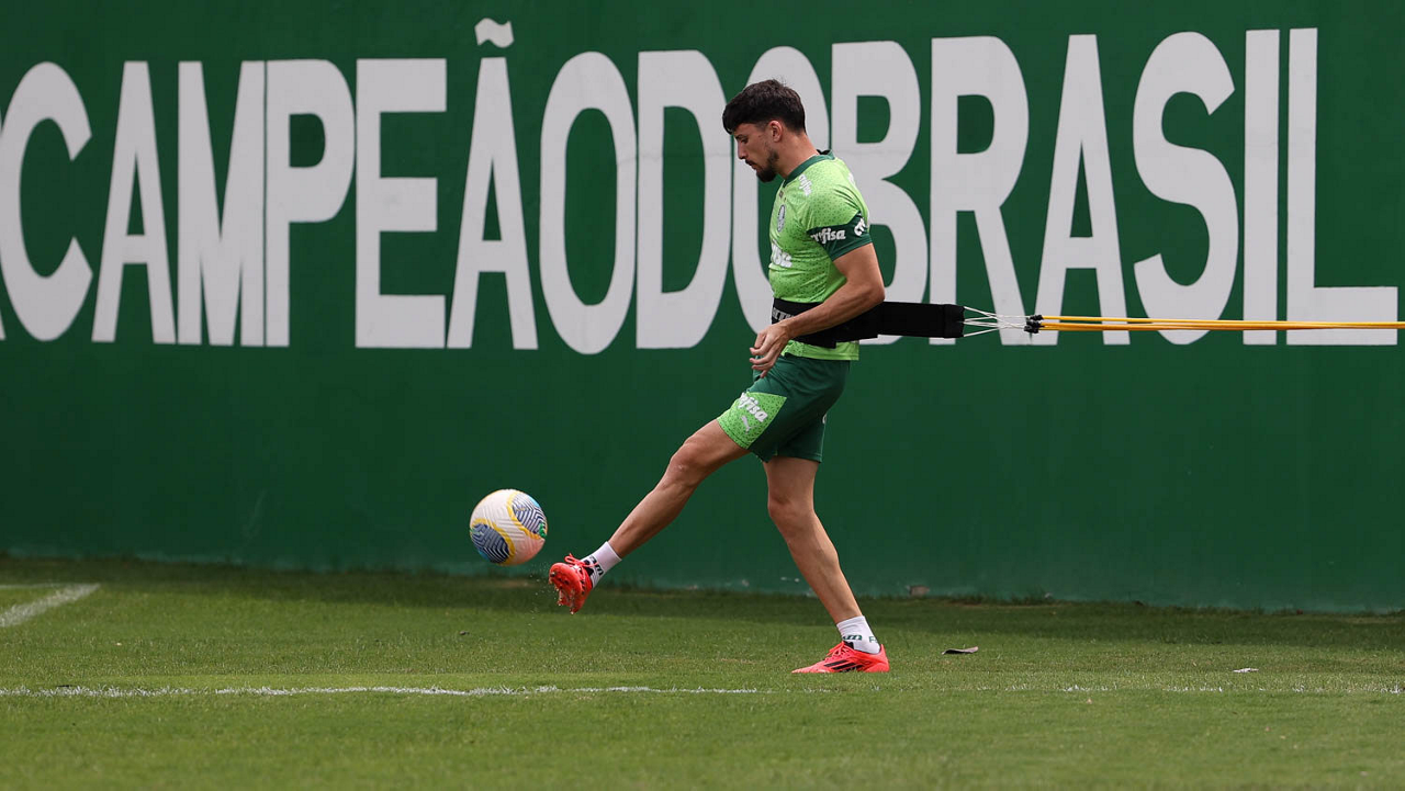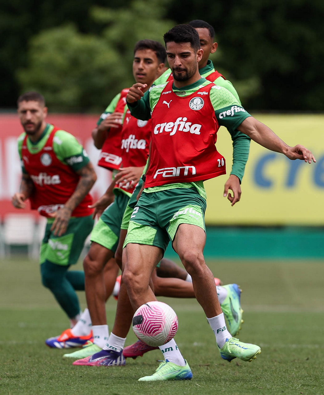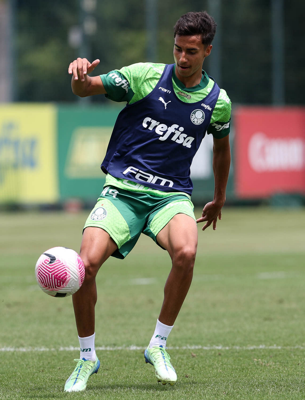 Os jogadores Gustavo Gómez, Vitor Reis, Flaco López, Mateus, Anibal Moreno, Naves, Richard Ríos e Fabinho (E/D em pé) e Agustín Giay, Estêvão, Mauricio, Vanderlan e Weverton (E/D agchados), da SE Palmeiras, durante treinamento, na Academia de Futebol. (Foto: Cesar Greco/Palmeiras/by Canon)