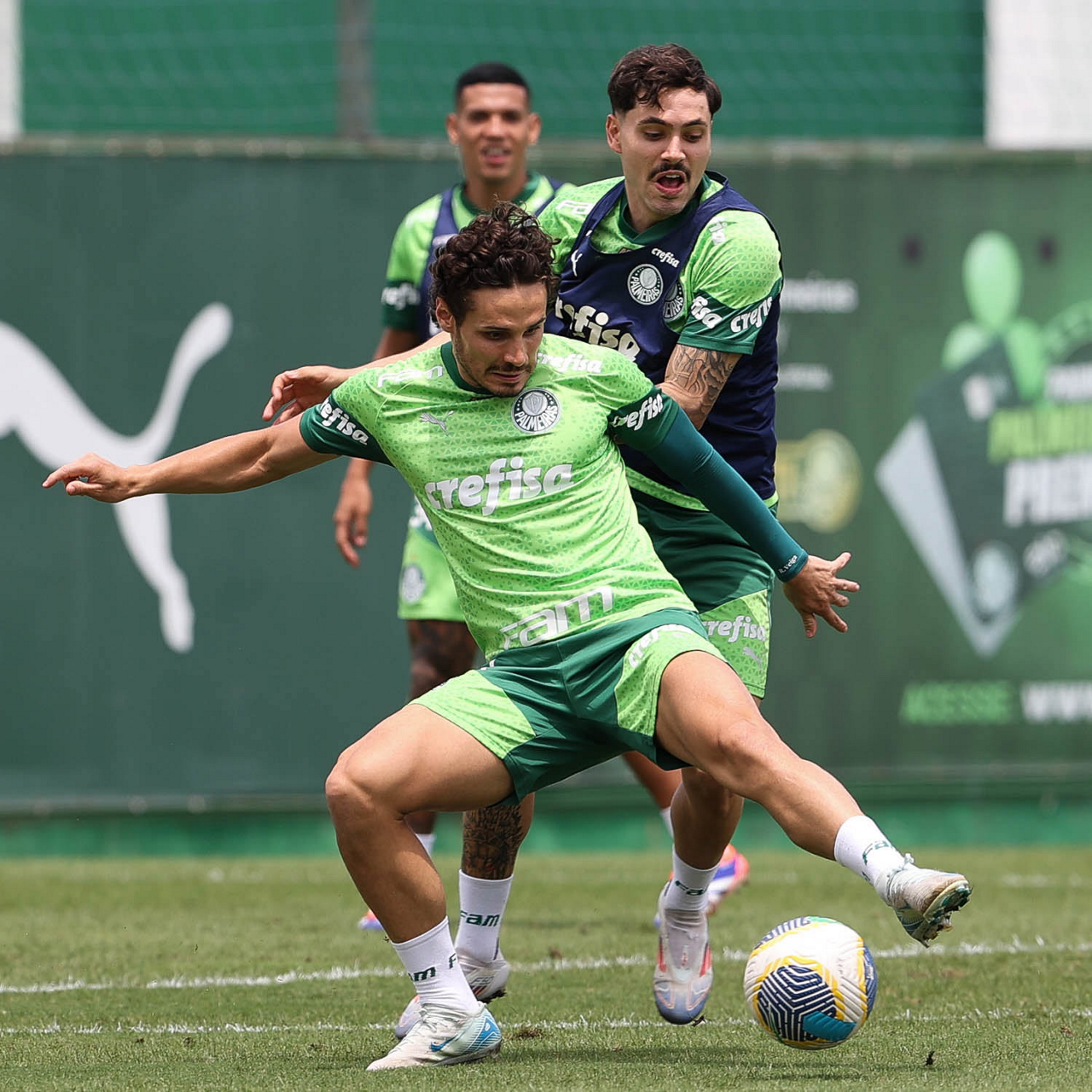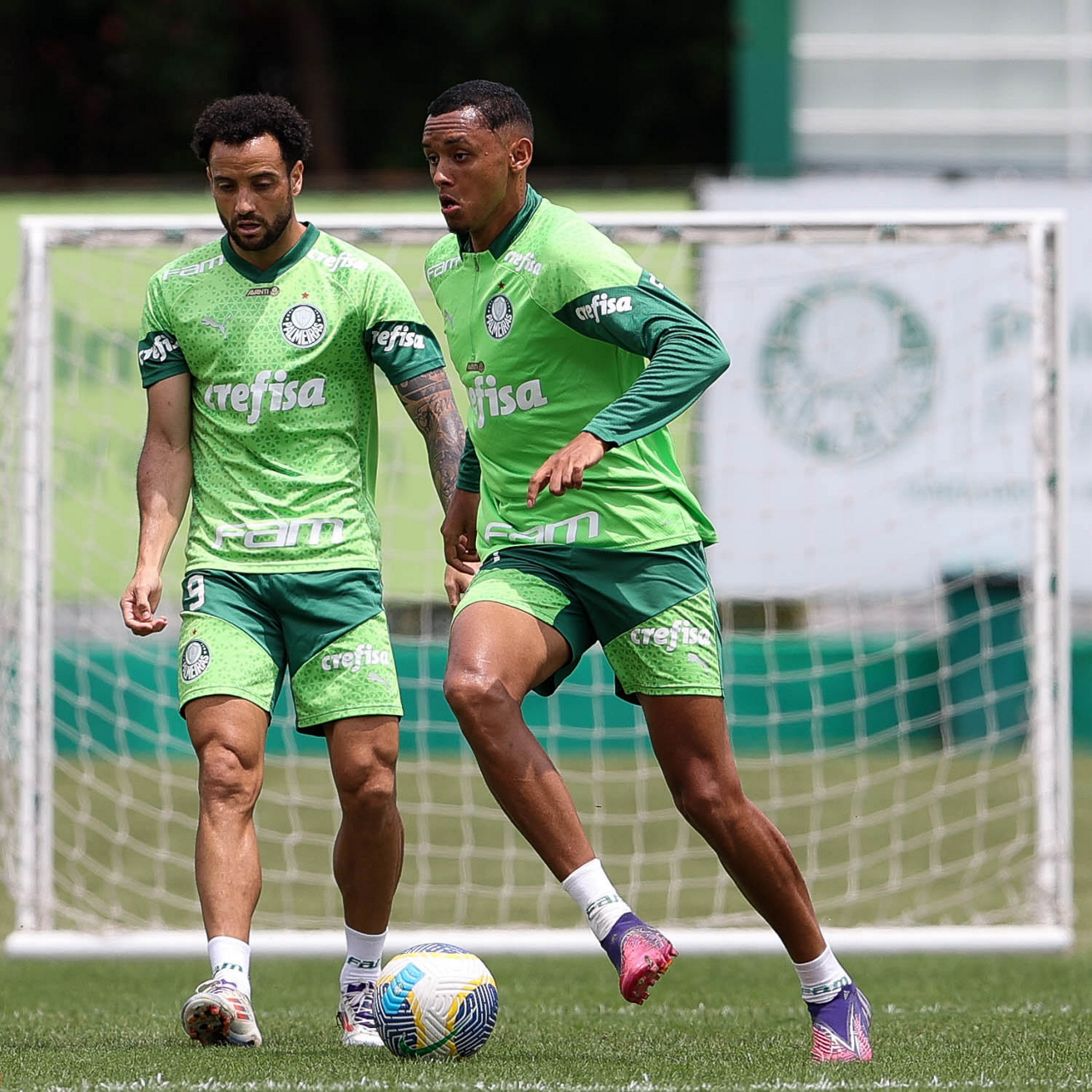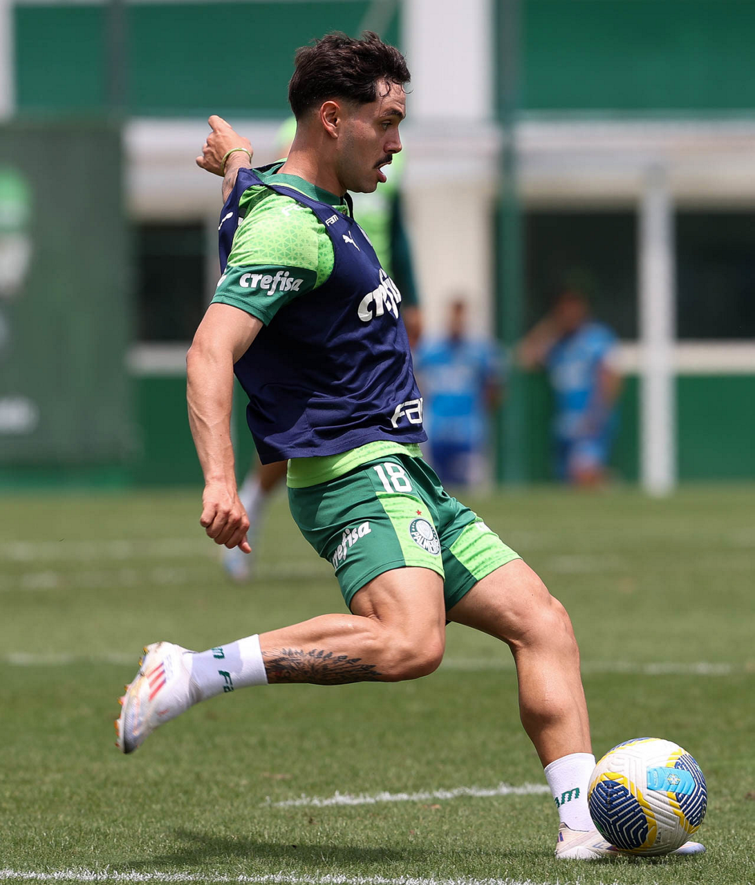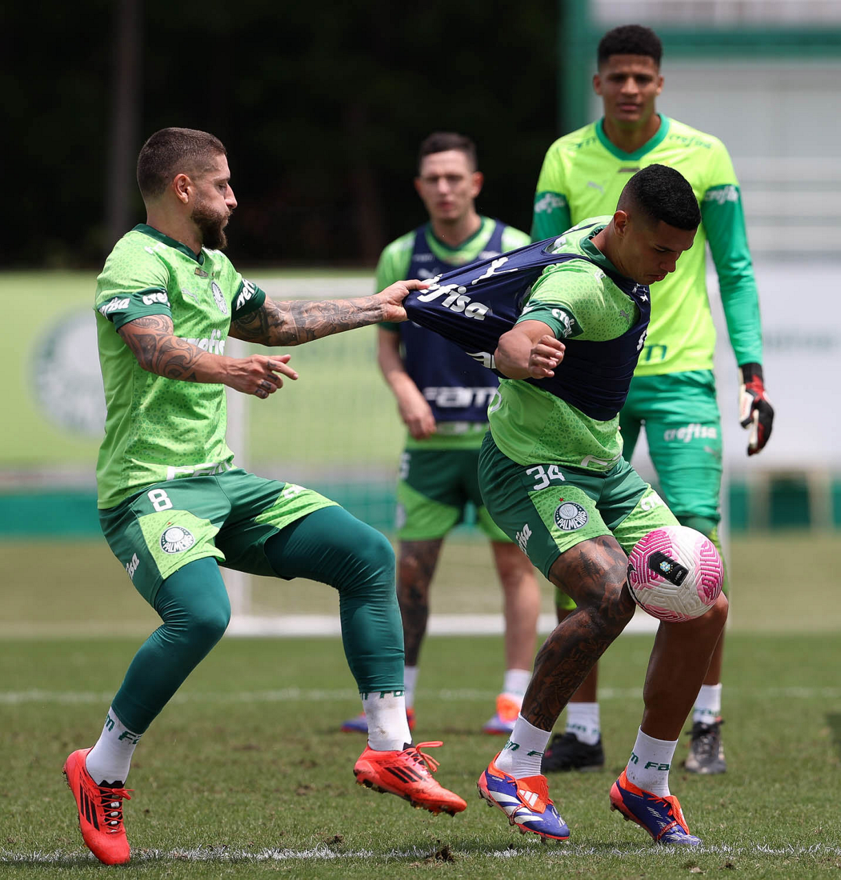 Os jogadores Gustavo Gómez, Vitor Reis, Flaco López, Mateus, Anibal Moreno, Naves, Richard Ríos e Fabinho (E/D em pé) e Agustín Giay, Estêvão, Mauricio, Vanderlan e Weverton (E/D agchados), da SE Palmeiras, durante treinamento, na Academia de Futebol. (Foto: Cesar Greco/Palmeiras/by Canon)