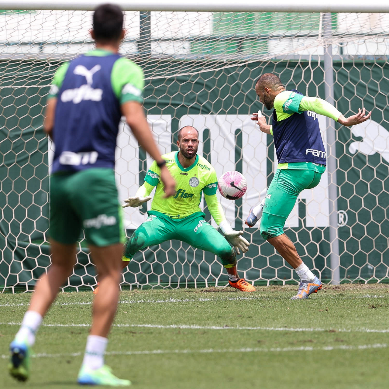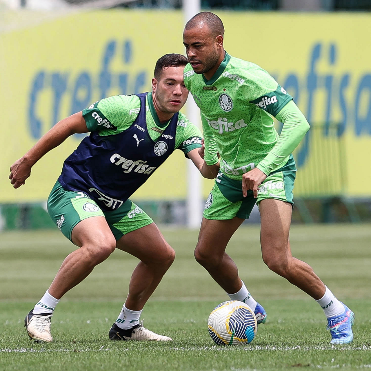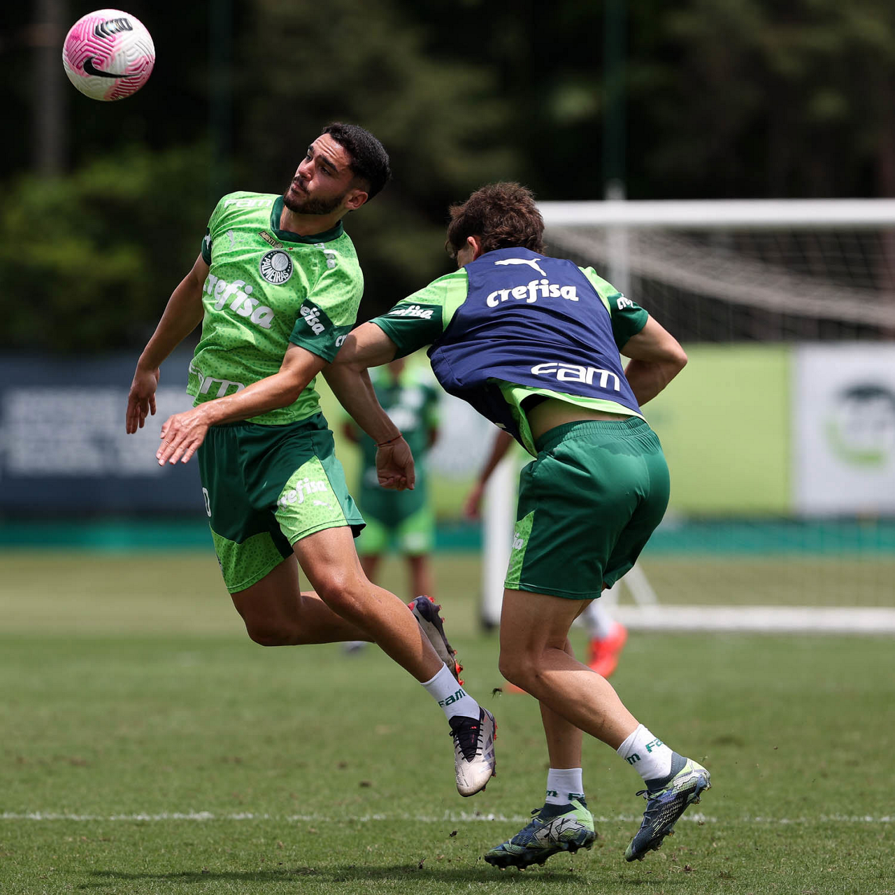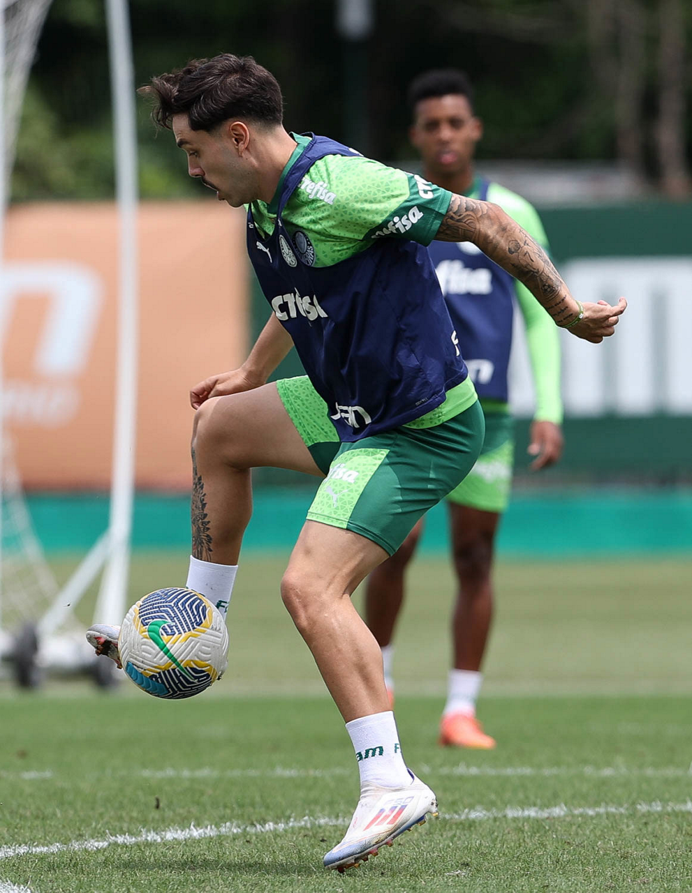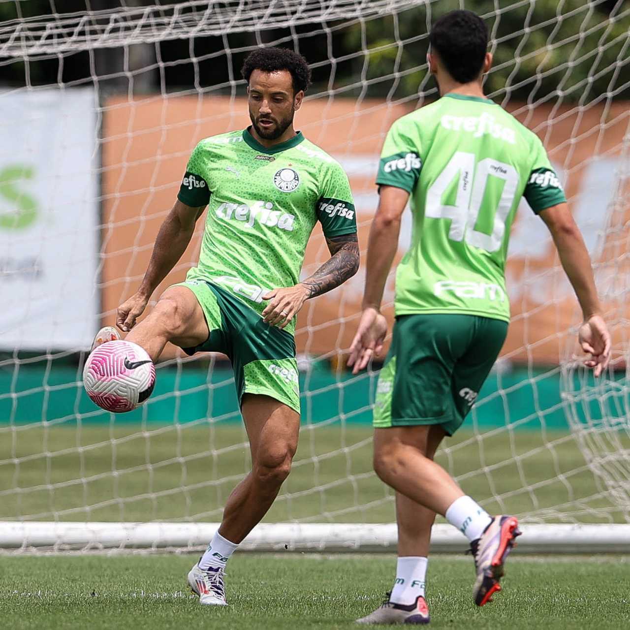 Os jogadores Gustavo Gómez, Vitor Reis, Flaco López, Mateus, Anibal Moreno, Naves, Richard Ríos e Fabinho (E/D em pé) e Agustín Giay, Estêvão, Mauricio, Vanderlan e Weverton (E/D agchados), da SE Palmeiras, durante treinamento, na Academia de Futebol. (Foto: Cesar Greco/Palmeiras/by Canon)