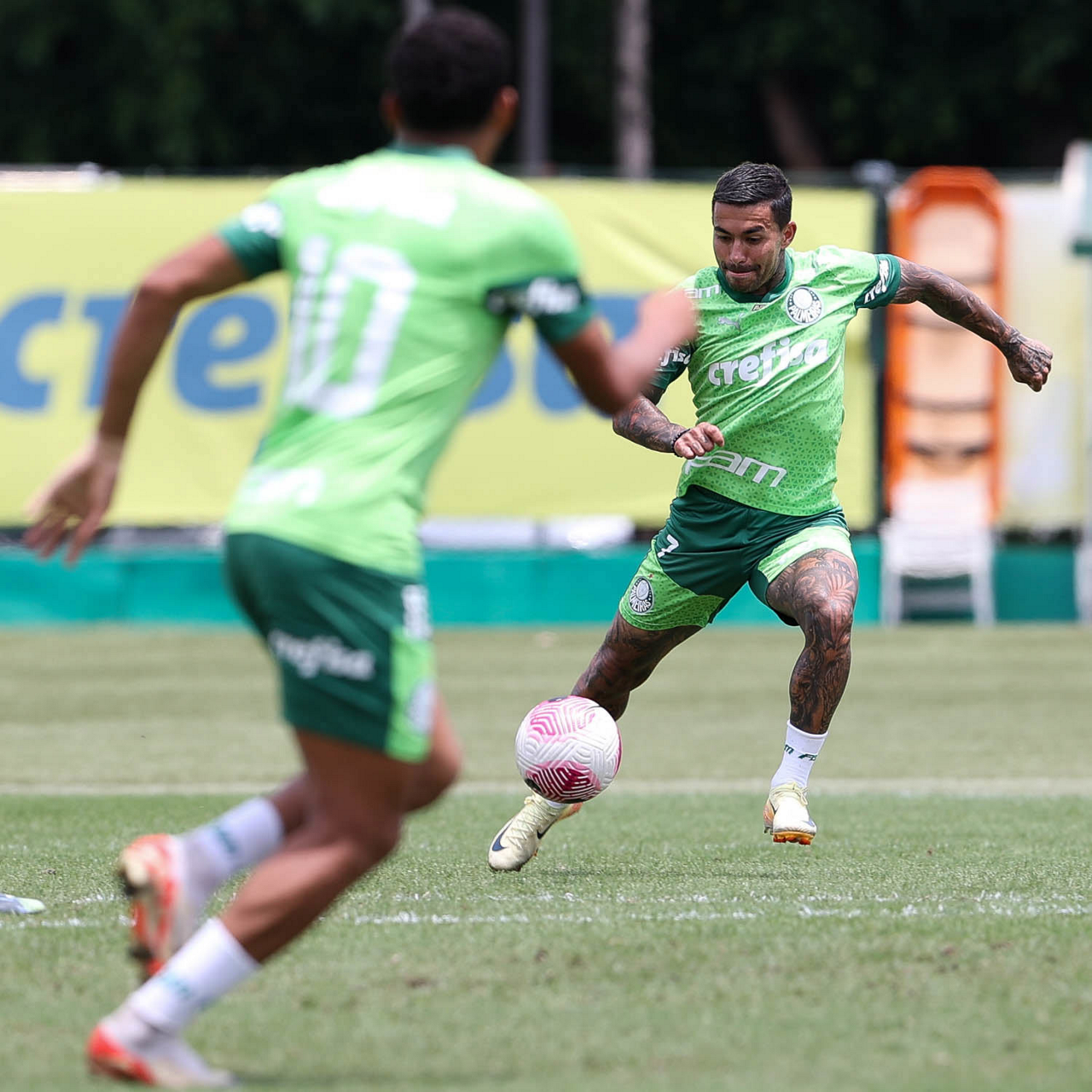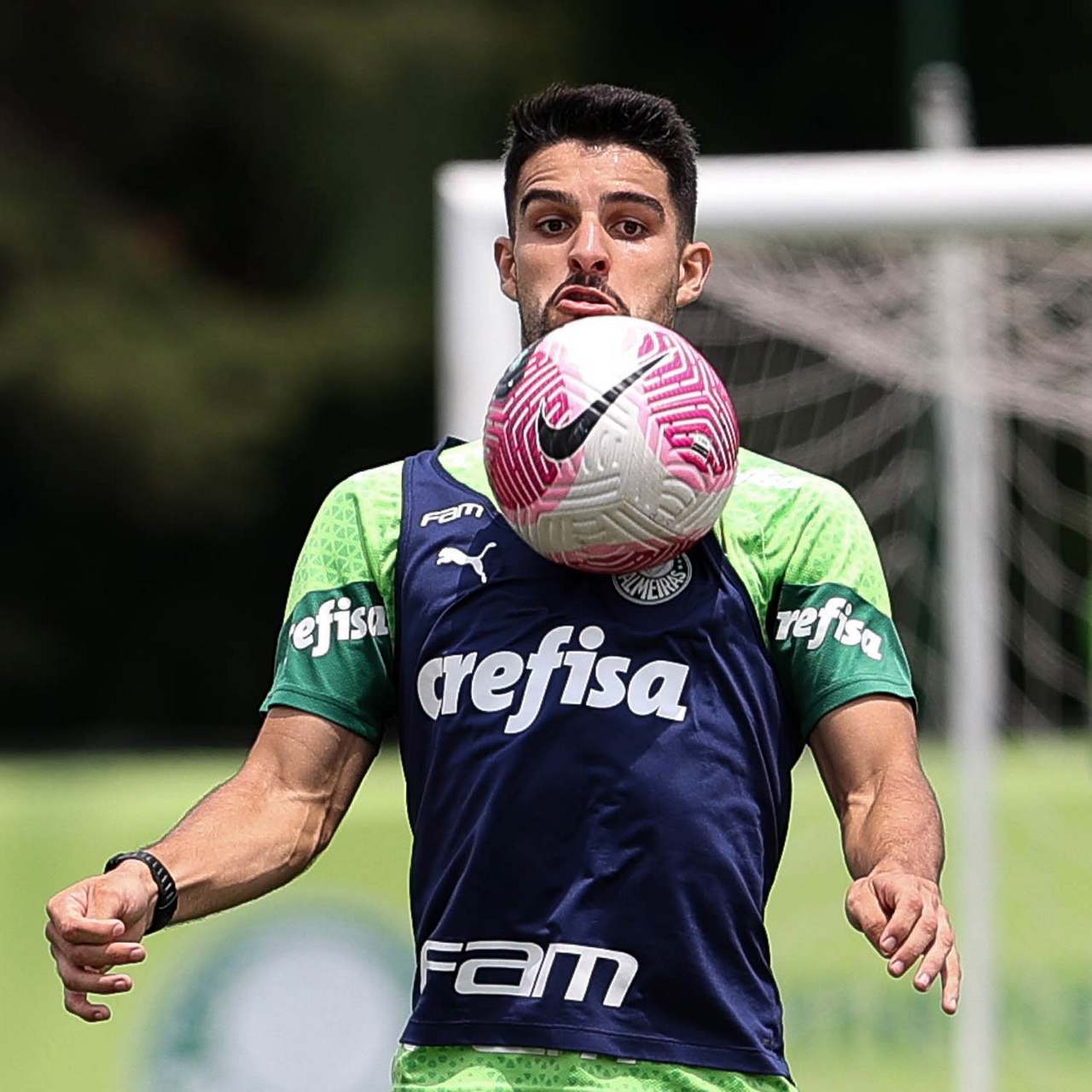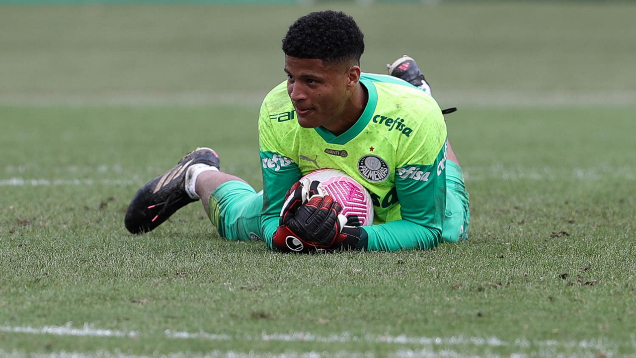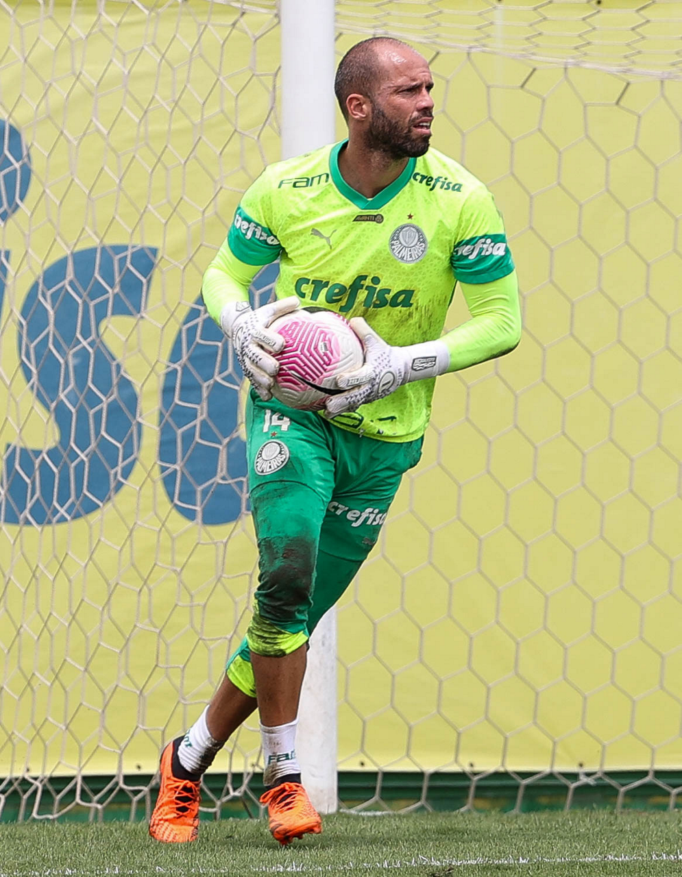 Os jogadores Gustavo Gómez, Vitor Reis, Flaco López, Mateus, Anibal Moreno, Naves, Richard Ríos e Fabinho (E/D em pé) e Agustín Giay, Estêvão, Mauricio, Vanderlan e Weverton (E/D agchados), da SE Palmeiras, durante treinamento, na Academia de Futebol. (Foto: Cesar Greco/Palmeiras/by Canon)