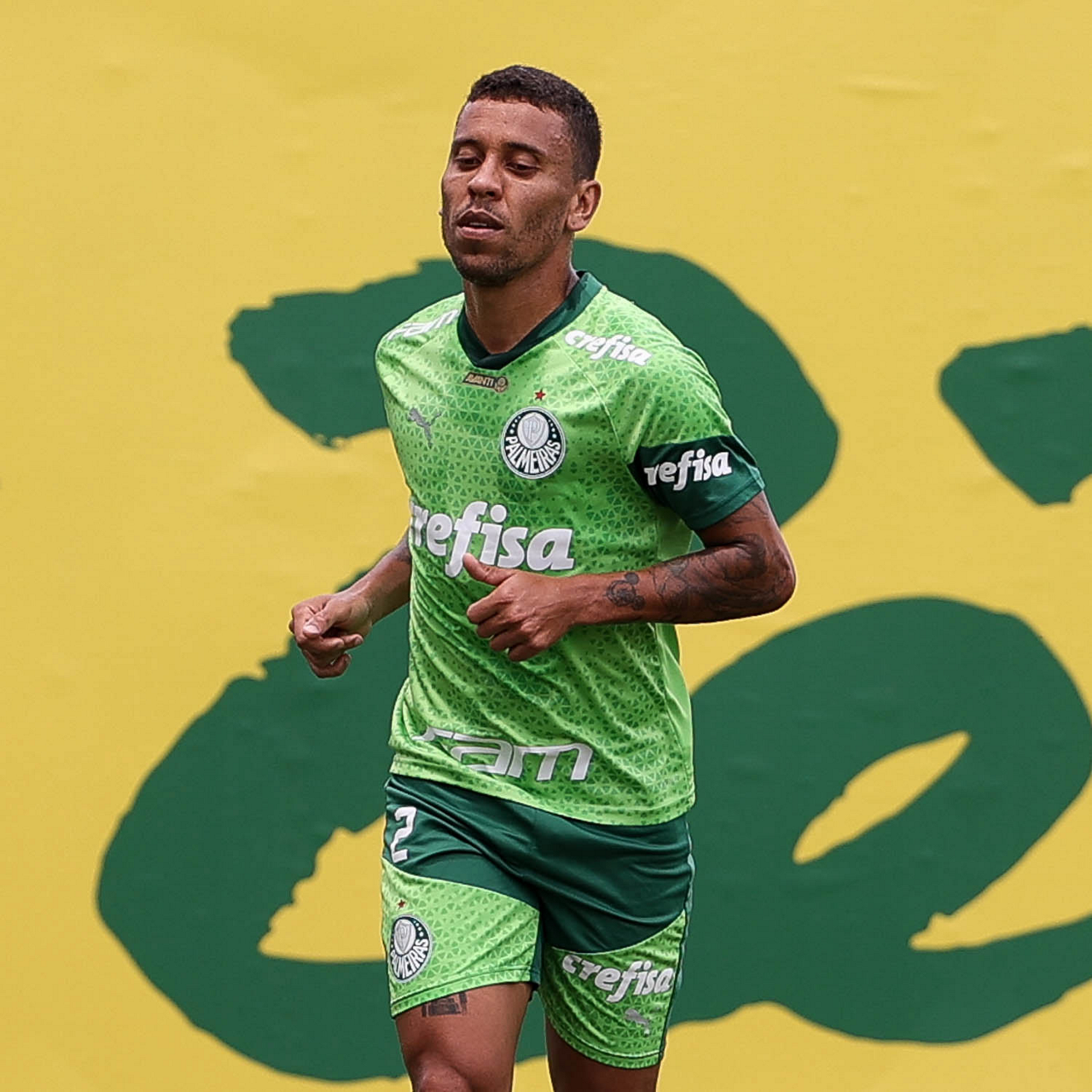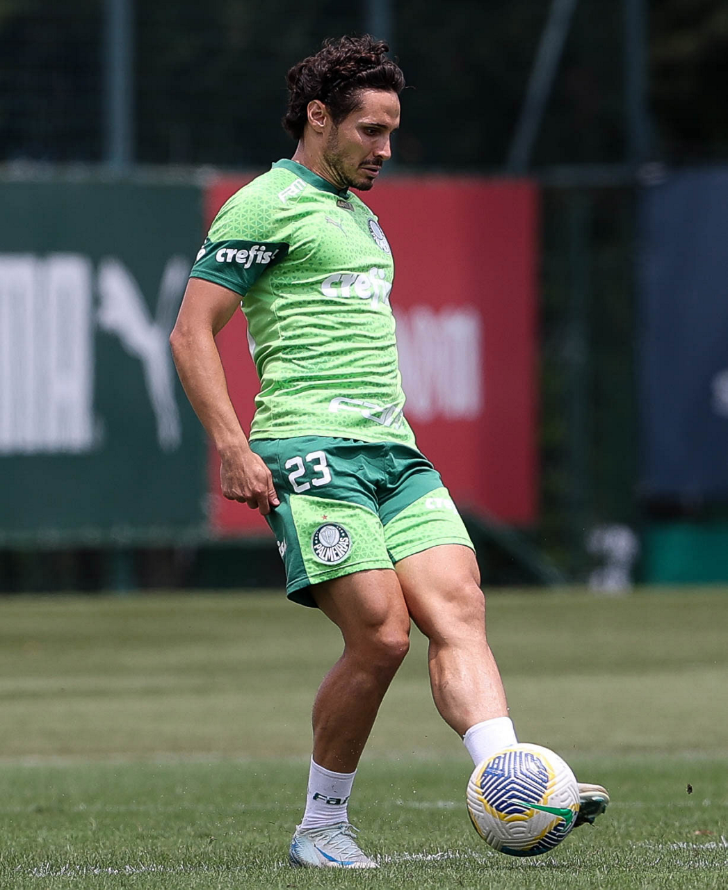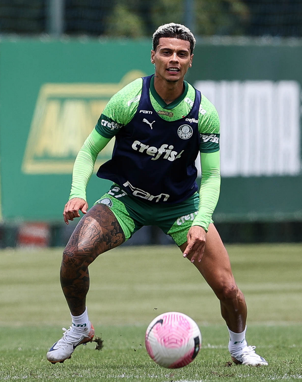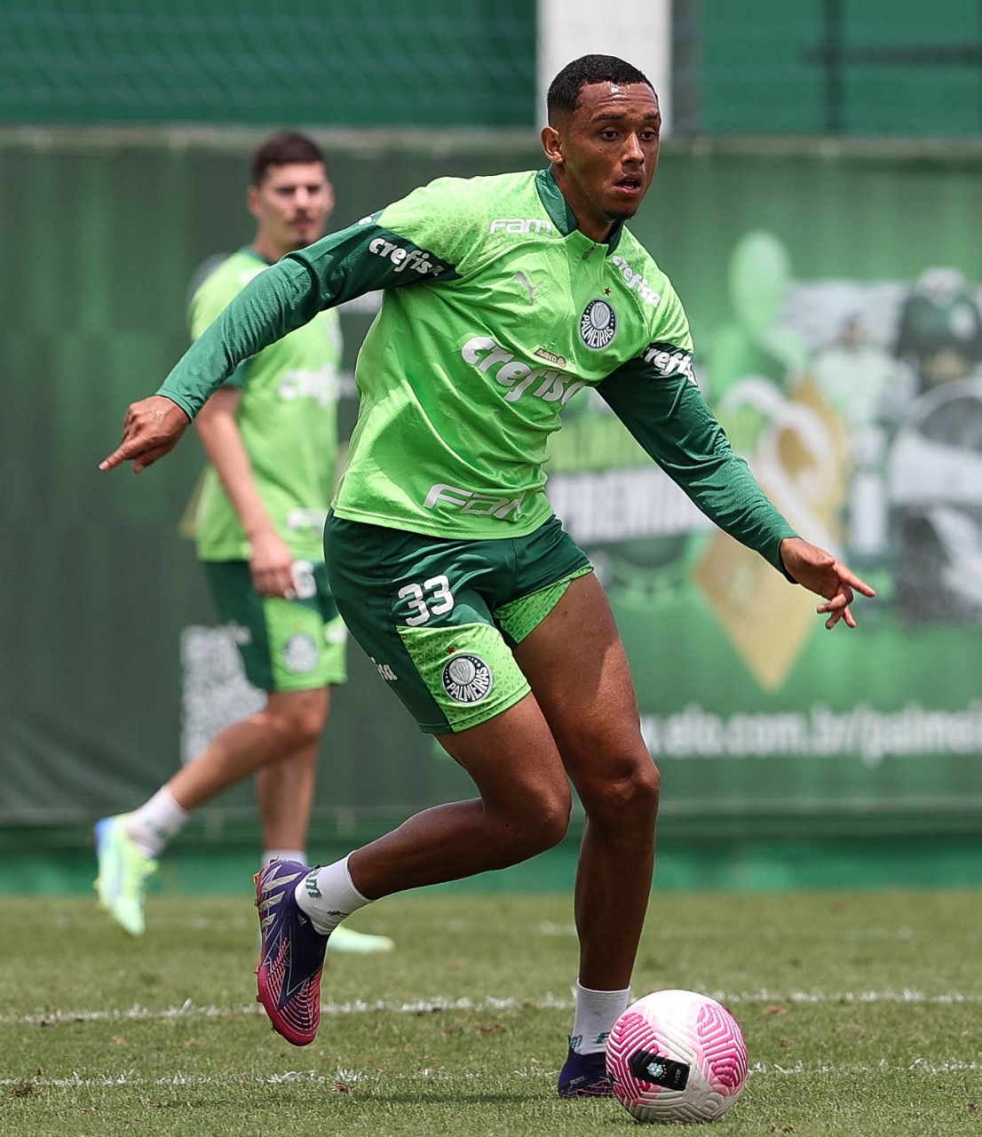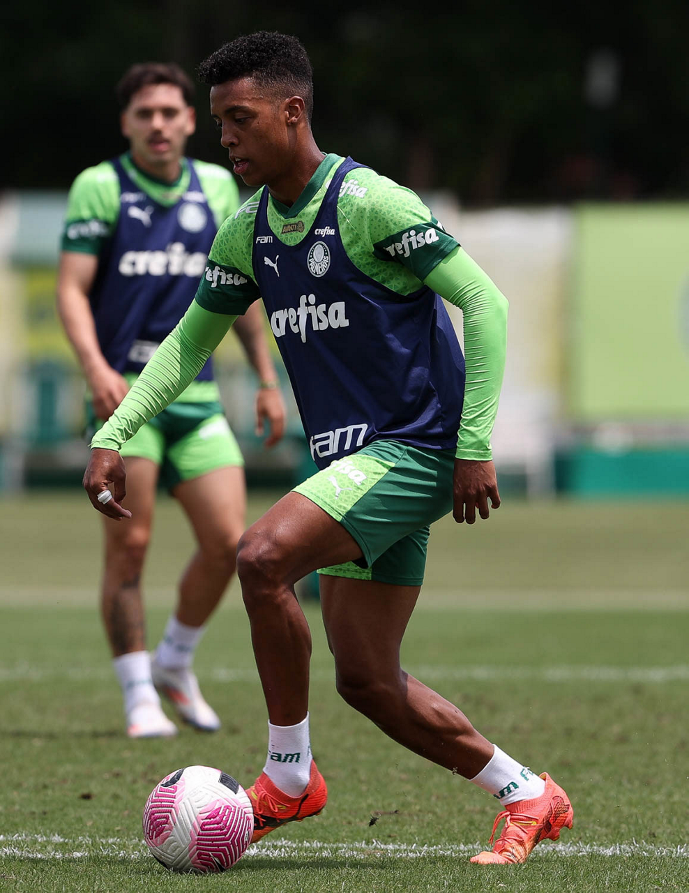 Os jogadores Gustavo Gómez, Vitor Reis, Flaco López, Mateus, Anibal Moreno, Naves, Richard Ríos e Fabinho (E/D em pé) e Agustín Giay, Estêvão, Mauricio, Vanderlan e Weverton (E/D agchados), da SE Palmeiras, durante treinamento, na Academia de Futebol. (Foto: Cesar Greco/Palmeiras/by Canon)