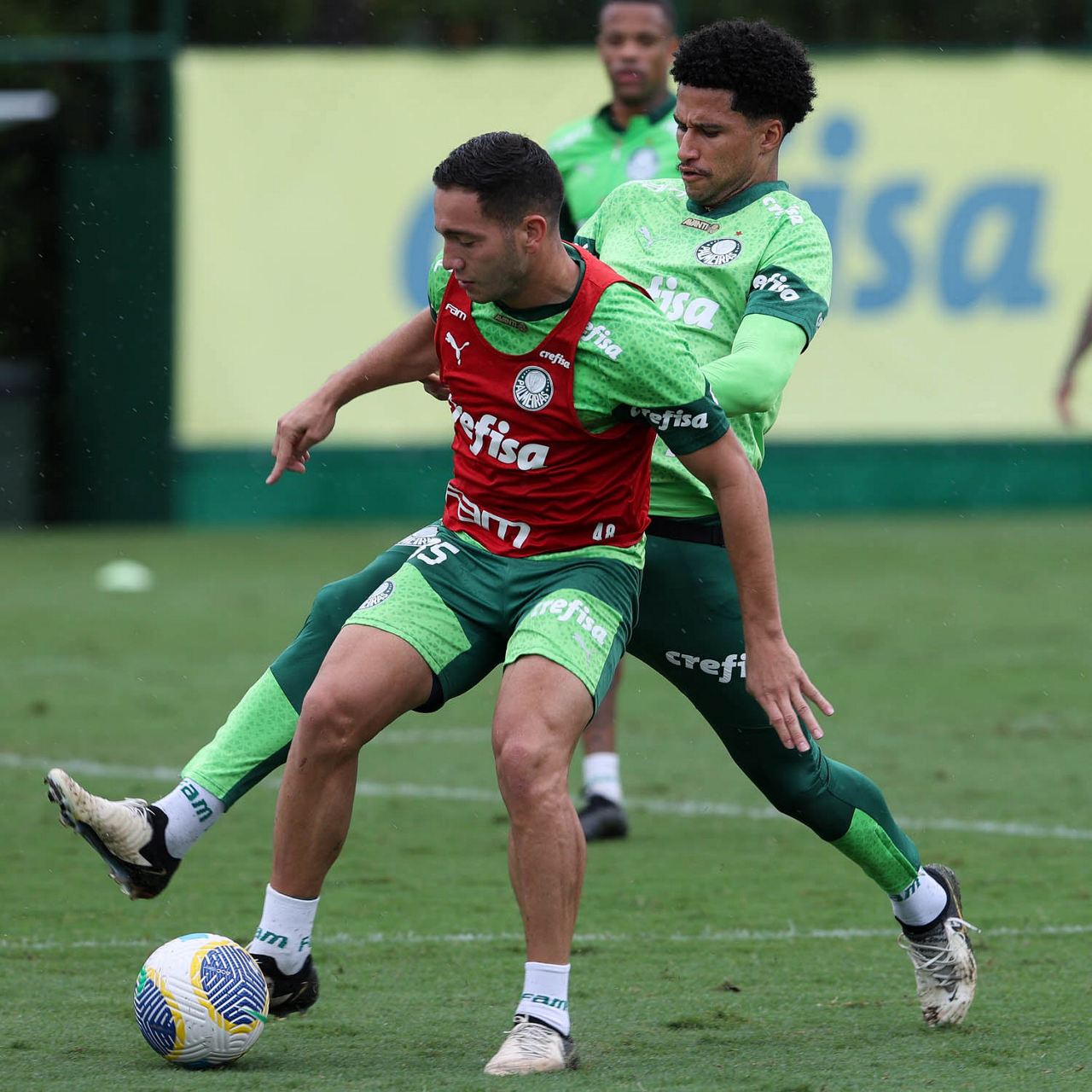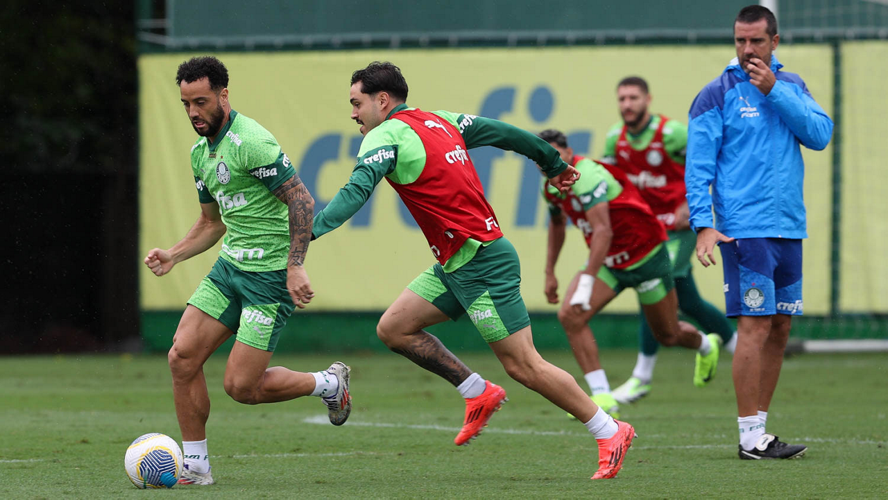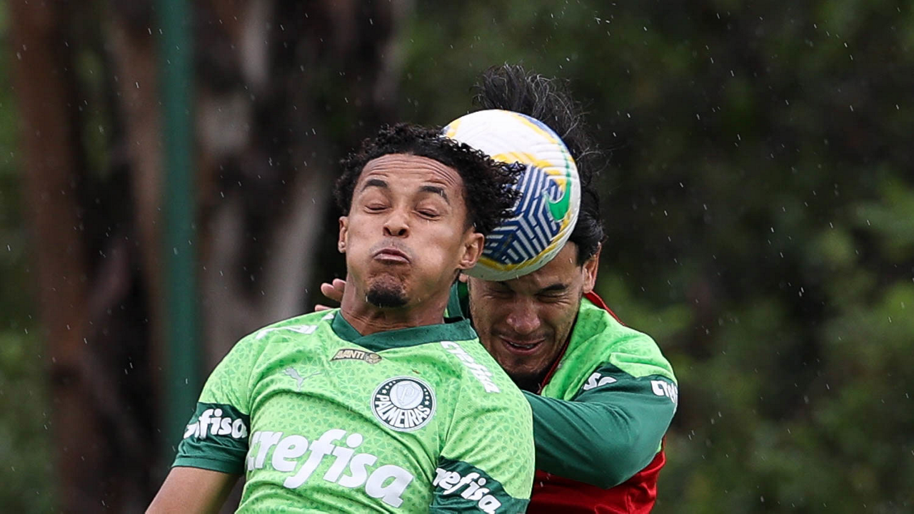 Os jogadores Rômulo e Estêvão (D), da SE Palmeiras, durante treinamento, na Academia de Futebol. (Foto: Cesar Greco/Palmeiras/by Canon)