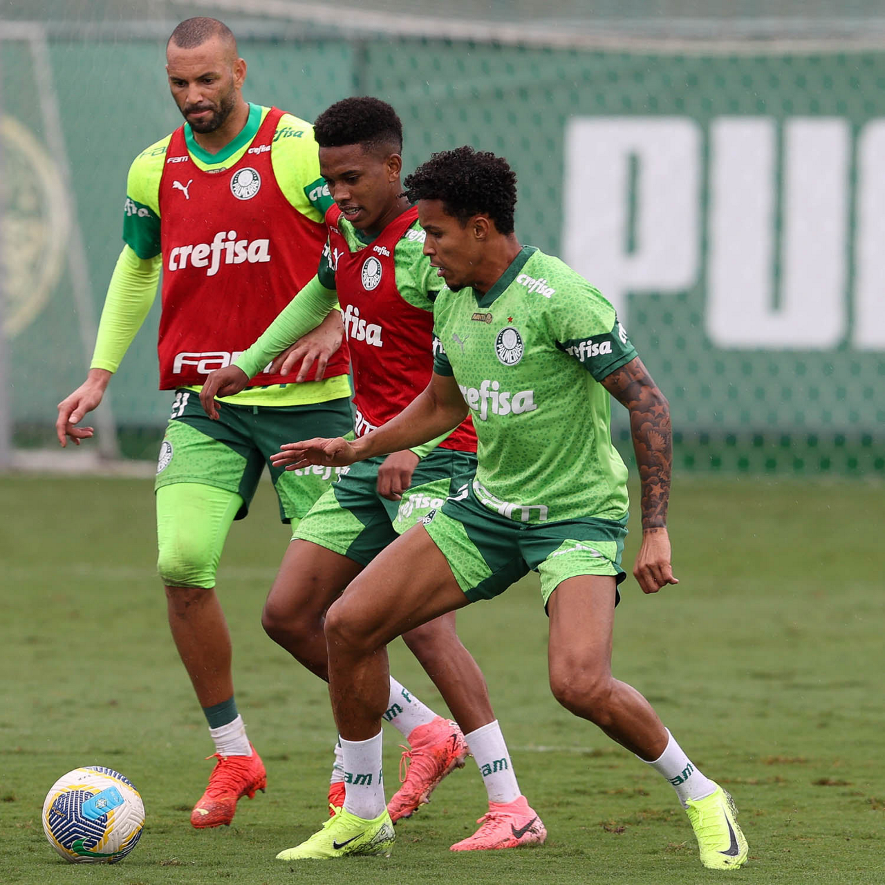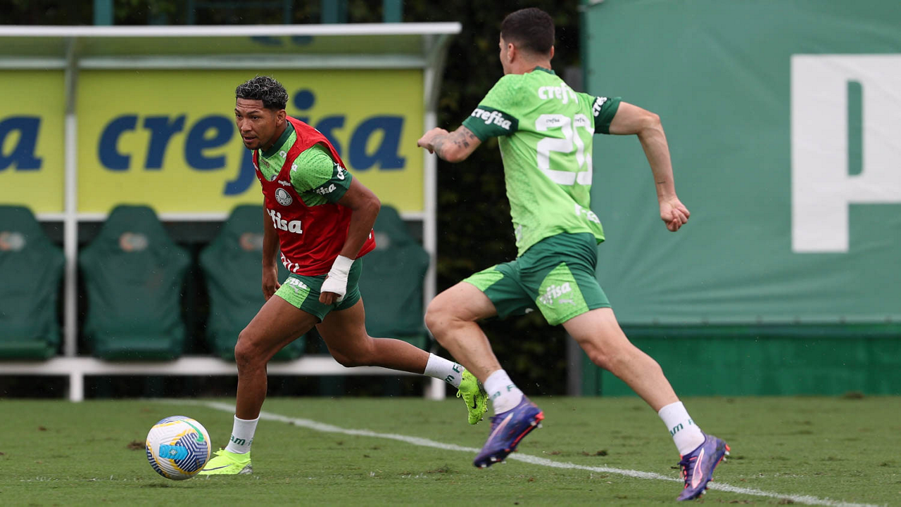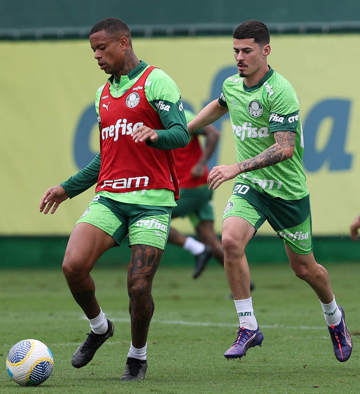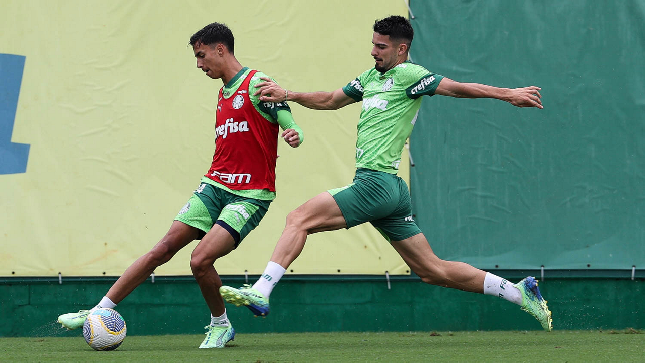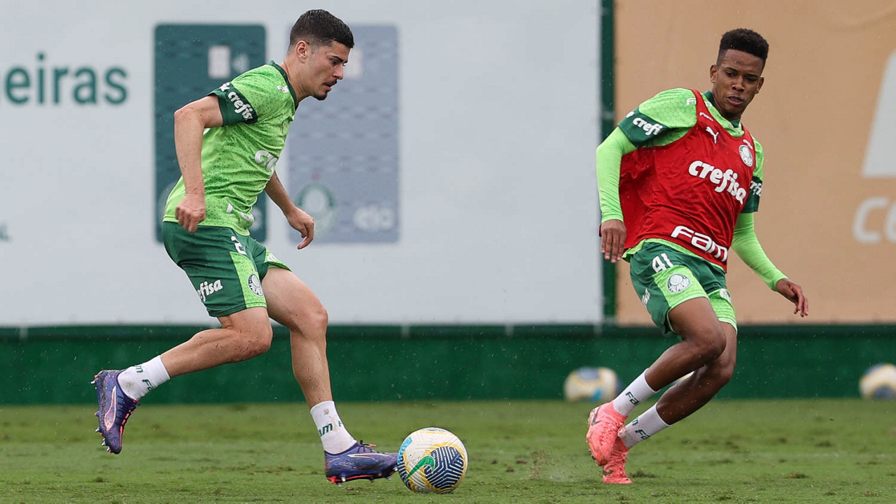 Os jogadores Lázaro e Estêvão (D), da SE Palmeiras, durante treinamento, na Academia de Futebol. (Foto: Cesar Greco/Palmeiras/by Canon)