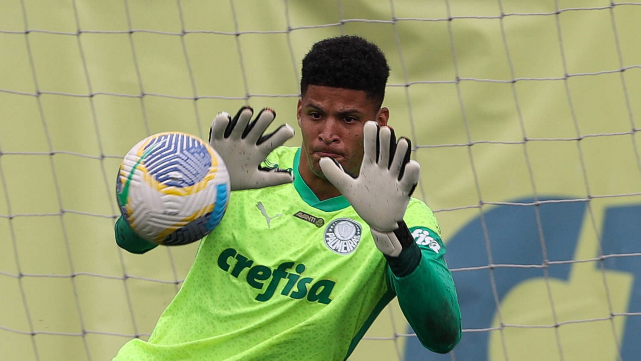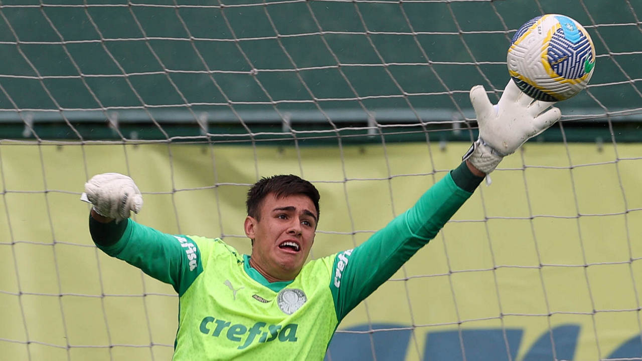 O goleiro Mateus, da SE Palmeiras, durante treinamento, na Academia de Futebol. (Foto: Cesar Greco/Palmeiras/by Canon)