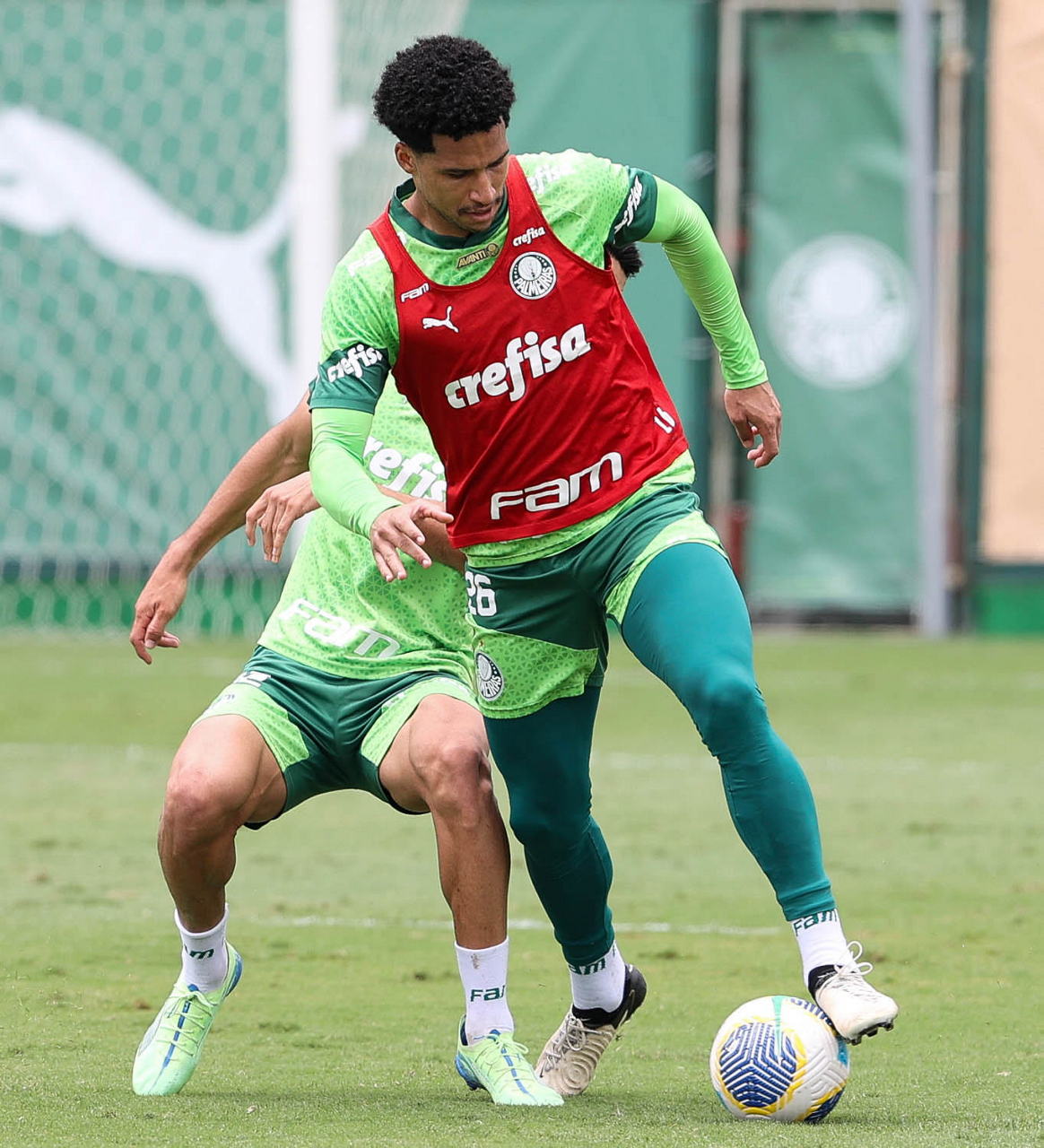 Os jogadores Vitor Reis e Raphael Veiga (D), da SE Palmeiras, durante treinamento, na Academia de Futebol. (Foto: Cesar Greco/Palmeiras/by Canon)