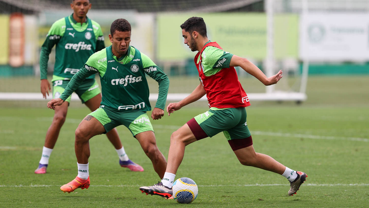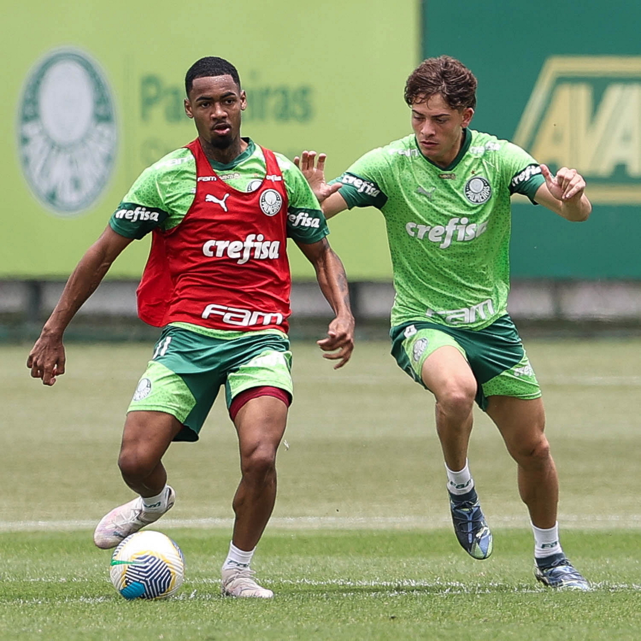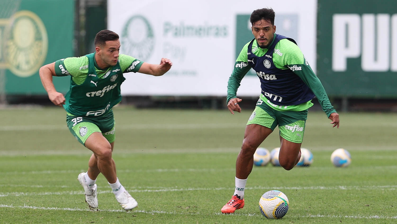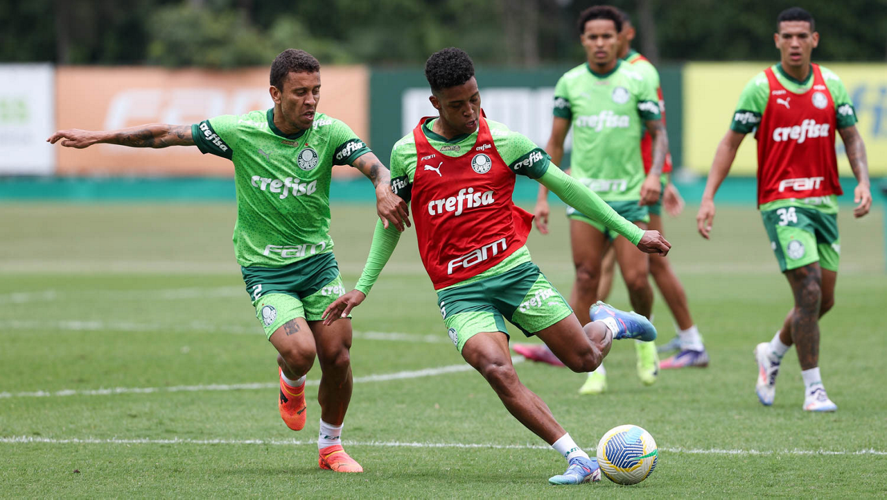 Os jogadores Vitor Reis e Gabriel Menino (D), da SE Palmeiras, durante treinamento, na Academia de Futebol. (Foto: Cesar Greco/Palmeiras/by Canon)