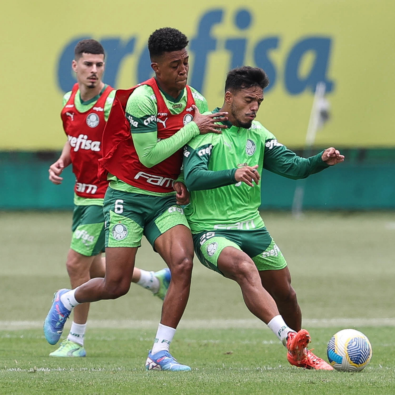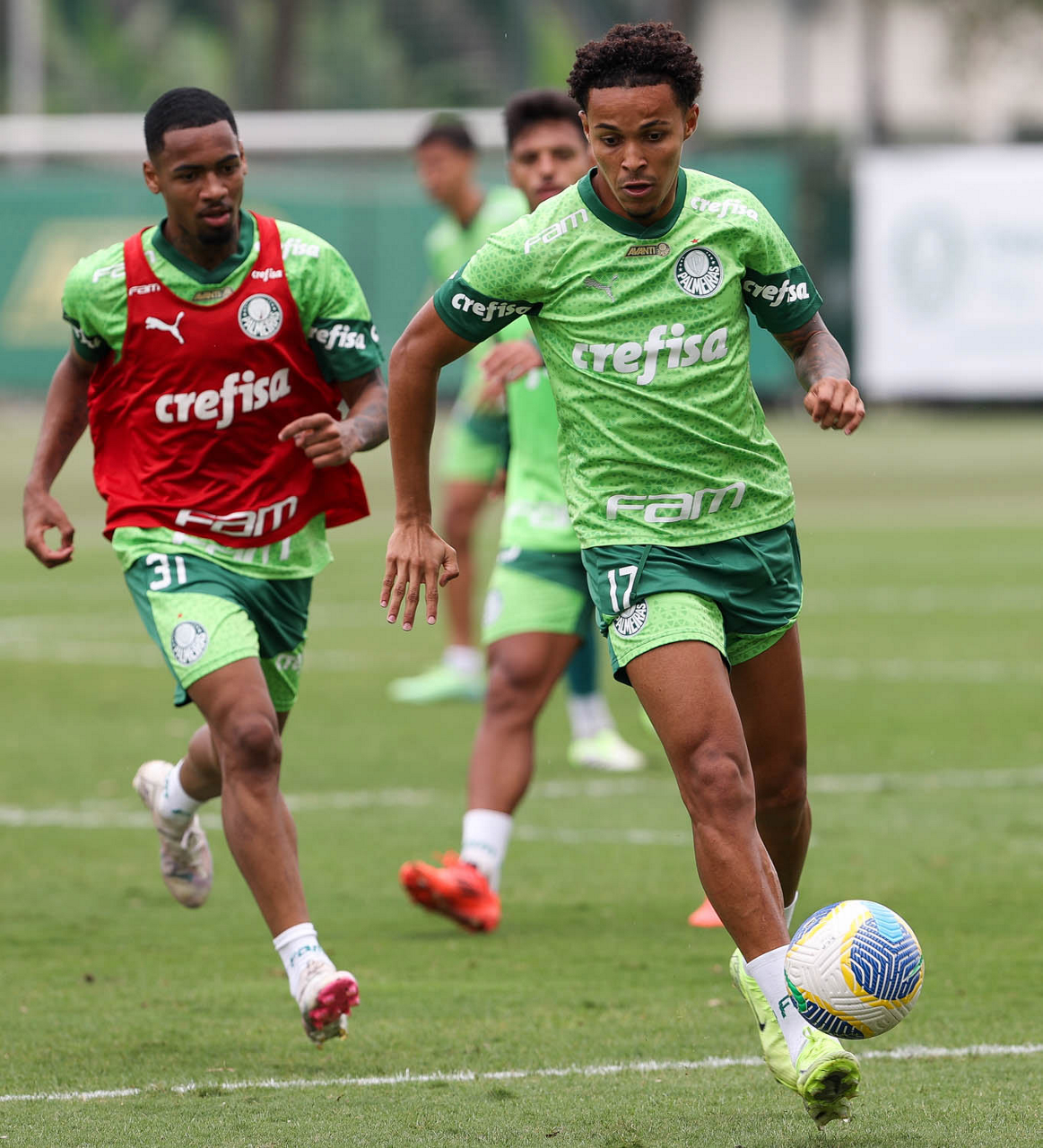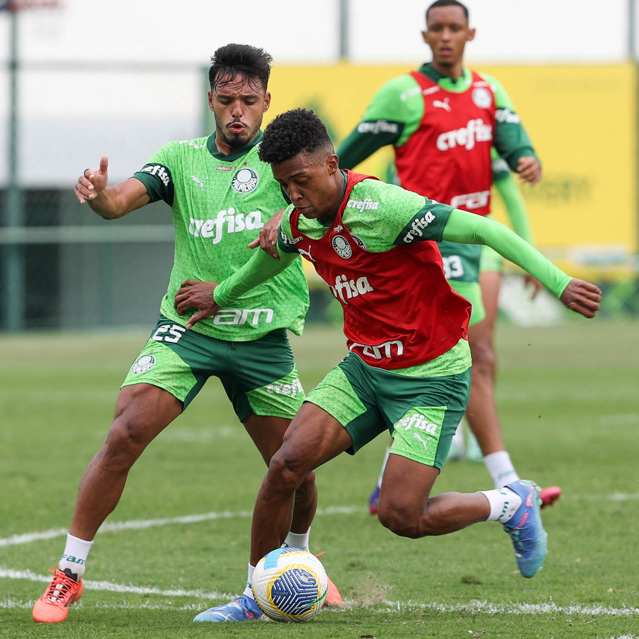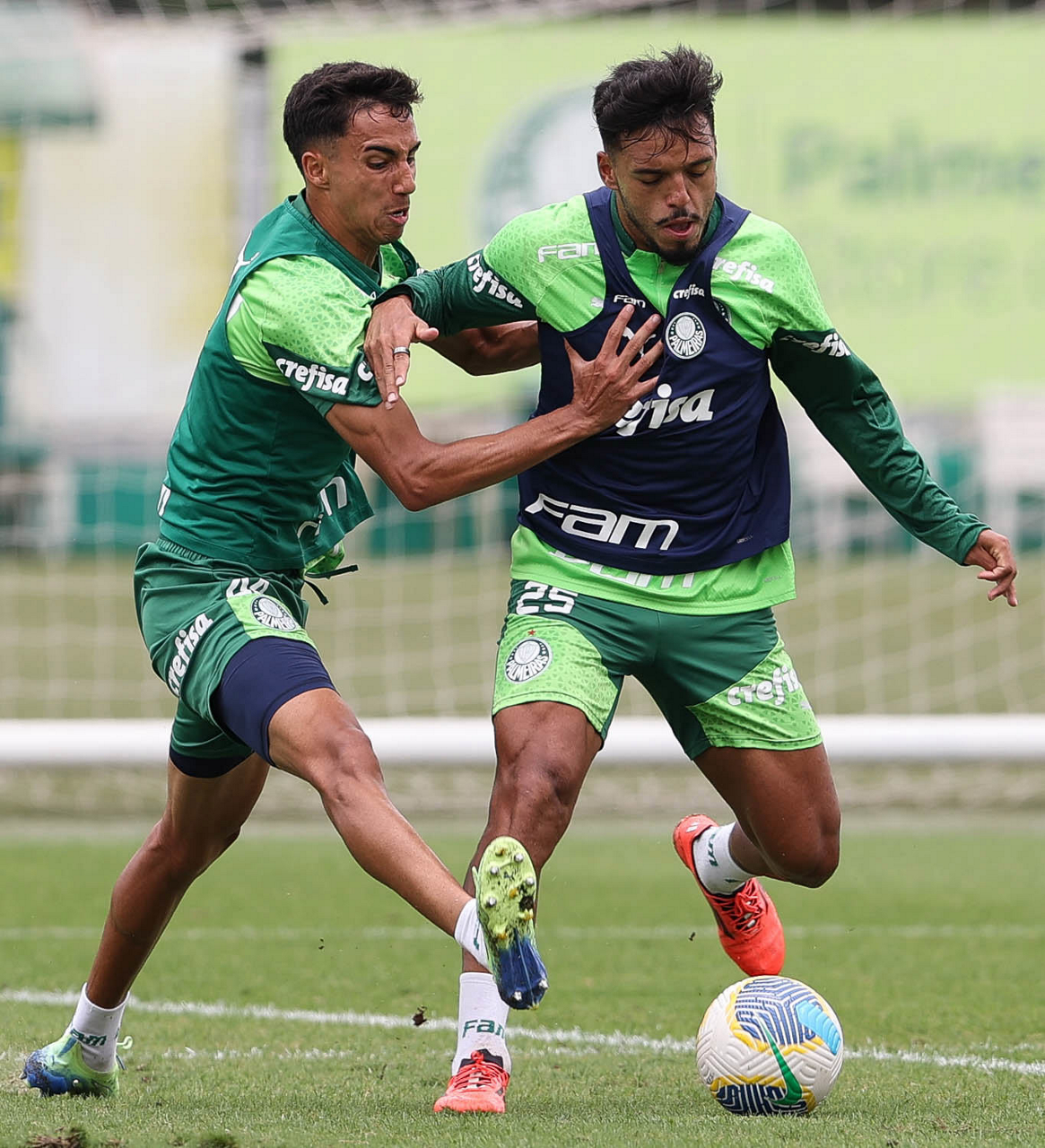 Os jogadores Vitor Reis e Gabriel Menino (D), da SE Palmeiras, durante treinamento, na Academia de Futebol. (Foto: Cesar Greco/Palmeiras/by Canon)