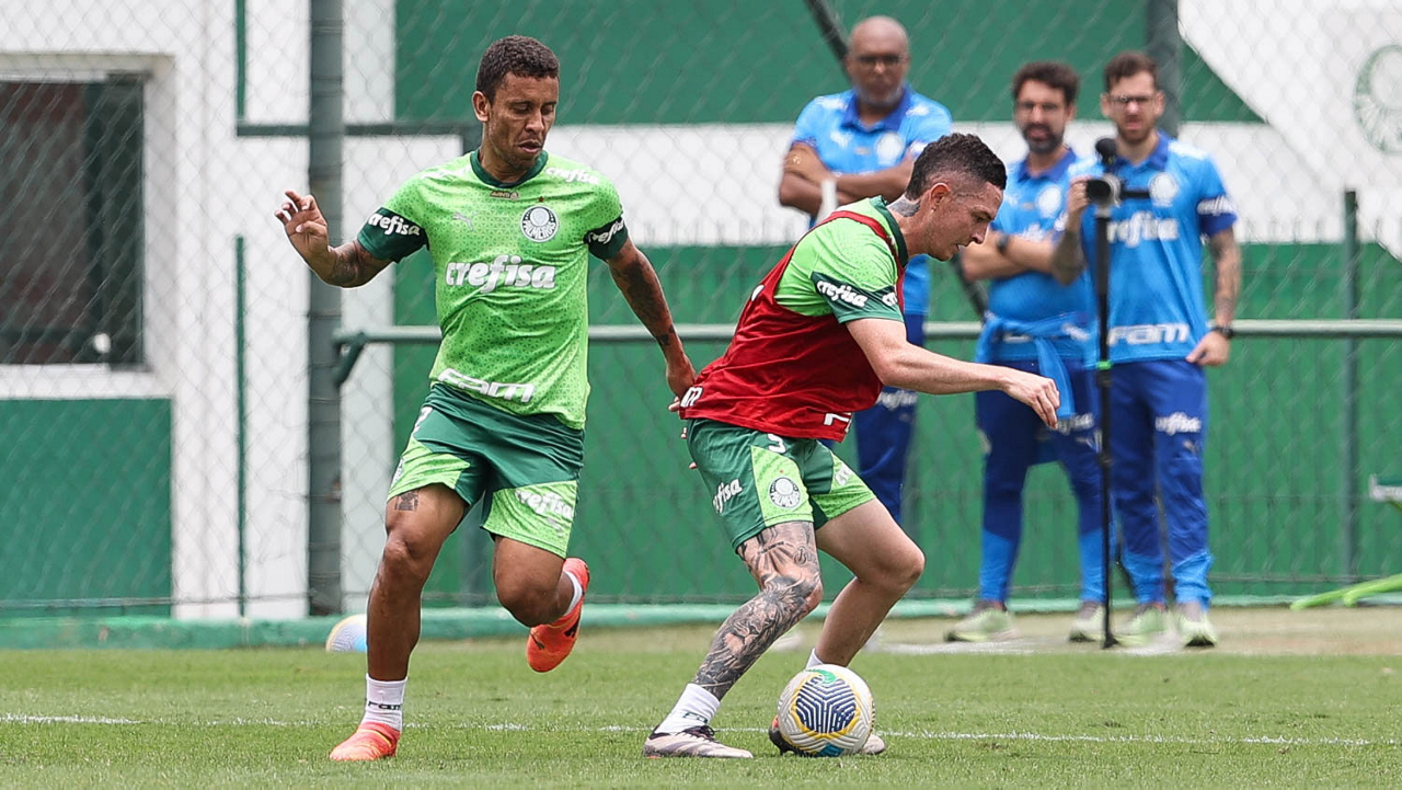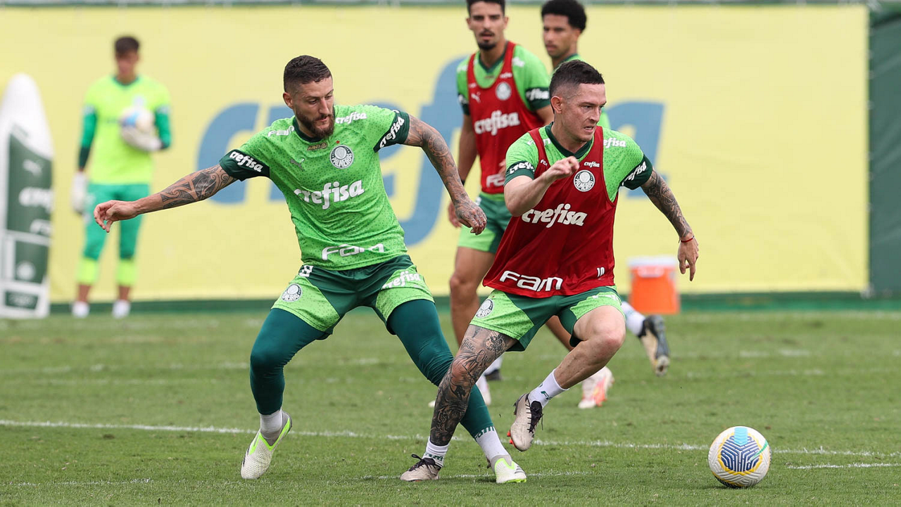 Os jogadores Zé Rafael e Flaco López (D), da SE Palmeiras, durante treinamento, na Academia de Futebol. (Foto: Cesar Greco/Palmeiras/by Canon)