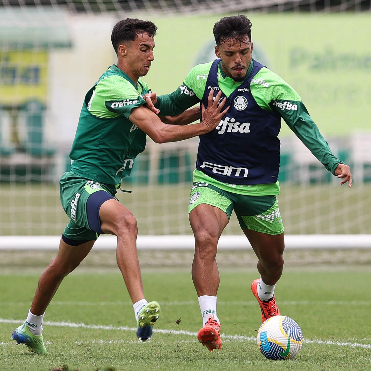 Os jogadores Fabinho e Gabriel Menino (D), da SE Palmeiras, durante treinamento, na Academia de Futebol. (Foto: Cesar Greco/Palmeiras/by Canon)