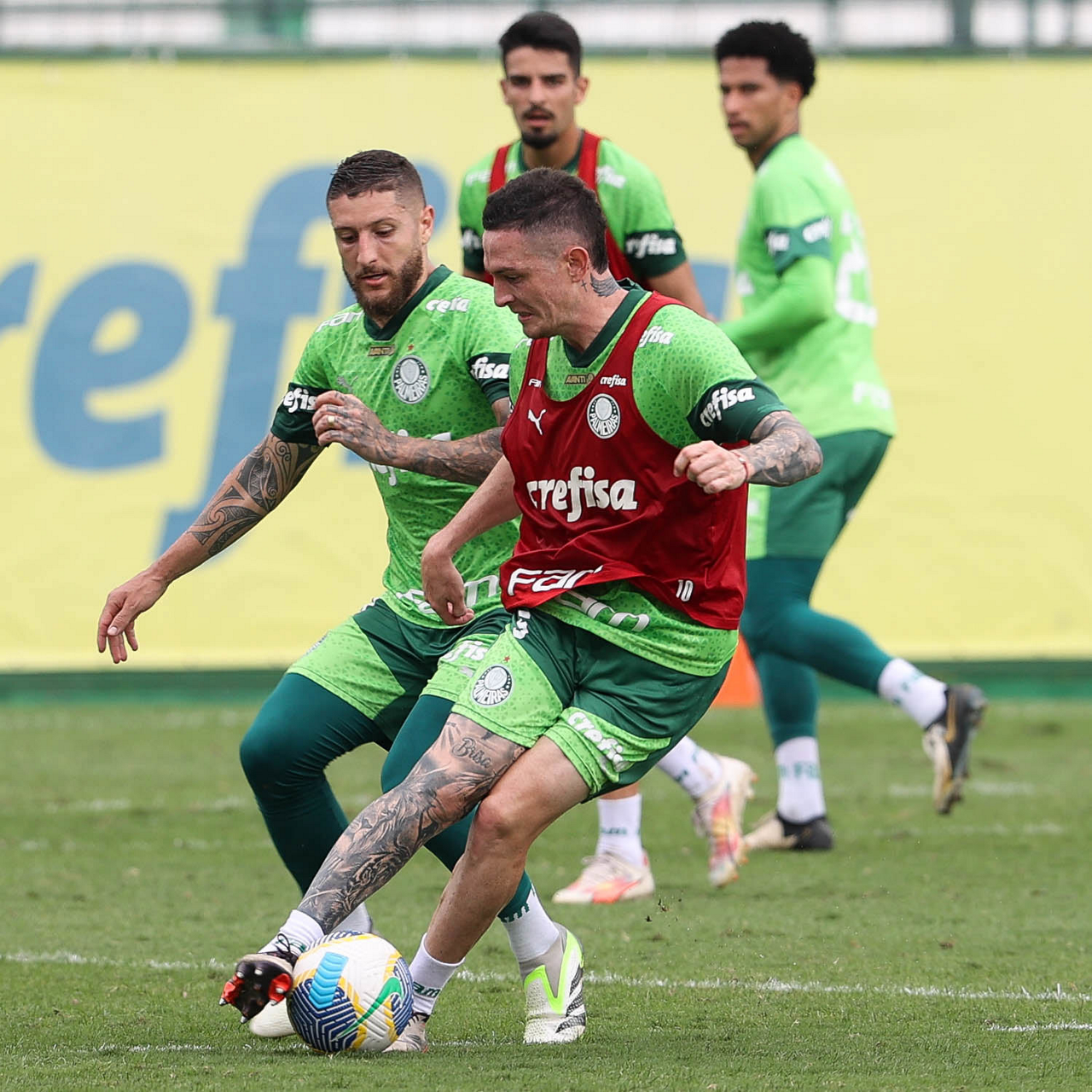 Os jogadores Zé Rafael e Anibal Moreno (D), da SE Palmeiras, durante treinamento, na Academia de Futebol. (Foto: Cesar Greco/Palmeiras/by Canon)