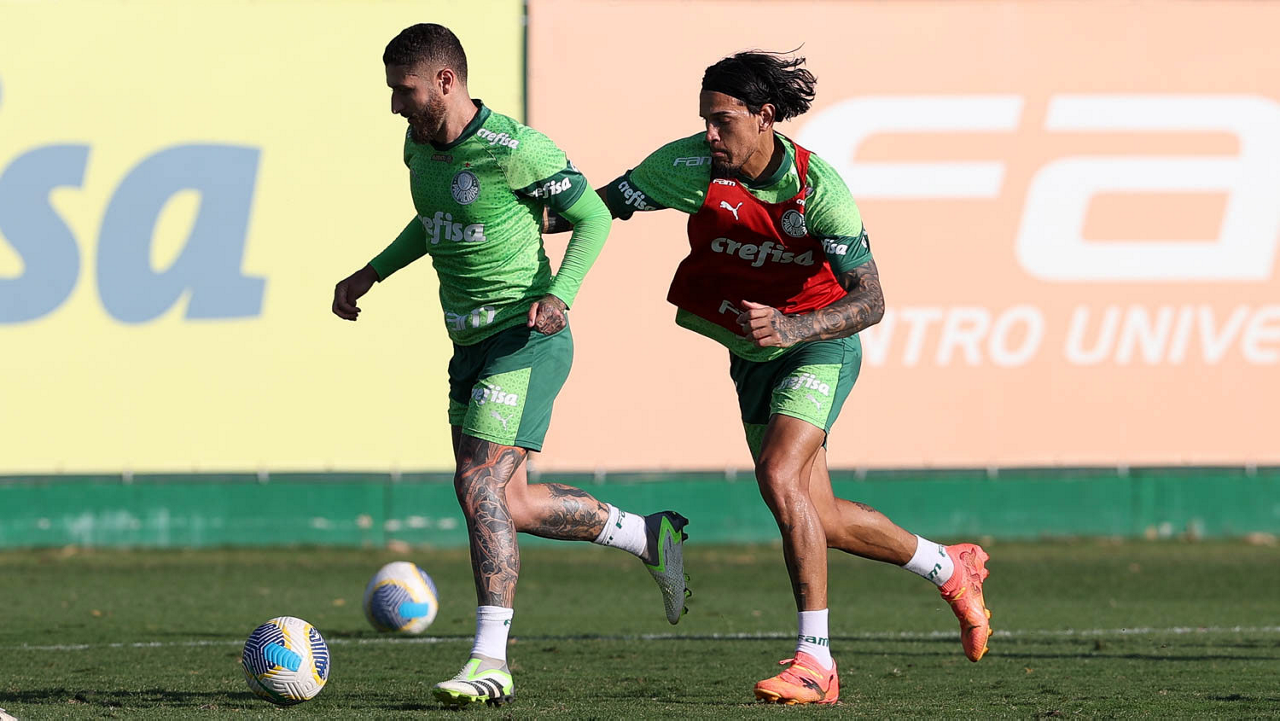 Os jogadores Michel, Anibal Moreno, Vitor Reis, Mateus, Vanderlan, Fabinho, Richard Ríos, Gustavo Gómez e Naves (E/D em pé) e Mauricio, Weverton, Agustín Giay, Estêvão e Flaco López (E/D agachados), da SE Palmeiras, durante treinamento, na Academia de Futebol. (Foto: Cesar Greco/Palmeiras/by Canon)