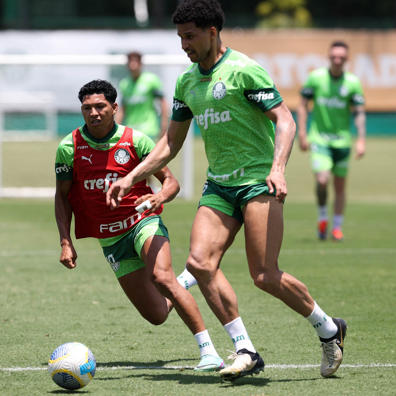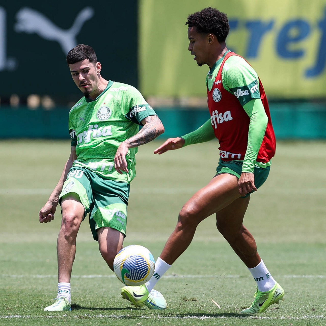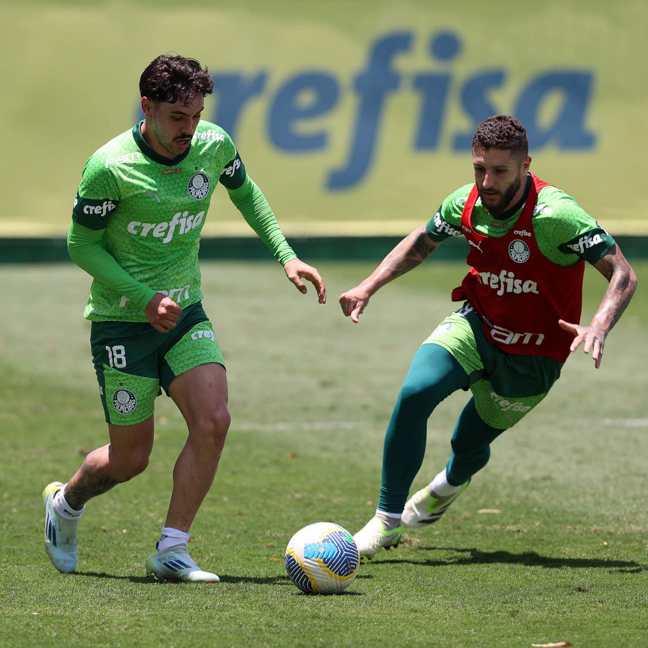 Os jogadores Zé Rafael e Naves (D), da SE Palmeiras, durante treinamento, na Academia de Futebol. (Foto: Cesar Greco/Palmeiras/by Canon)