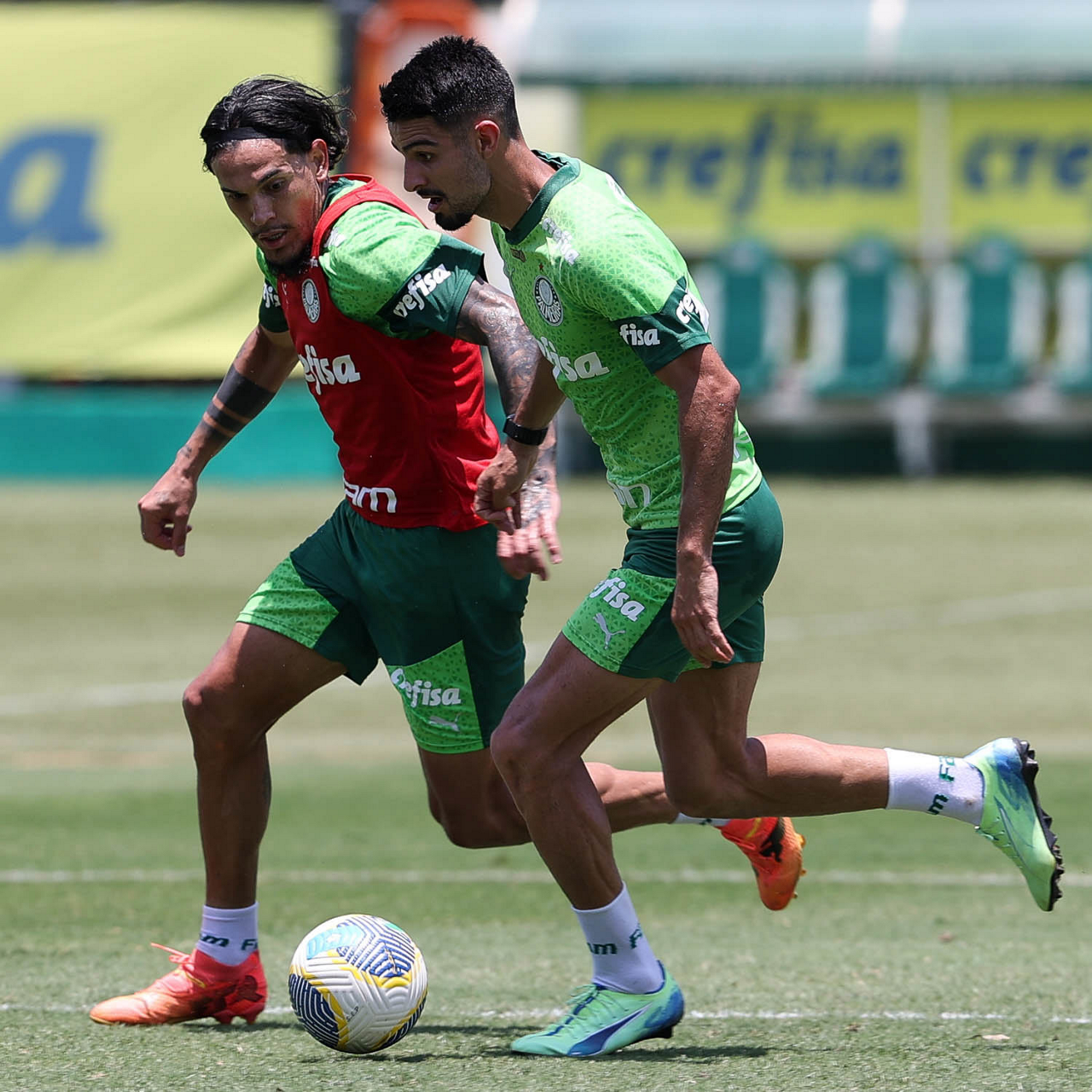Os jogadores Gustavo Gómez e Flaco López (D), da SE Palmeiras, durante treinamento, na Academia de Futebol. (Foto: Cesar Greco/Palmeiras/by Canon)